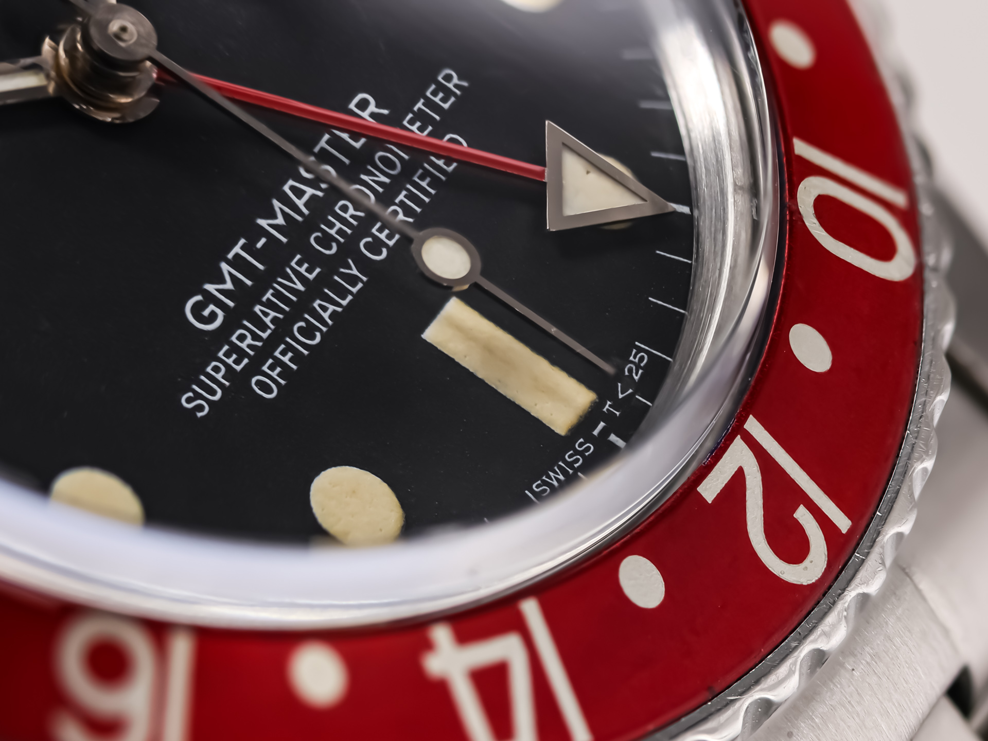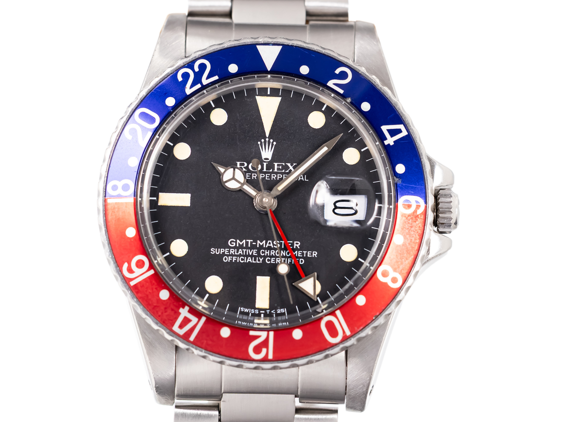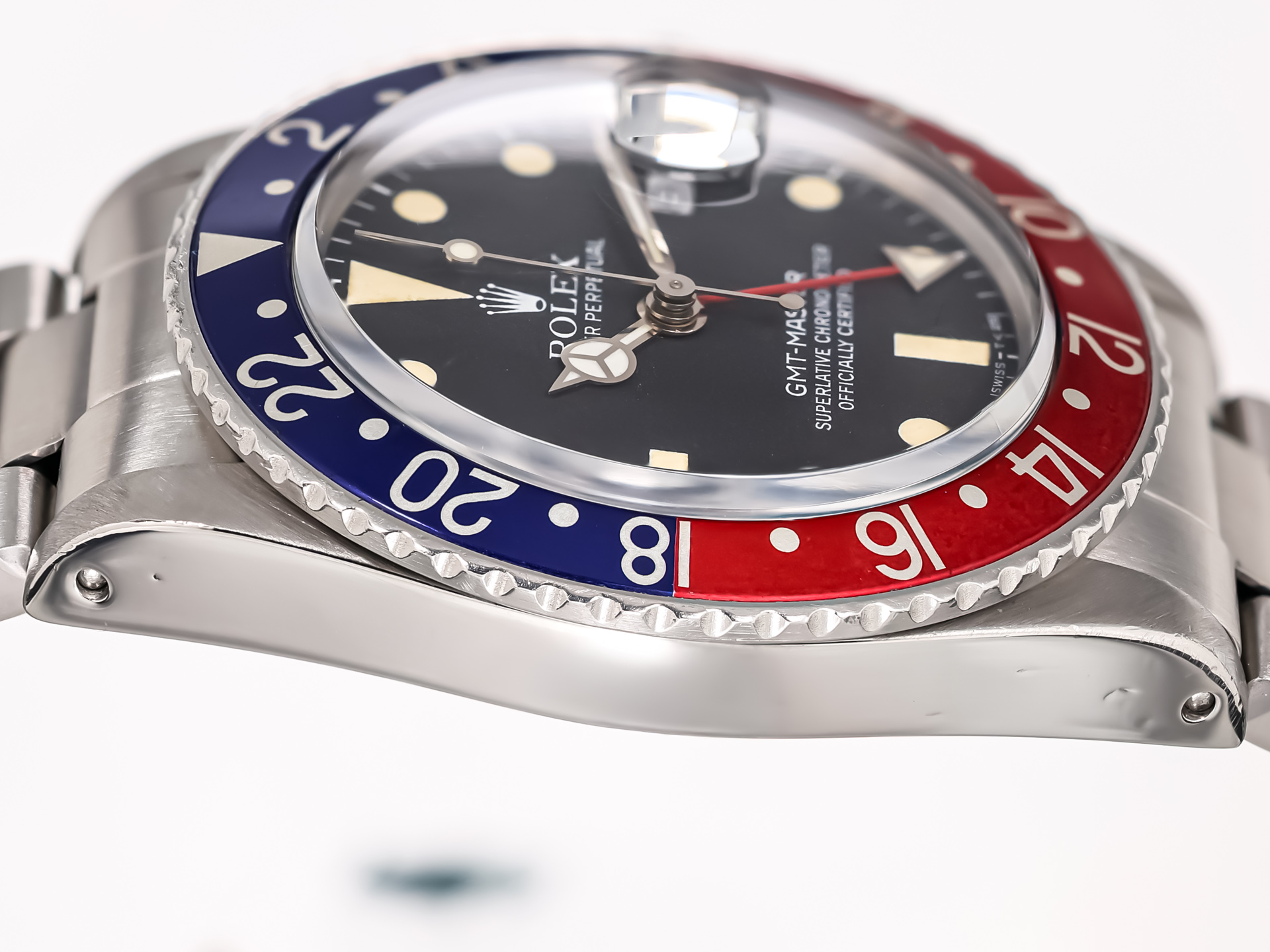 Housed in a robust 40mm stainless steel Oyster case with sharp lugs and well-preserved chamfers, this GMT-Master features a black glossy Tritium dial with white gold-surrounded hour markers, providing legibility and vintage character.