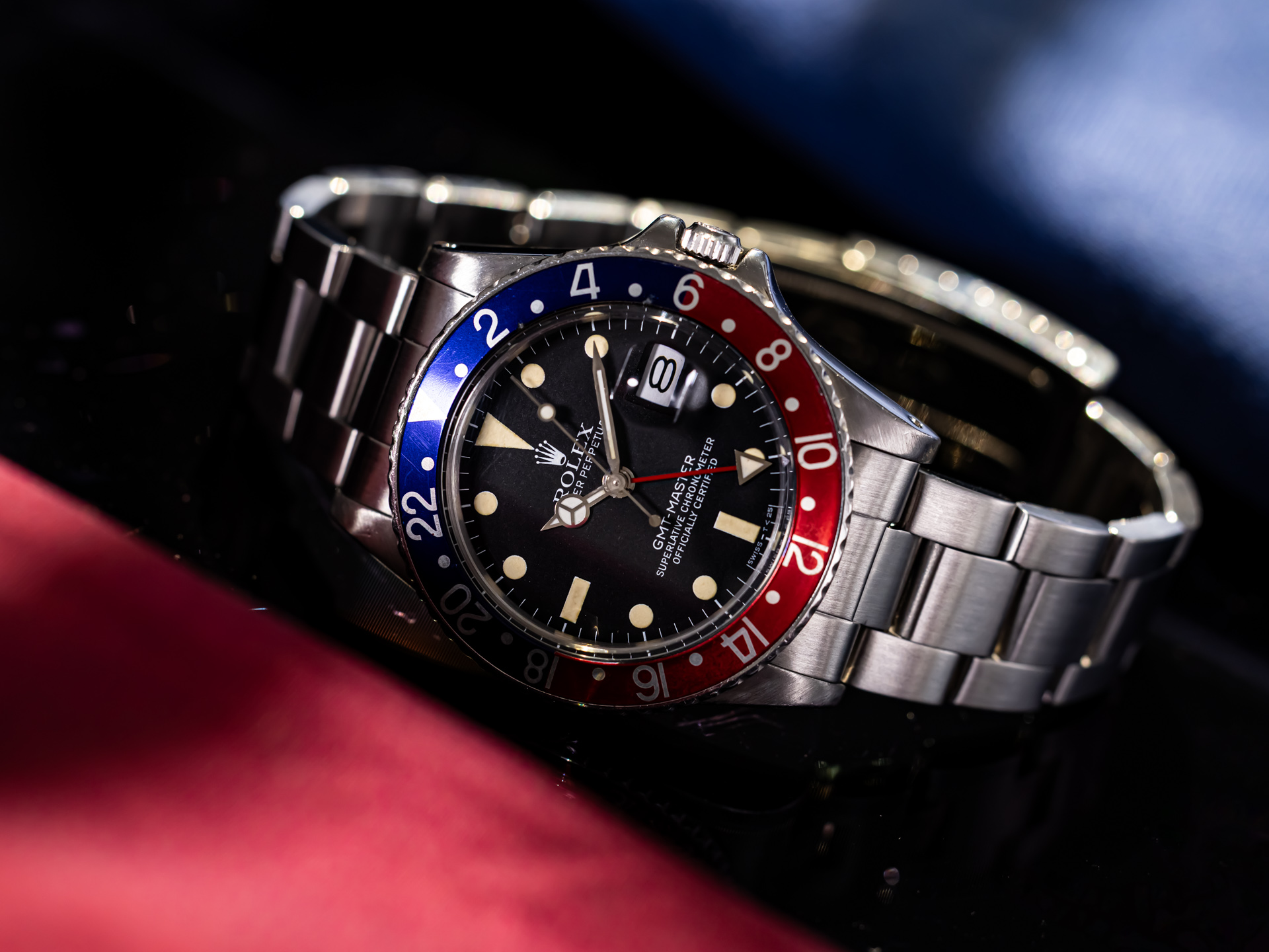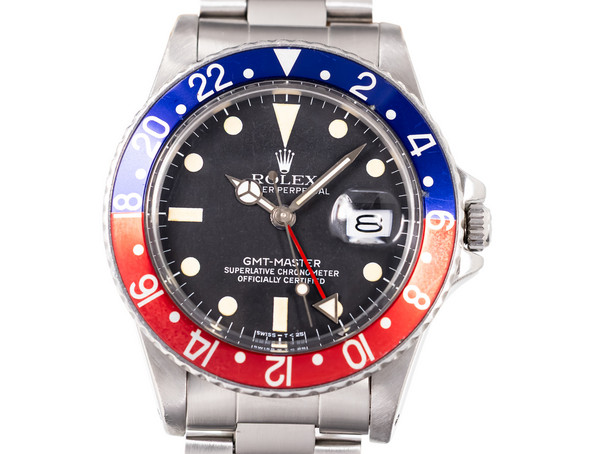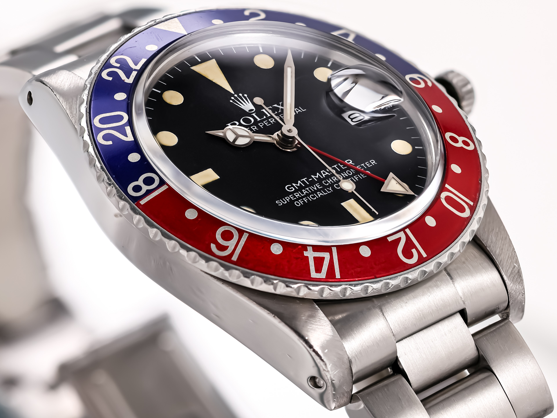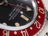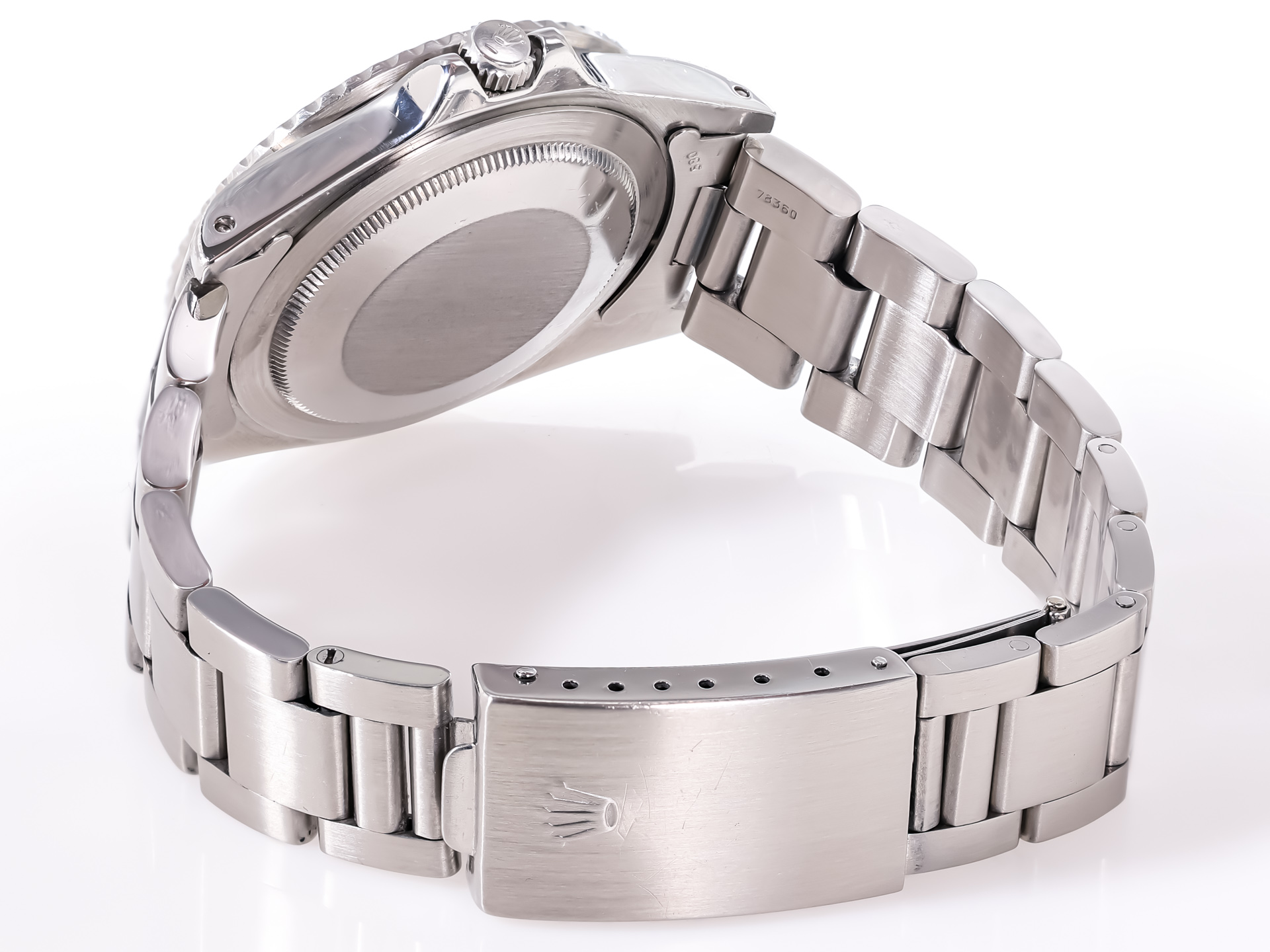 Housed in a robust 40mm stainless steel Oyster case with sharp lugs and well-preserved chamfers, this GMT-Master features a black glossy Tritium dial with white gold-surrounded hour markers, providing legibility and vintage character.