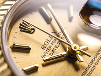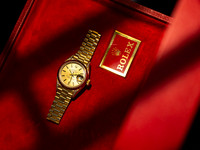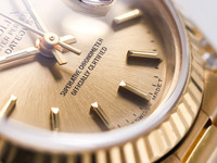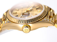The champagne dial features applied gold hour markers and gold hands, complemented by the iconic Cyclops lens over the date window at 3 o’clock. Clean, balanced, and unmistakably Rolex, the dial offers perfect legibility and enduring style.