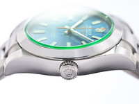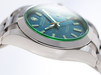 The green sapphire crystal, unique to the Milgauss, adds a subtle emerald halo that further enhances the dial’s depth and color—a signature feature unavailable on any other Rolex reference. Combined with the robust 40mm Oyster case, polished bezel, and Oyster bracelet, the watch offers a perfect blend of scientific heritage and modern sophistication.