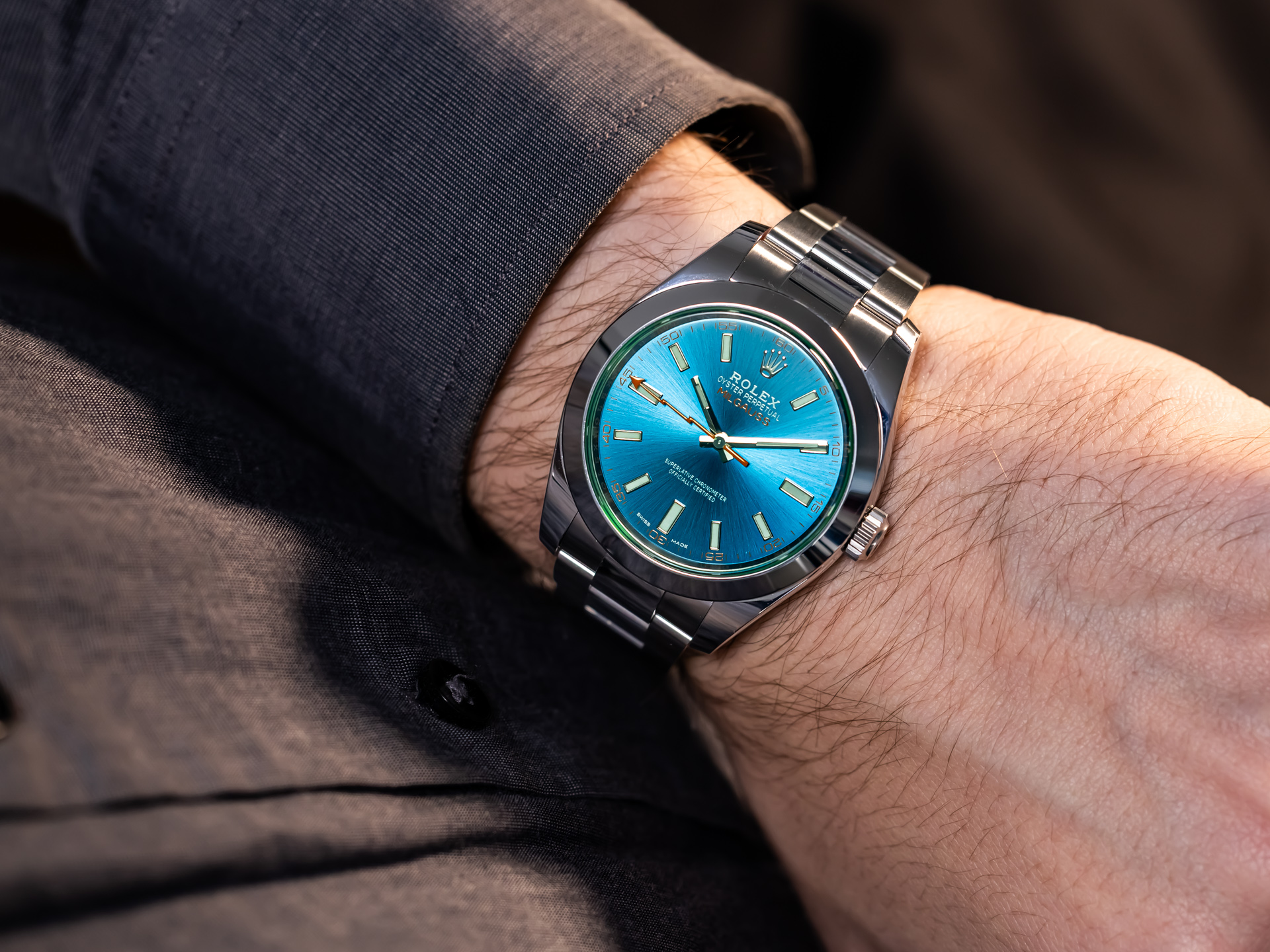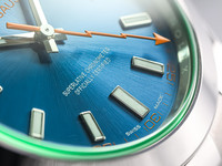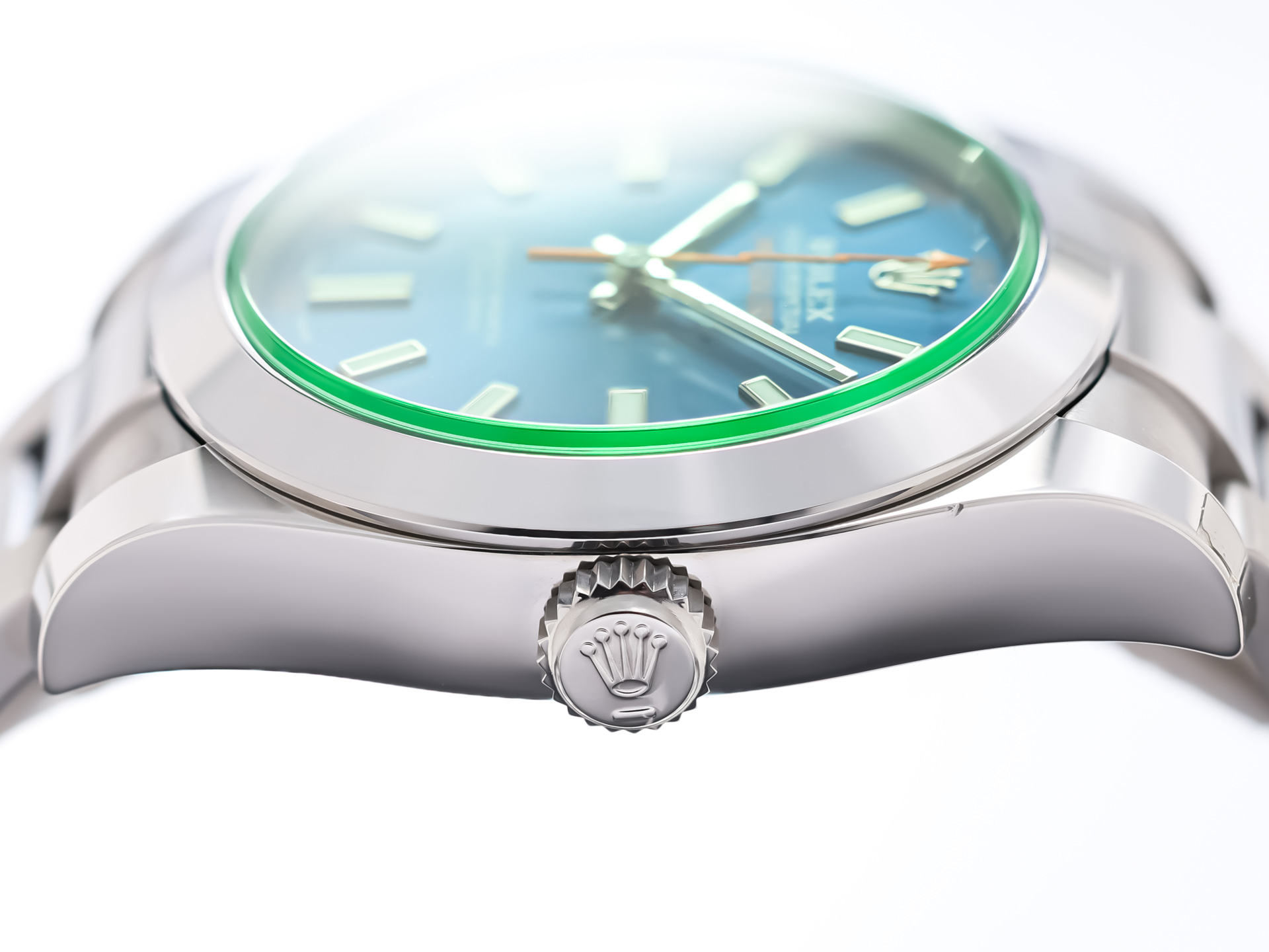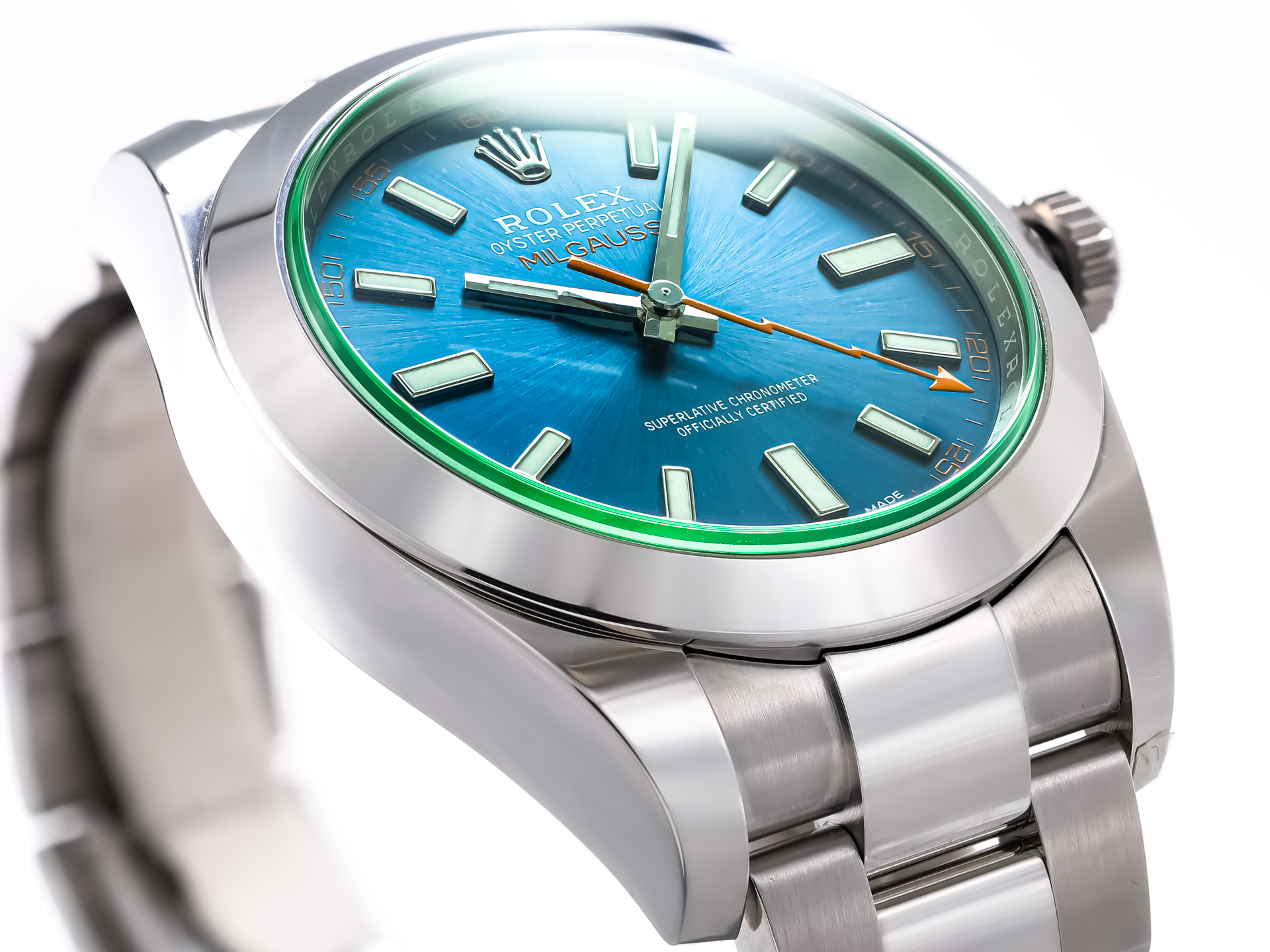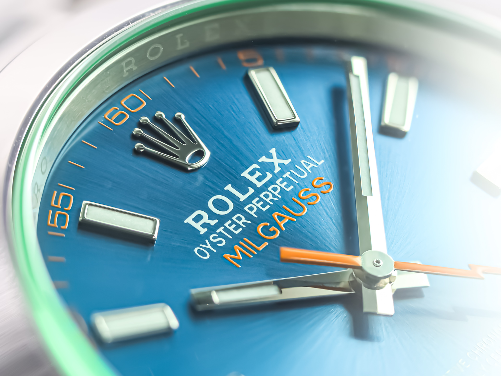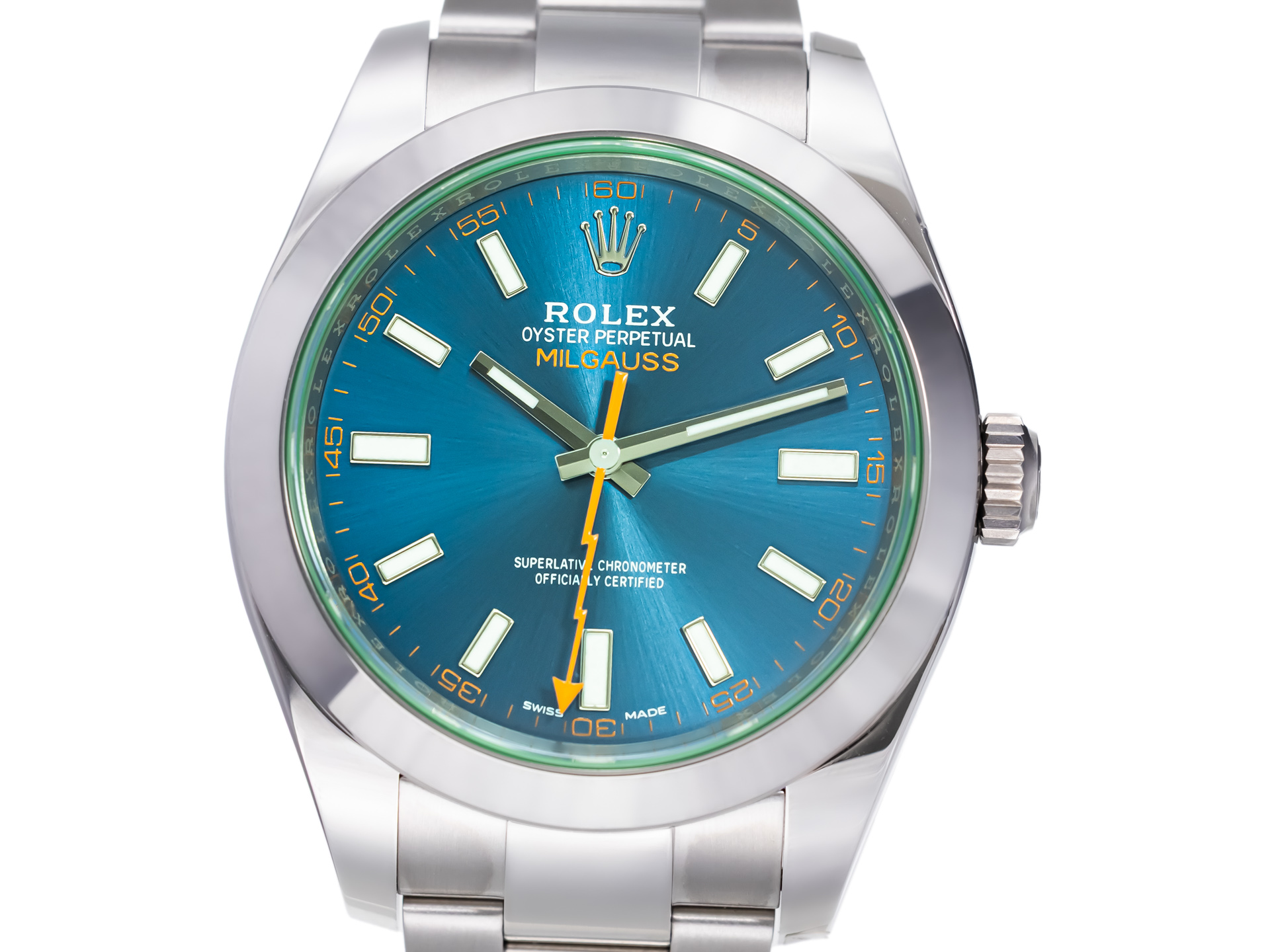 The mesmerizing Z-Blue sunburst dial, introduced as a later and now legendary addition to the Milgauss line, creates an interplay of blue, green, and metallic tones that shifts beautifully under varying light. Contrasted by luminous markers and the iconic orange lightning-bolt seconds hand, the dial delivers one of the most recognizable and contemporary aesthetics in Rolex design.