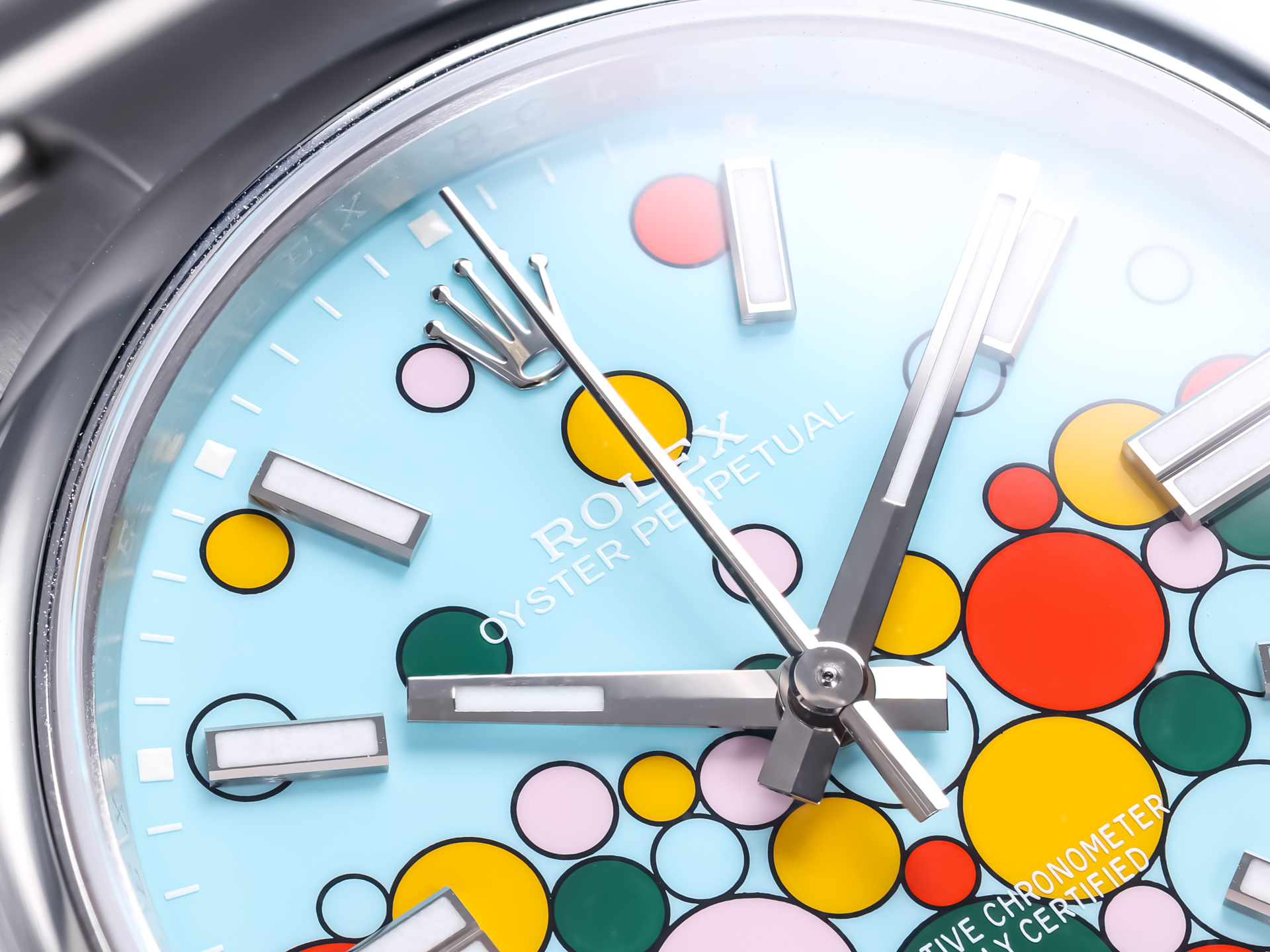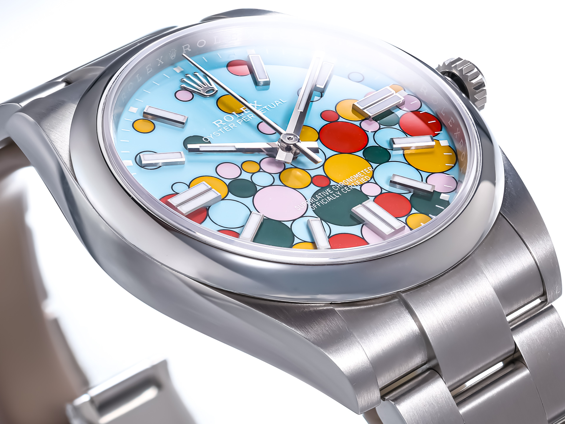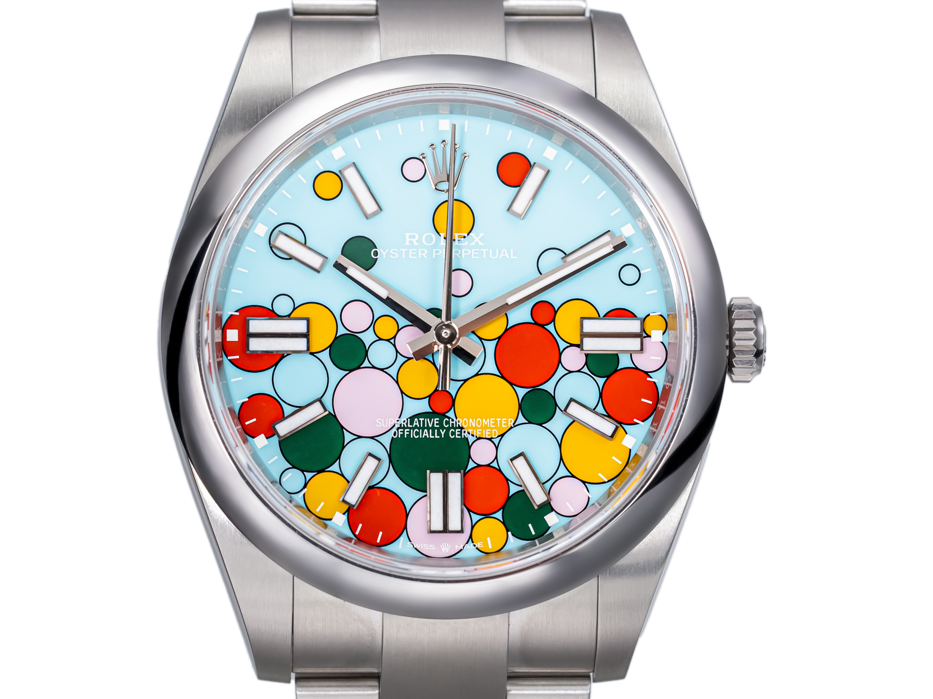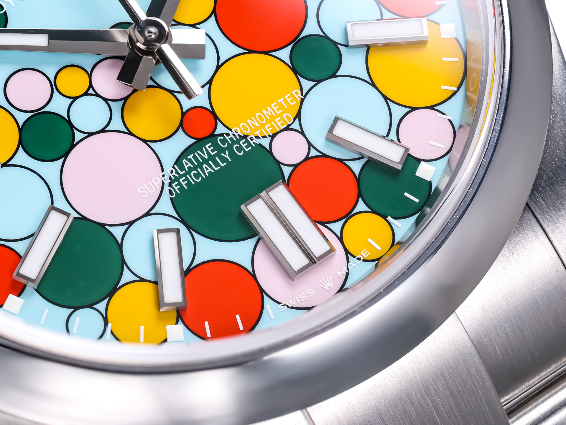 The standout feature of this reference is the "Celebration" motif dial, a turquoise blue base scattered with multicolored lacquered bubbles in red, yellow, green, coral, and pink—an exuberant design rarely seen from the brand known for its restraint. It exemplifies Rolex’s playful take on its classic models.