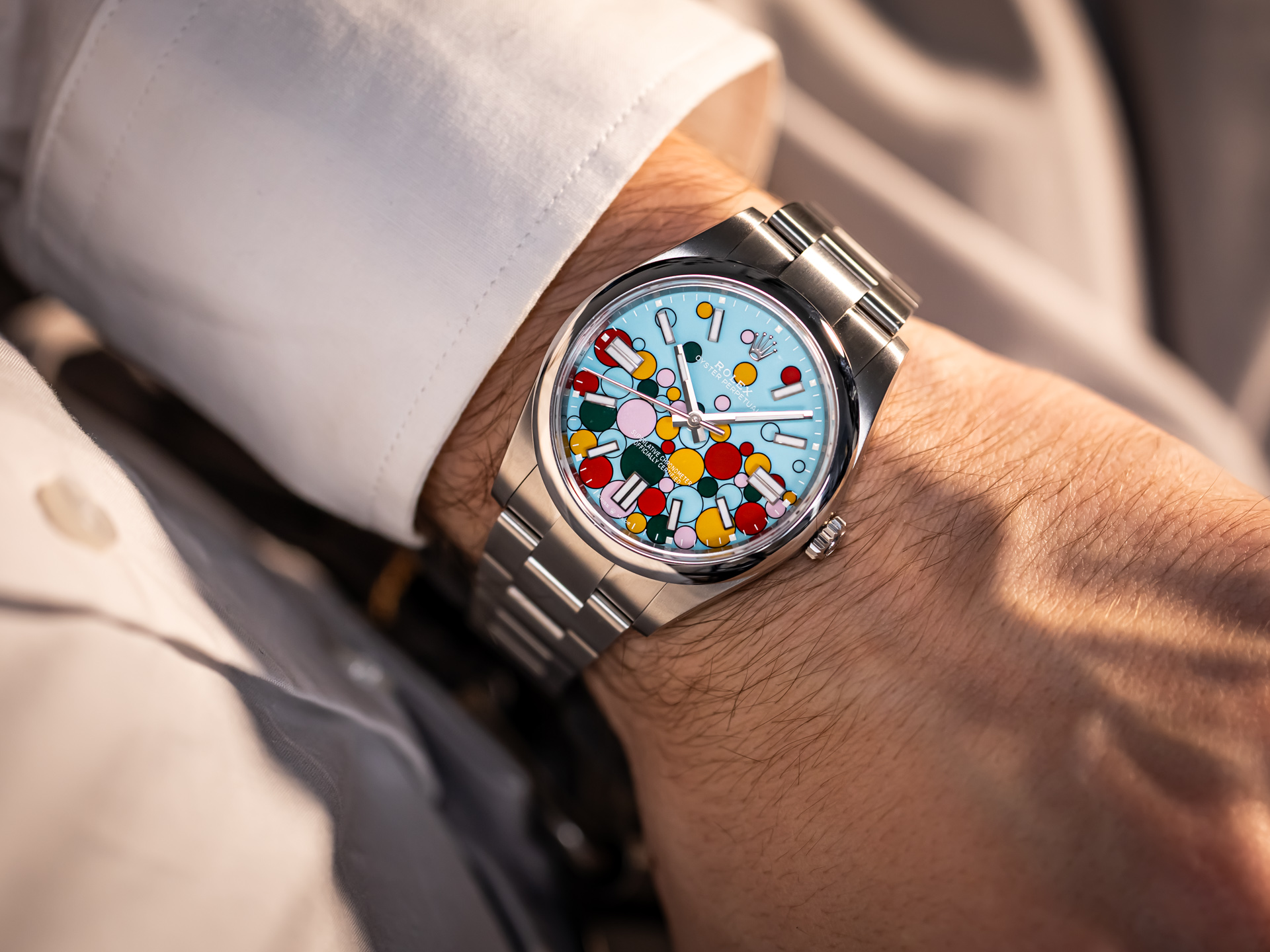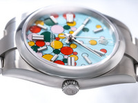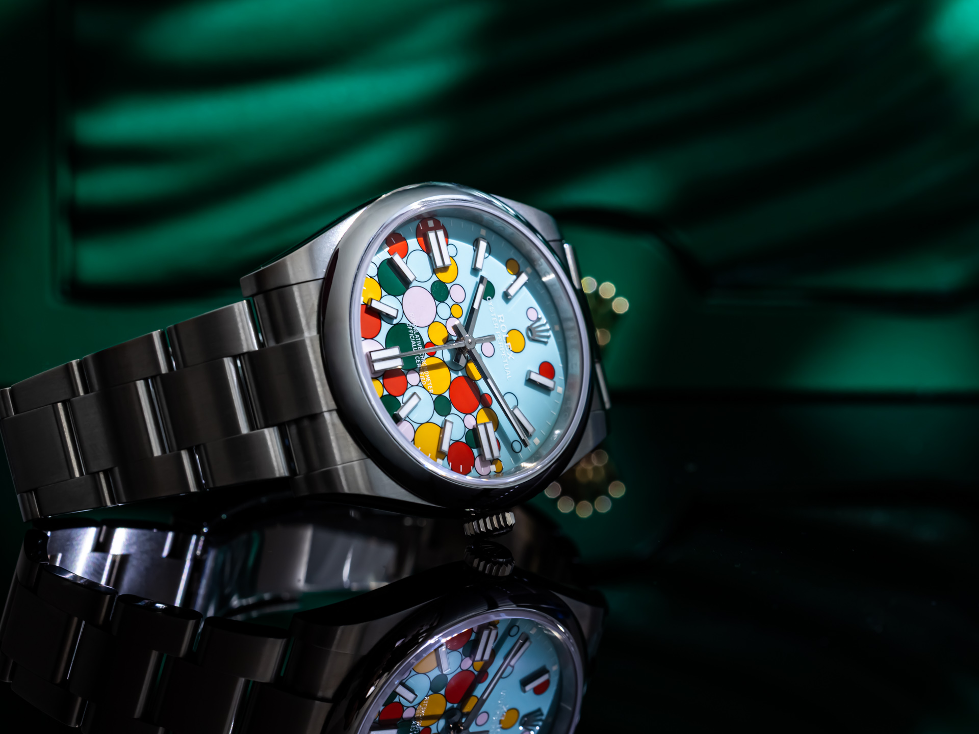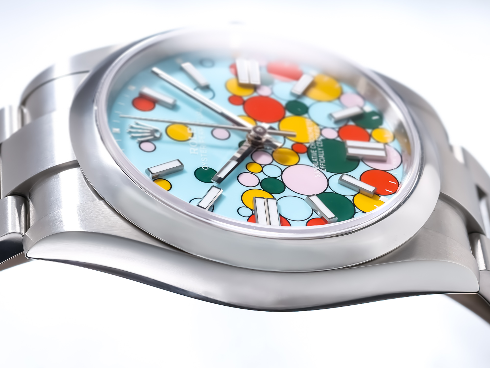 The standout feature of this reference is the "Celebration" motif dial, a turquoise blue base scattered with multicolored lacquered bubbles in red, yellow, green, coral, and pink—an exuberant design rarely seen from the brand known for its restraint. It exemplifies Rolex’s playful take on its classic models.