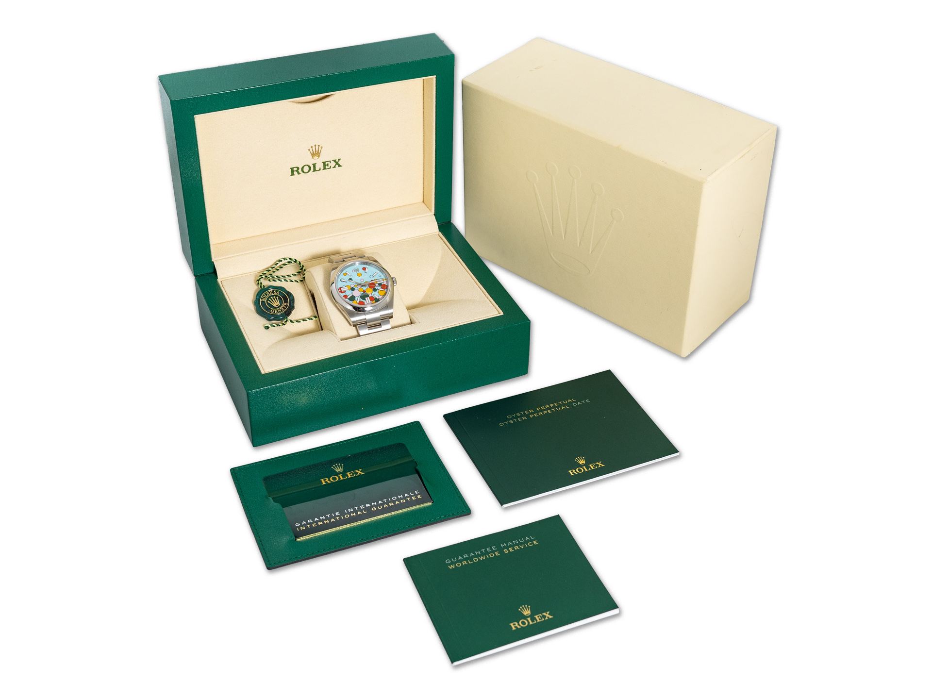 This Oyster Perpetual featuring the highly sought-after and whimsical "Celebration" dial—a vibrant and playful design introduced in 2023 that has since become a modern collector's favorite.