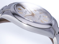 The watch features a stunning silver dial, beautifully enhanced by applied golden indices and matching golden hands. This refined color combination offers a subtle yet luxurious contrast, ensuring excellent legibility while maintaining a sophisticated aesthetic suitable for any occasion.