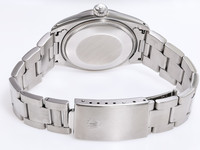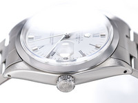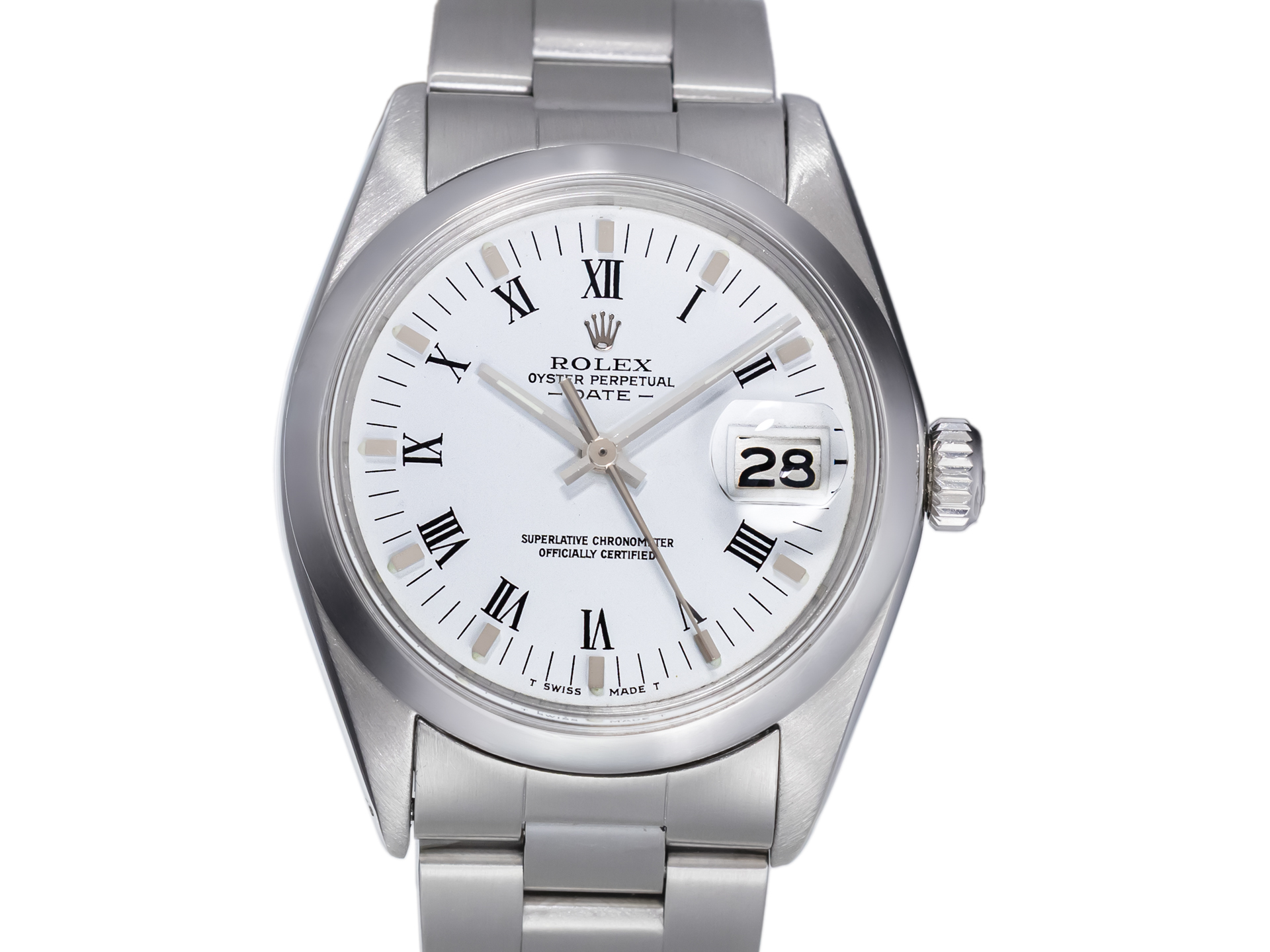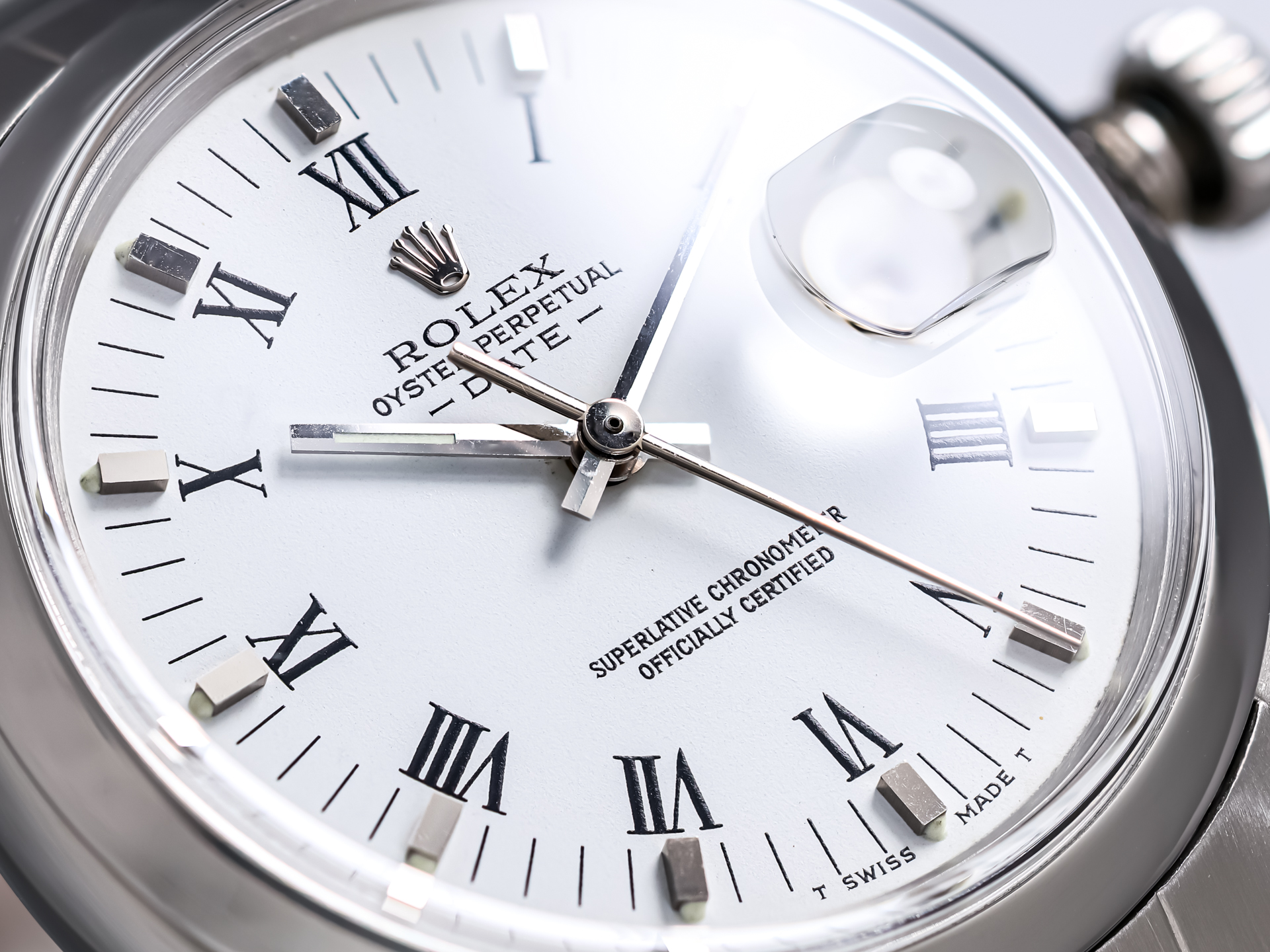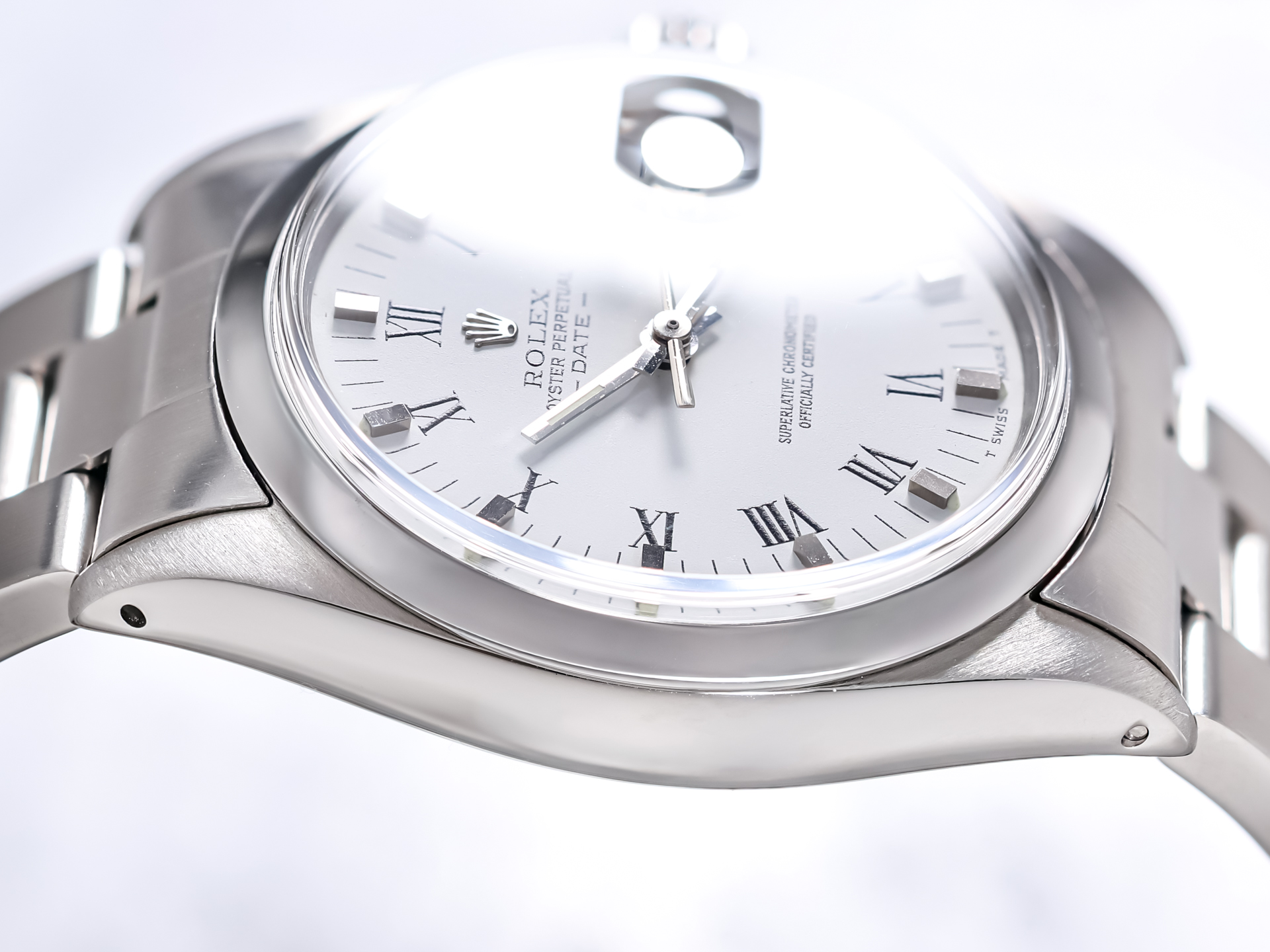 Housed in the classic 34 mm stainless steel Oyster case, the Ref. 1500 is celebrated for its sleek, compact proportions that offer a more refined silhouette on the wrist than its larger contemporaries. The defining feature of this model is its smoothly polished bezel, which provides a minimalist frame for the rare and exceptionally easy-to-read white dial. With its clearly printed Roman numerals and applied white gold block indices, this dial variant lends the watch a touch of intellectual sophistication reminiscent of the “Buckley” style, yet enhanced by the added functionality of the date window at 3 o’clock.