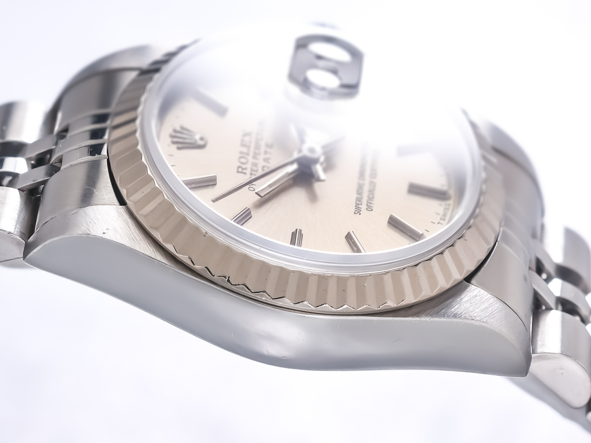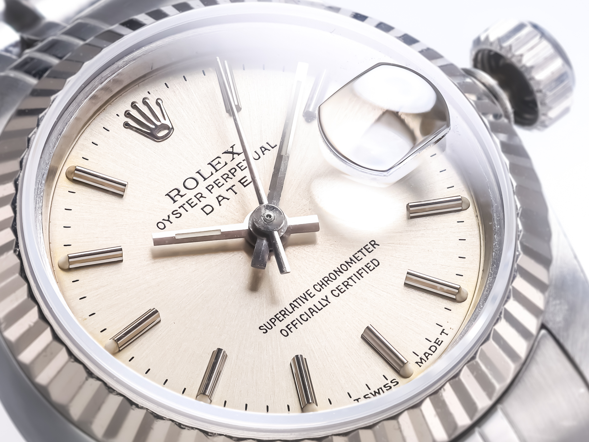 Housed in a slender stainless steel Oyster case, the Ref. 69174 is distinguished by its iconic fluted bezel, meticulously crafted from solid 18k white gold. This signature Rolex detail catches the light from every angle, providing a luxurious contrast to the high-grade brushed steel lugs. The monochromatic silver dial features a sunray finish, creating a subtle play of light that serves as the perfect backdrop for the applied white gold hour markers and the cyclops lens at 3 o’clock - a hallmark of the Datejust lineage.