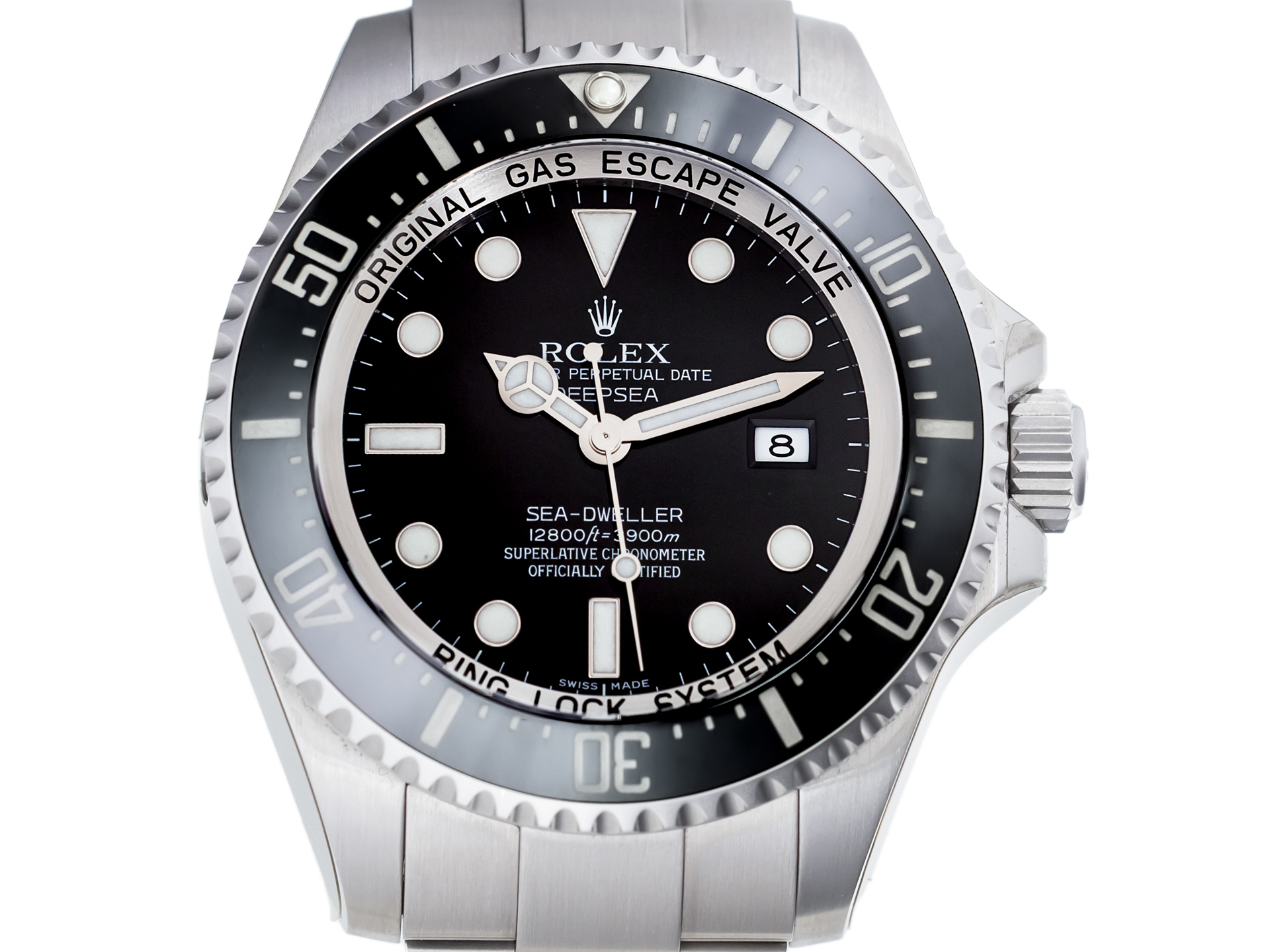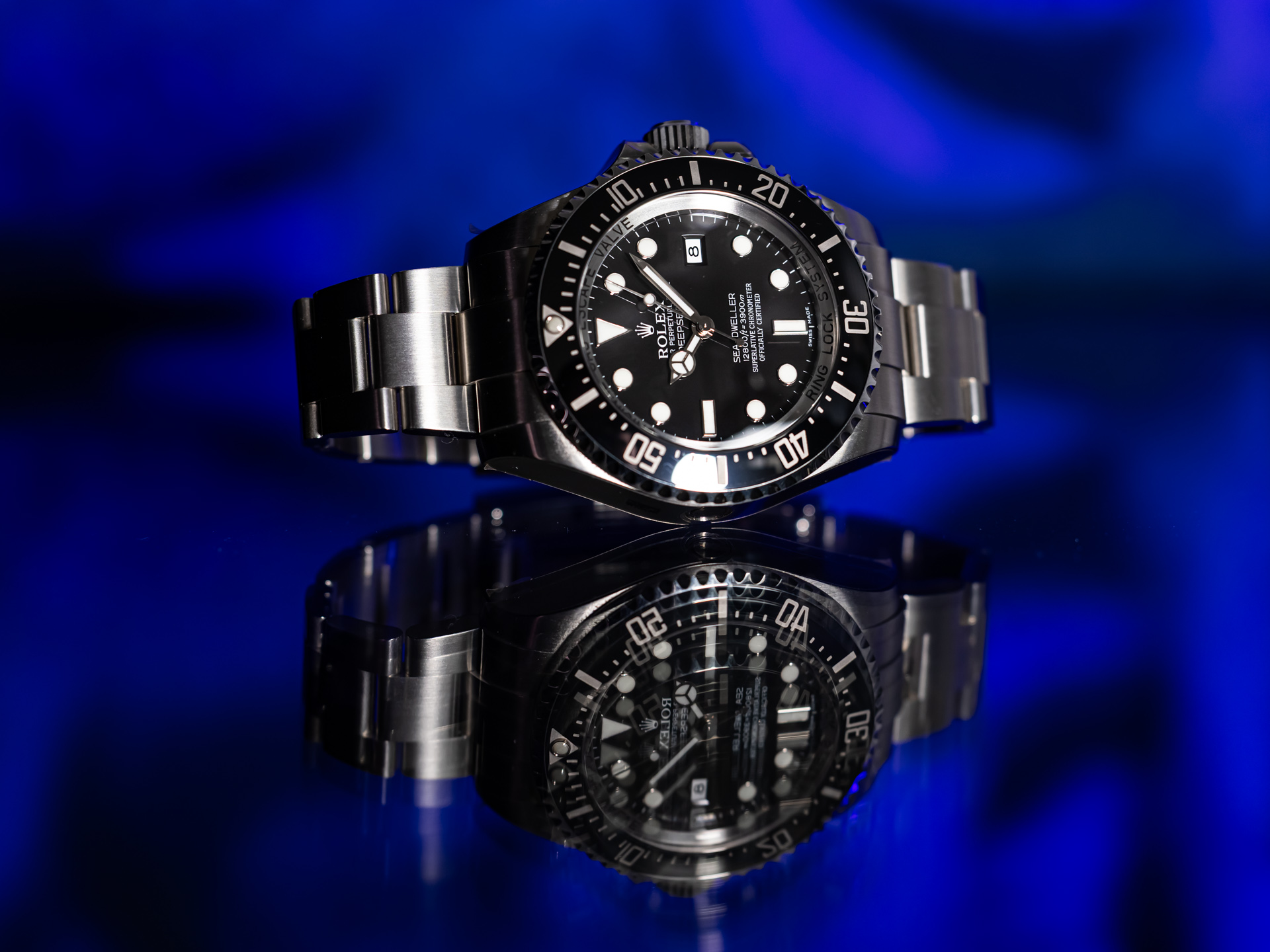 Crafted in robust stainless steel, the 44mm case features Rolex’s patented Ringlock System, a helium escape valve, and a scratch-resistant sapphire crystal. The iconic black dial with Chromalight display ensures exceptional legibility, even in the darkest underwater environments. Powering the watch is Rolex’s in-house automatic movement, renowned for its precision, reliability, and longevity.