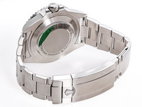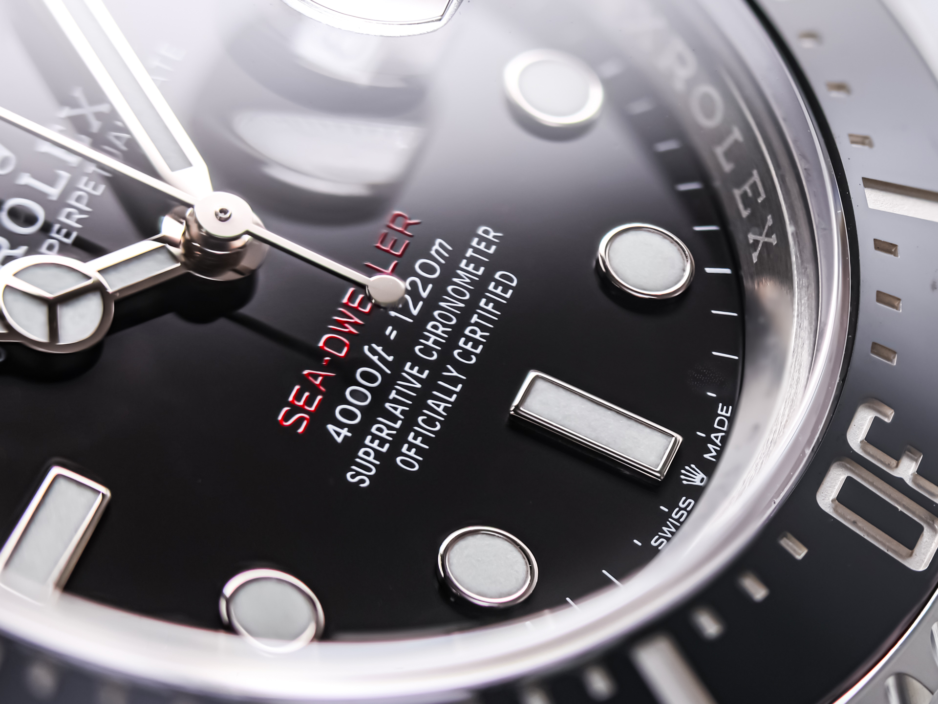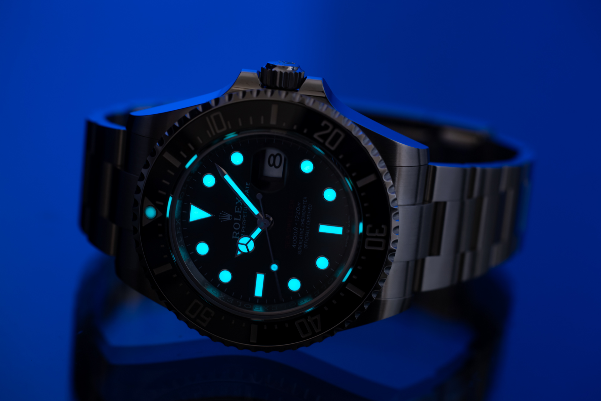The black dial is defined by its signature red “Sea-Dweller” inscription, a subtle yet powerful nod to vintage references. Chromalight hour markers and hands provide exceptional legibility, even in the darkest conditions.