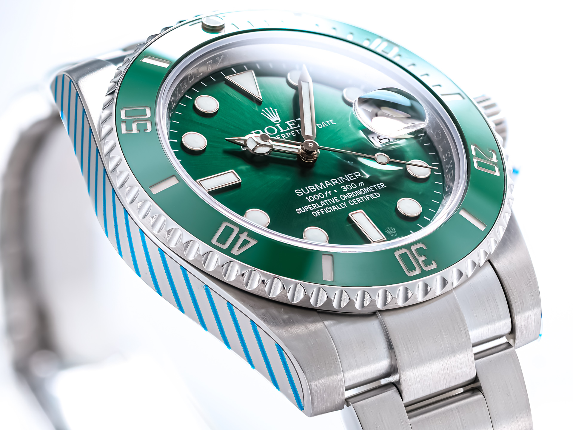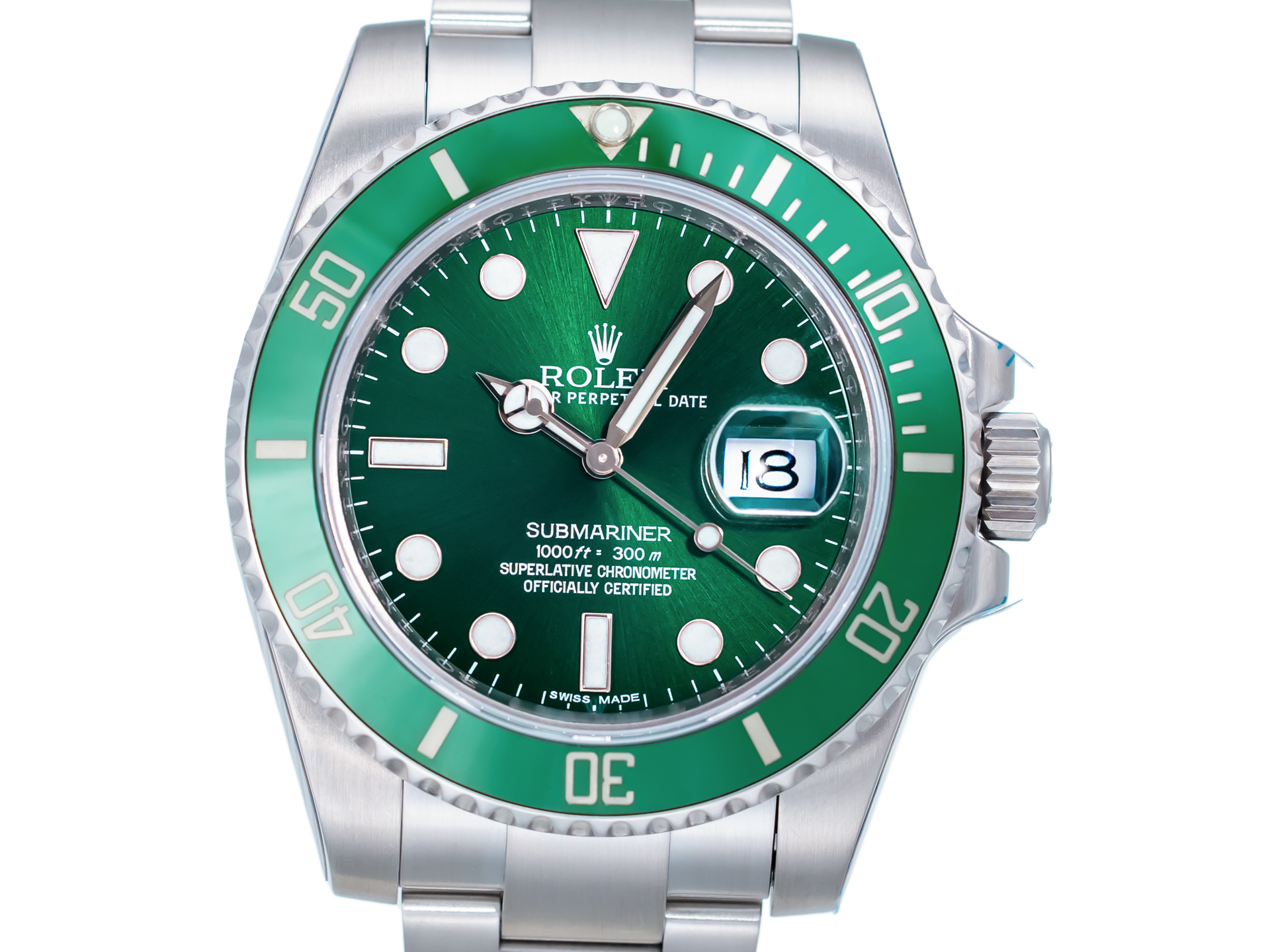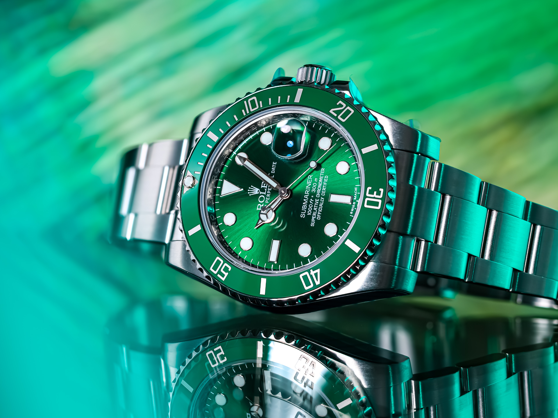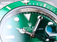 The watch’s signature features—the radiant green sunburst dial and matching green Cerachrom bezel insert—give the “Hulk” its distinctive identity. The dial shifts dramatically in changing light, displaying tones from deep emerald to bright metallic green, while the scratch-resistant ceramic bezel adds both color intensity and longevity.