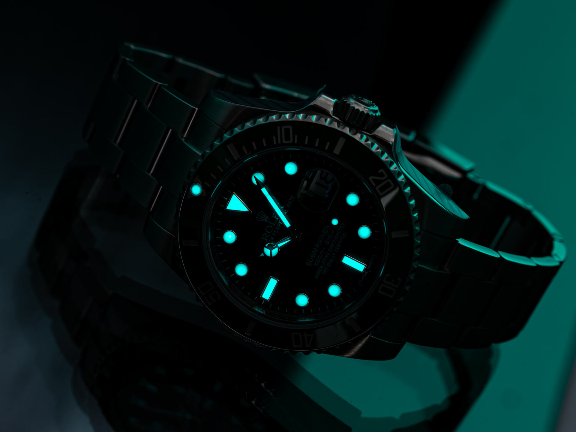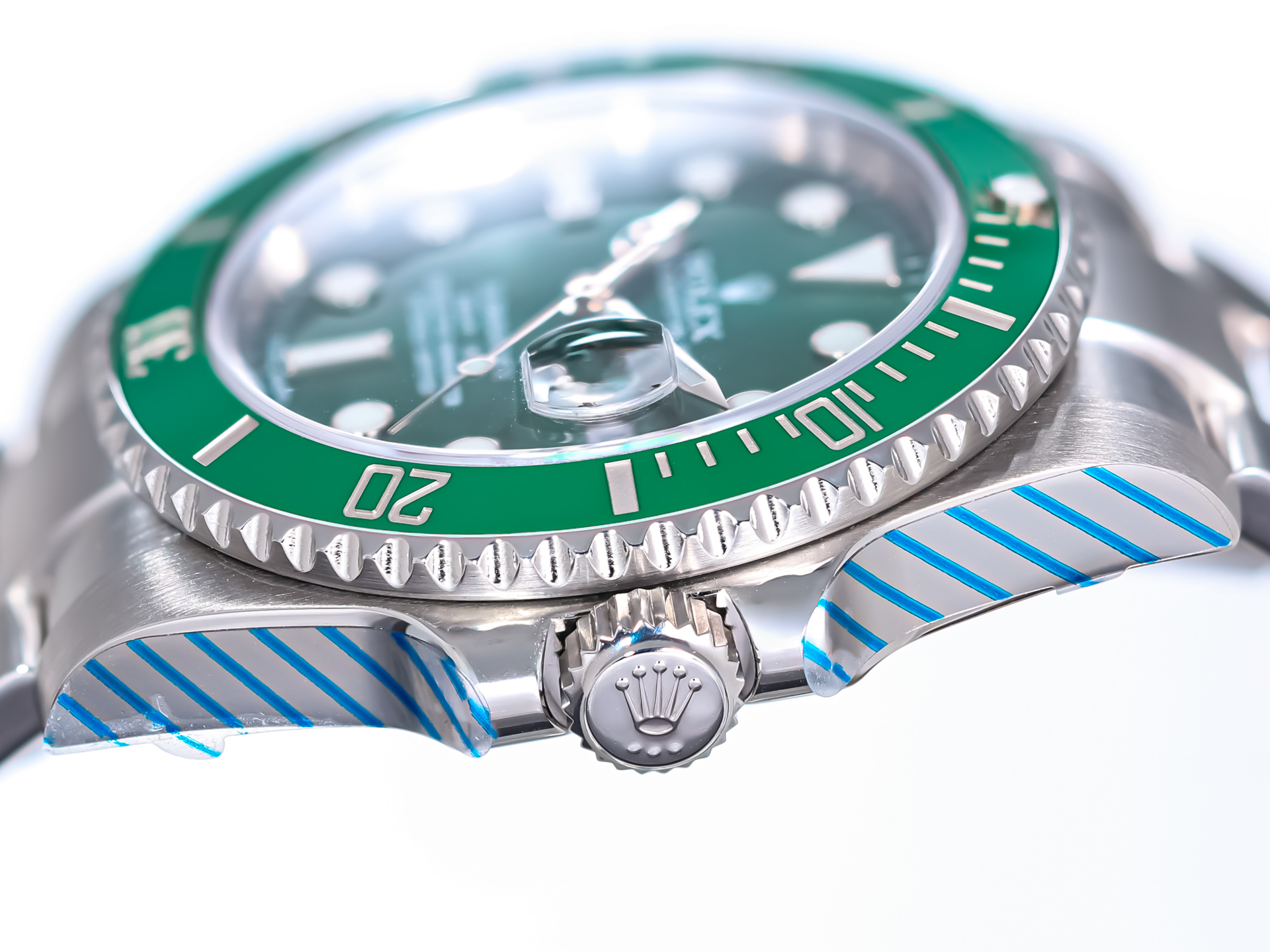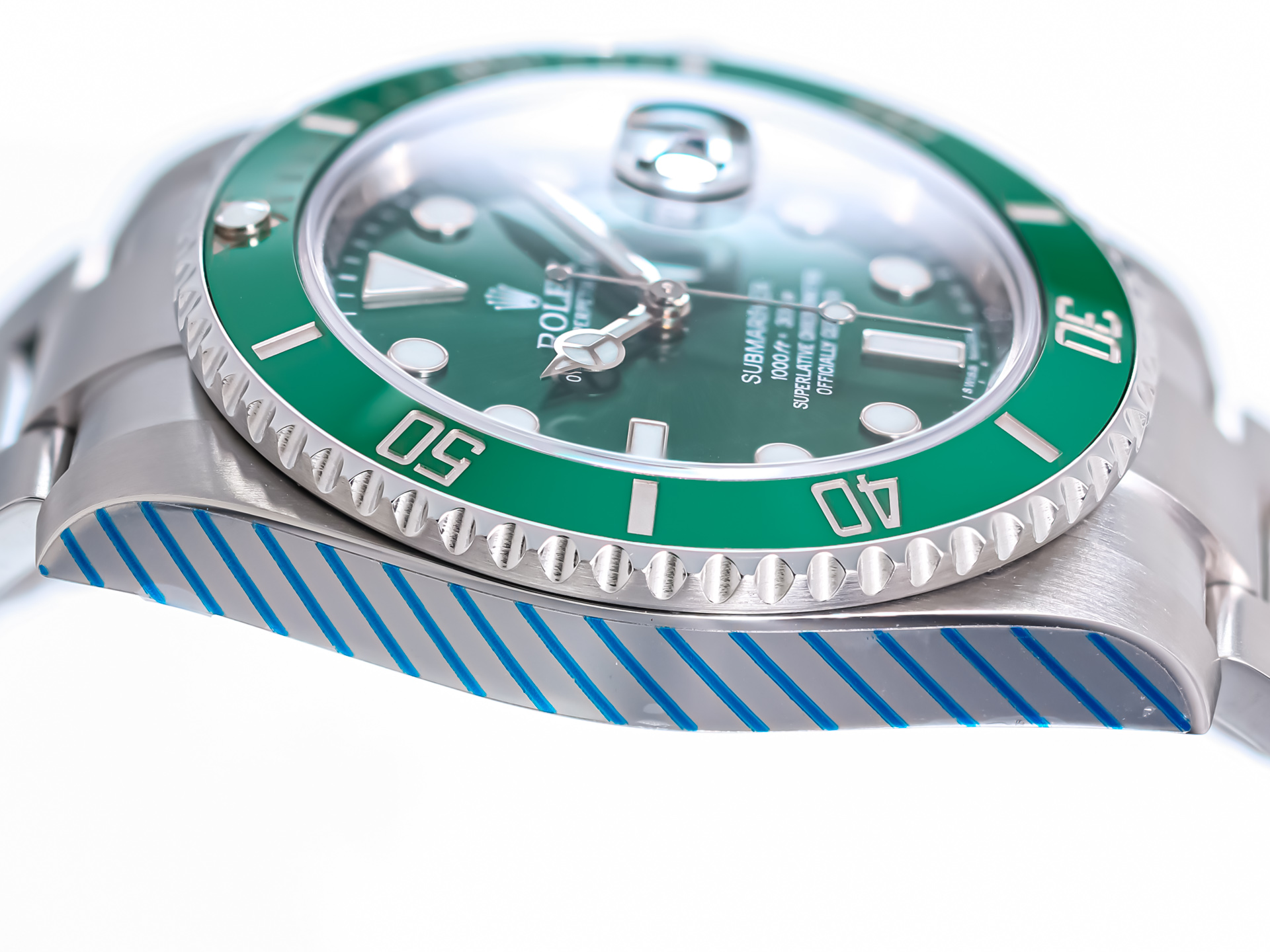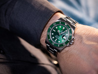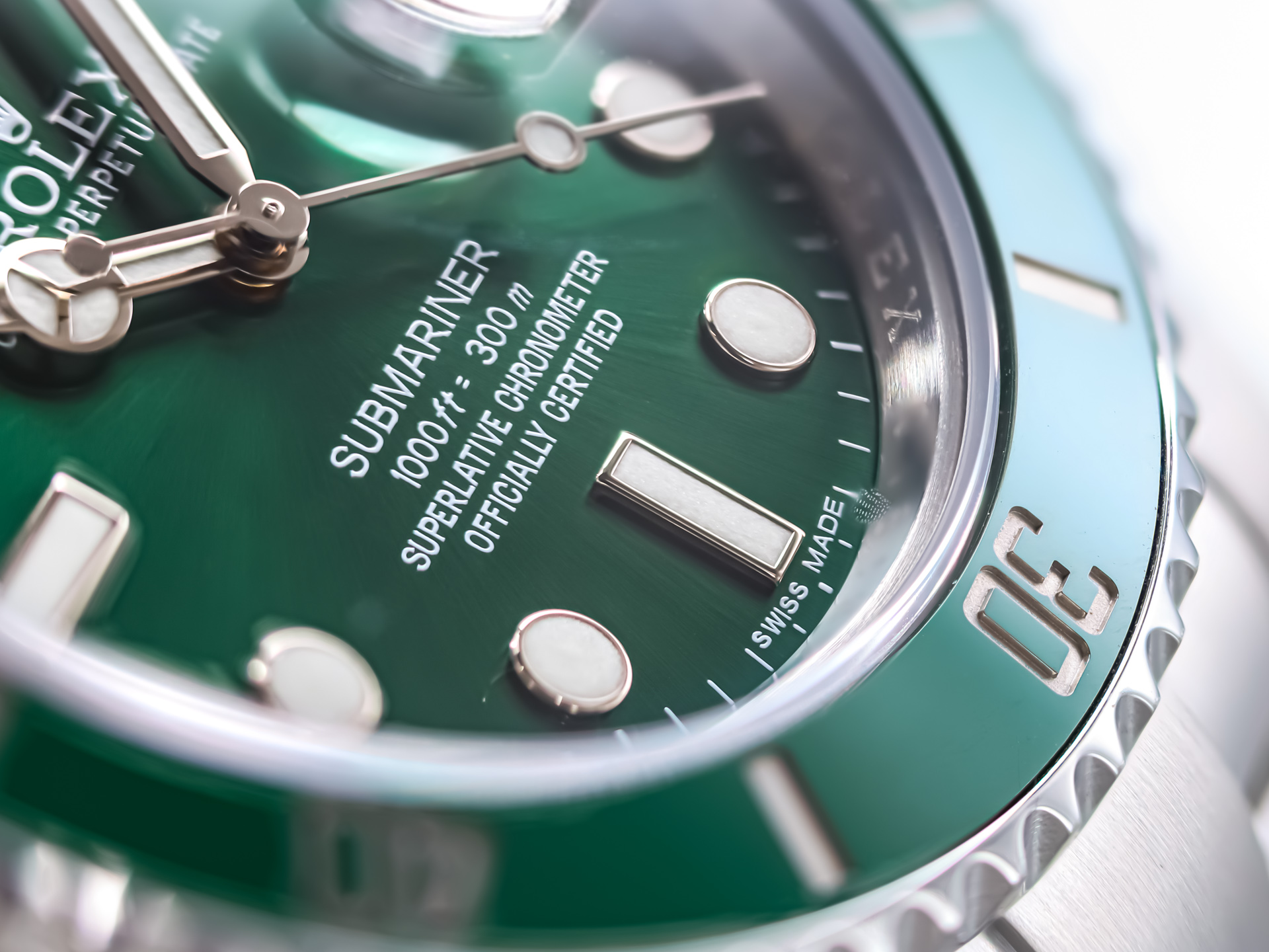 The watch’s signature features—the radiant green sunburst dial and matching green Cerachrom bezel insert—give the “Hulk” its distinctive identity. The dial shifts dramatically in changing light, displaying tones from deep emerald to bright metallic green, while the scratch-resistant ceramic bezel adds both color intensity and longevity.