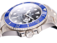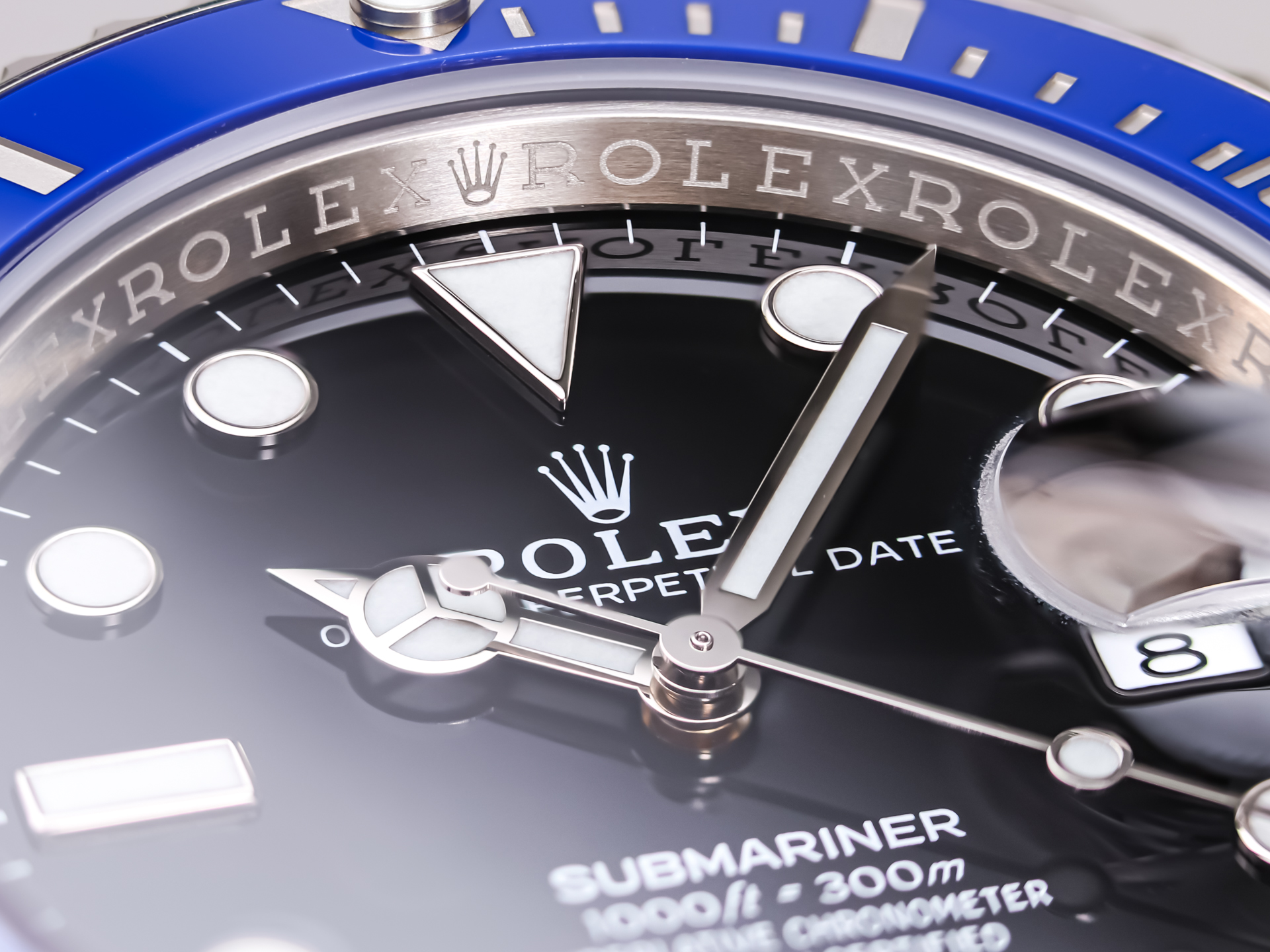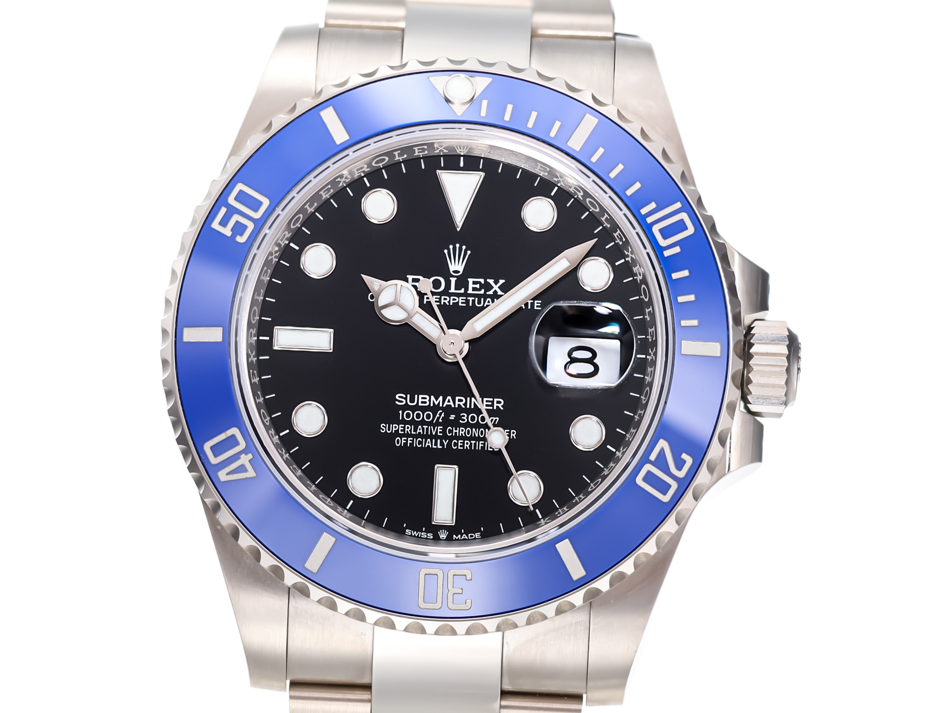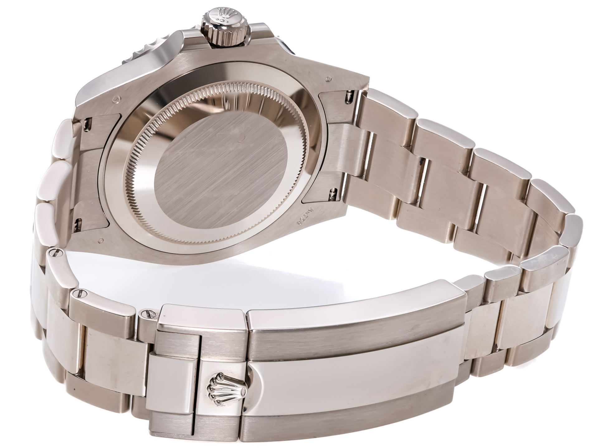 The robust 41 mm case is rendered in solid 18k white gold, offering both substantial presence and understated sophistication. The unmistakable Submariner design—renowned for its balance, durability, and timeless appeal—is elevated here through the use of precious metal, while retaining its core identity as a professional-grade diving instrument.