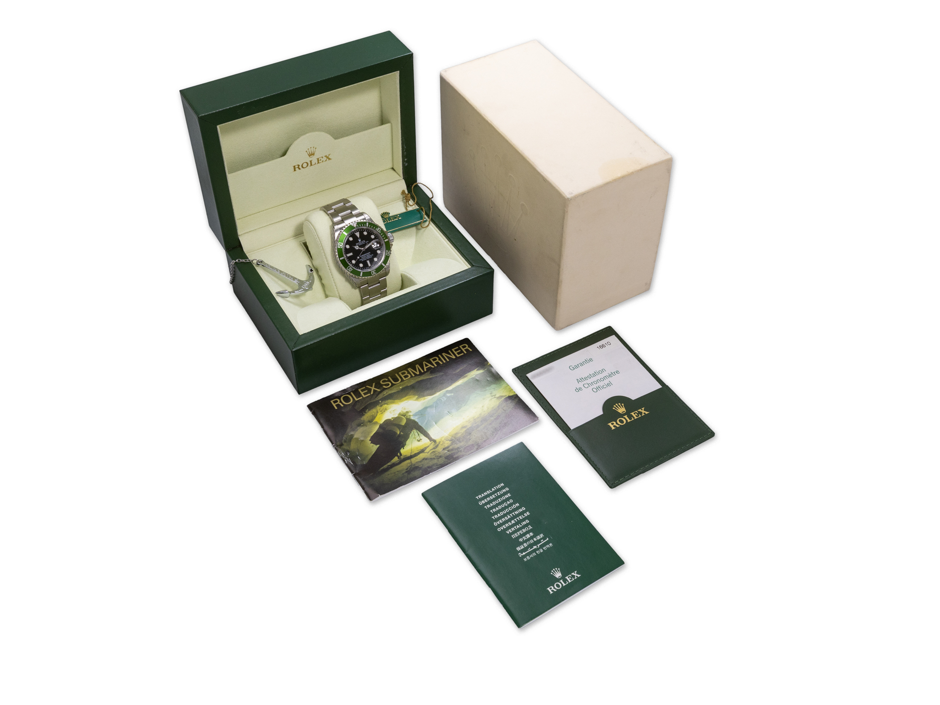 This Rolex Submariner Date Ref. 16610LV “Kermit” is offered with: