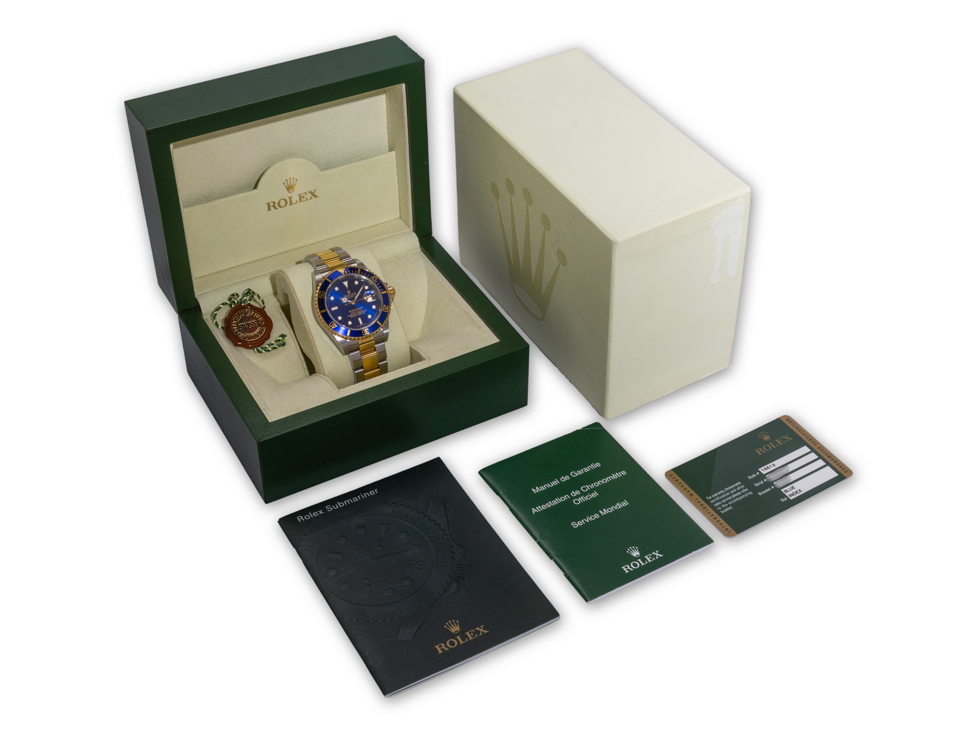 This Rolex Submariner Date 16613 comes complete with: