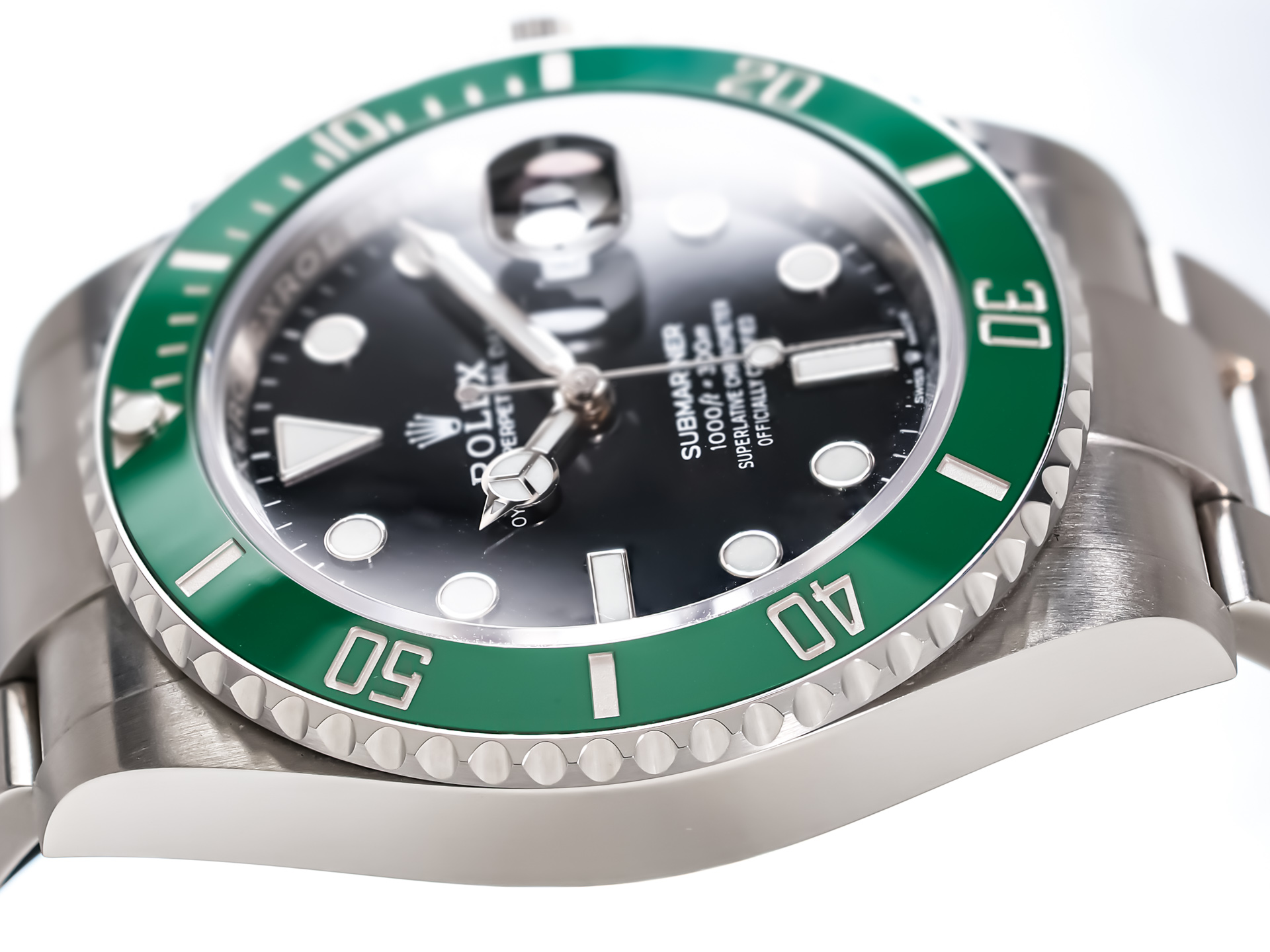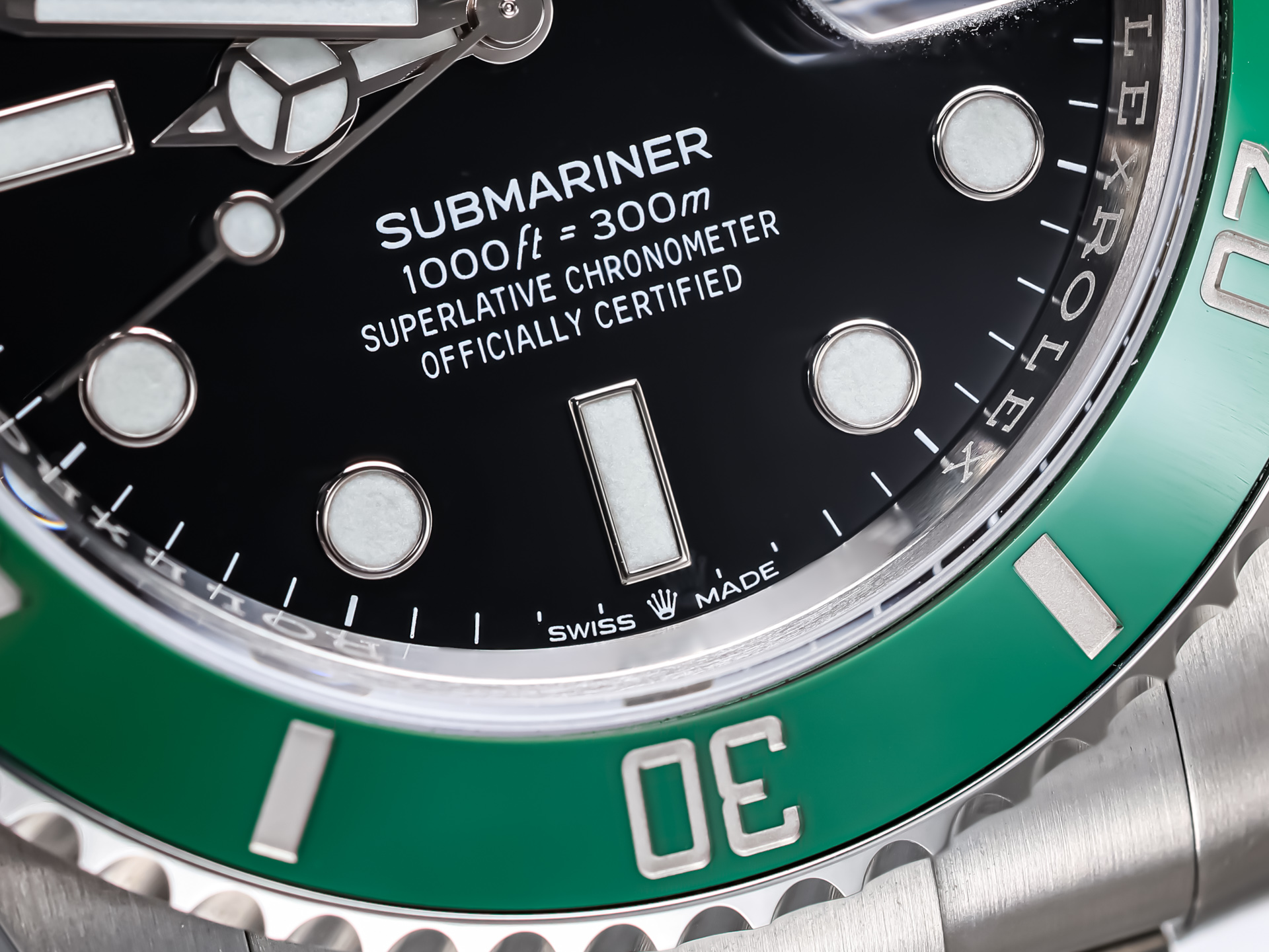 The vibrant green ceramic bezel — a nod to the original 2003 “Kermit” — is crafted from Rolex's patented Cerachrom, highly resistant to fading, corrosion, and scratches. Paired with the black Maxi dial featuring Chromalight lume, the contrast is bold, modern, and unmistakably Submariner.