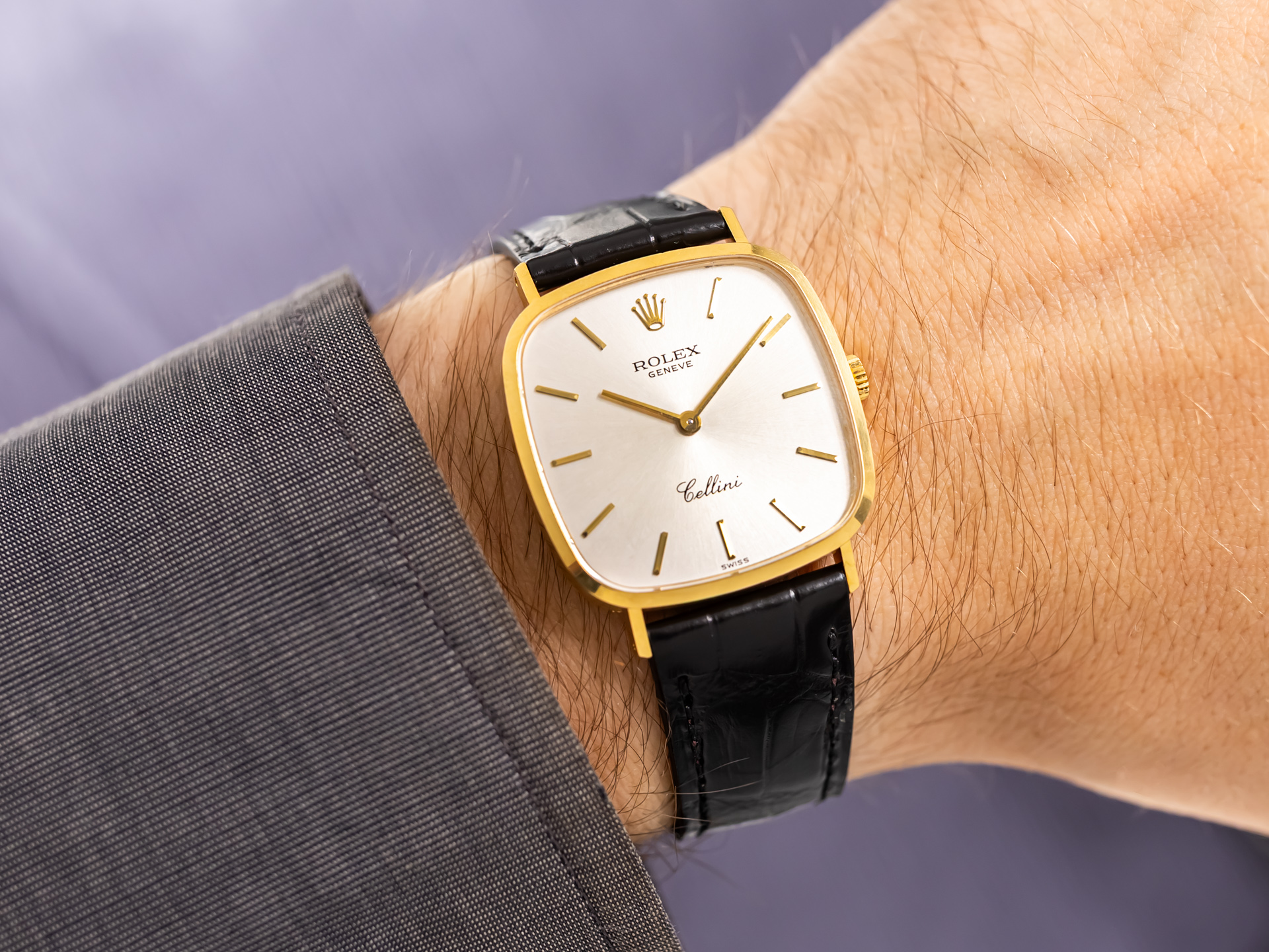Measuring approximately 32mm x 32mm, the rectangular case features softly rounded edges and a polished finish, offering a sleek and dressy profile that wears beautifully on the wrist. The minimalist silver dial is signed “Cellini” beneath the Rolex crown and keeps the focus on refined simplicity, with thin black baton hands and matching applied indices.
