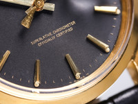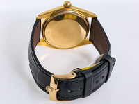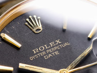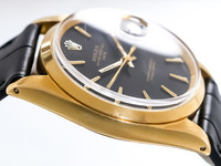 The 34mm Oyster case is well-preserved, showing sharp lugs and retaining excellent proportions. The smooth yellow gold bezel frames the black dial beautifully, lending the watch a clean, understated elegance. The applied yellow gold hour markers and tritium-filled hands complete the cohesive vintage aesthetic, while the signature date window at 3 o’clock with cyclops magnifier underscores the model’s practical appeal.