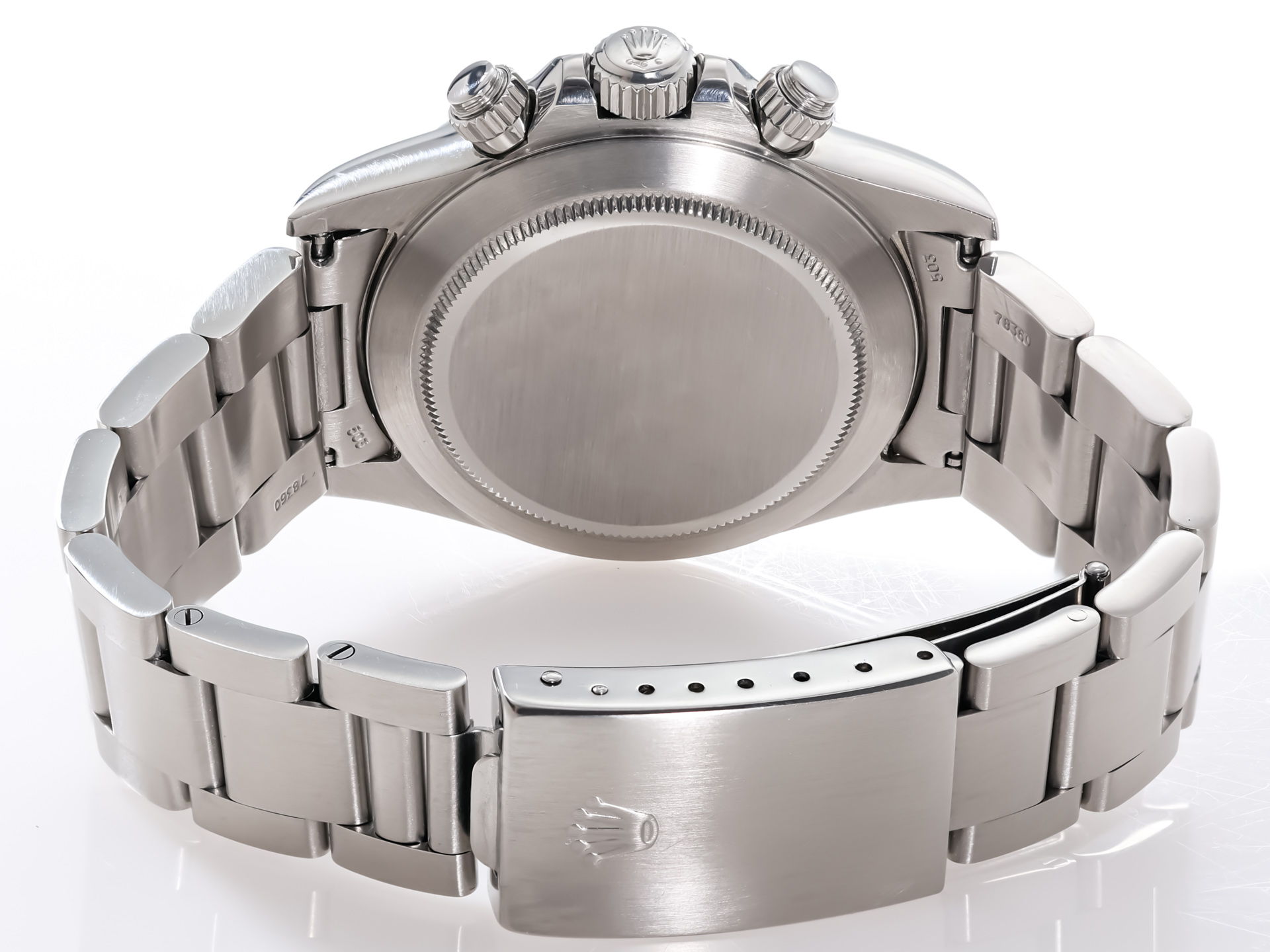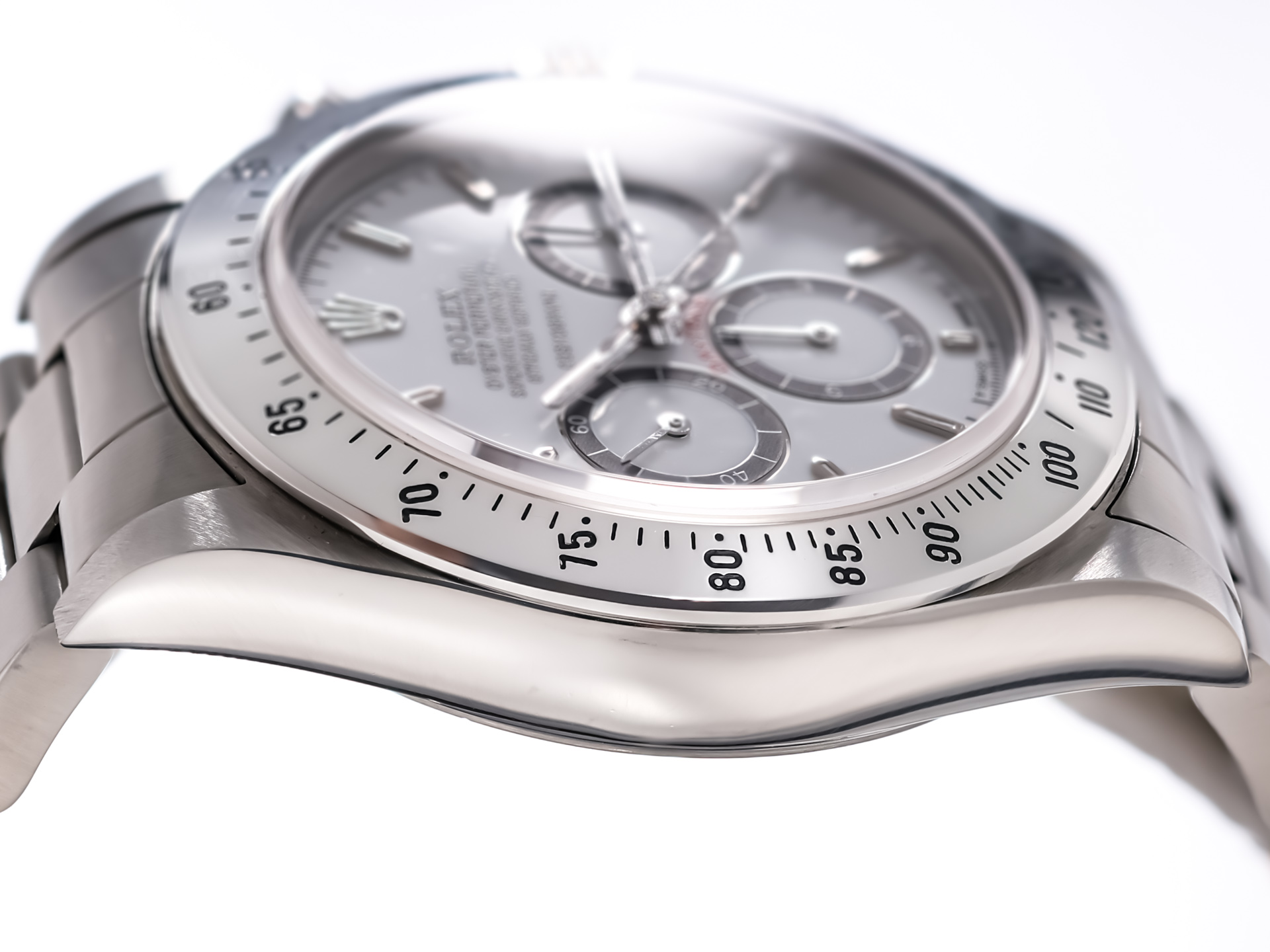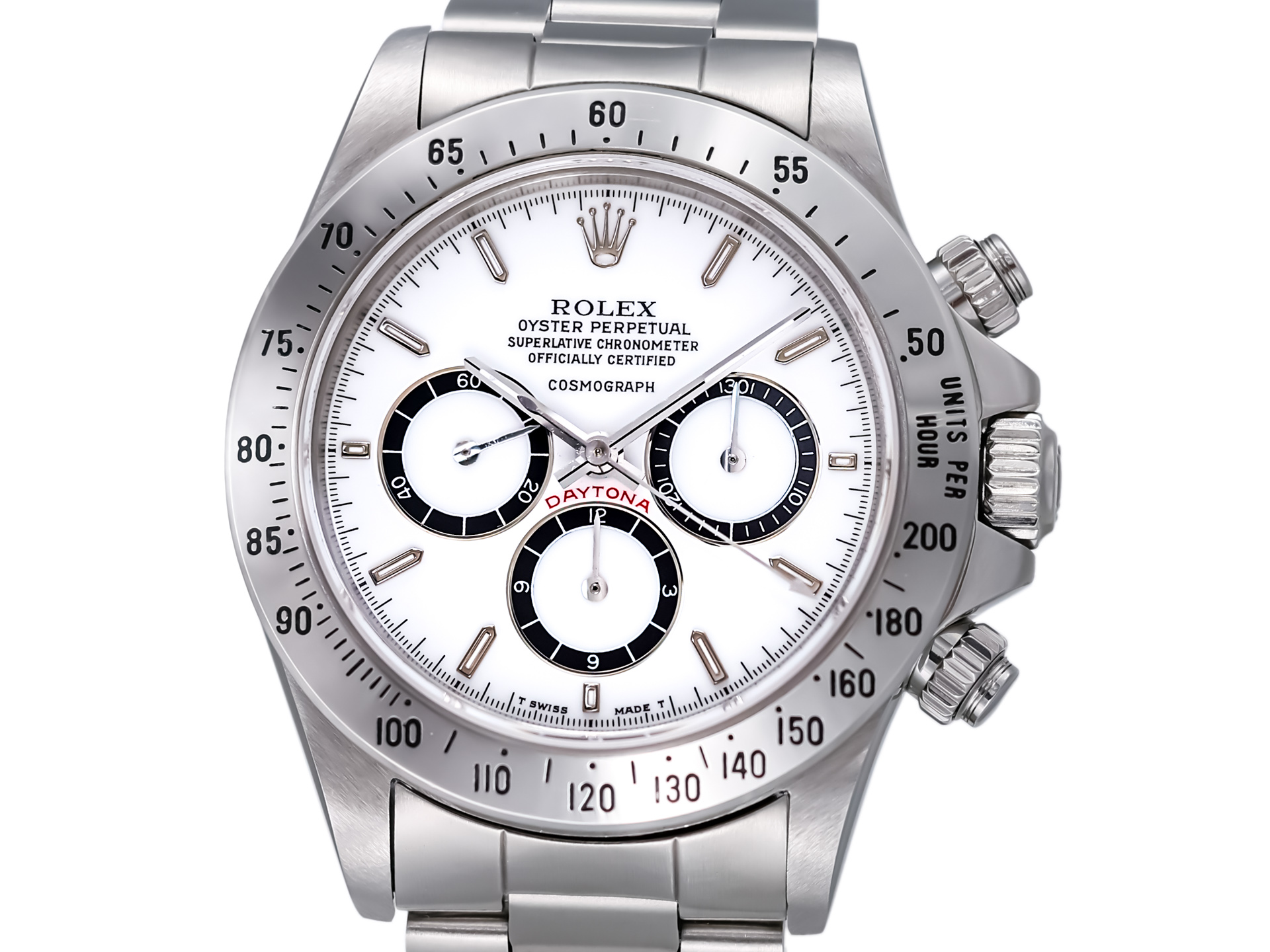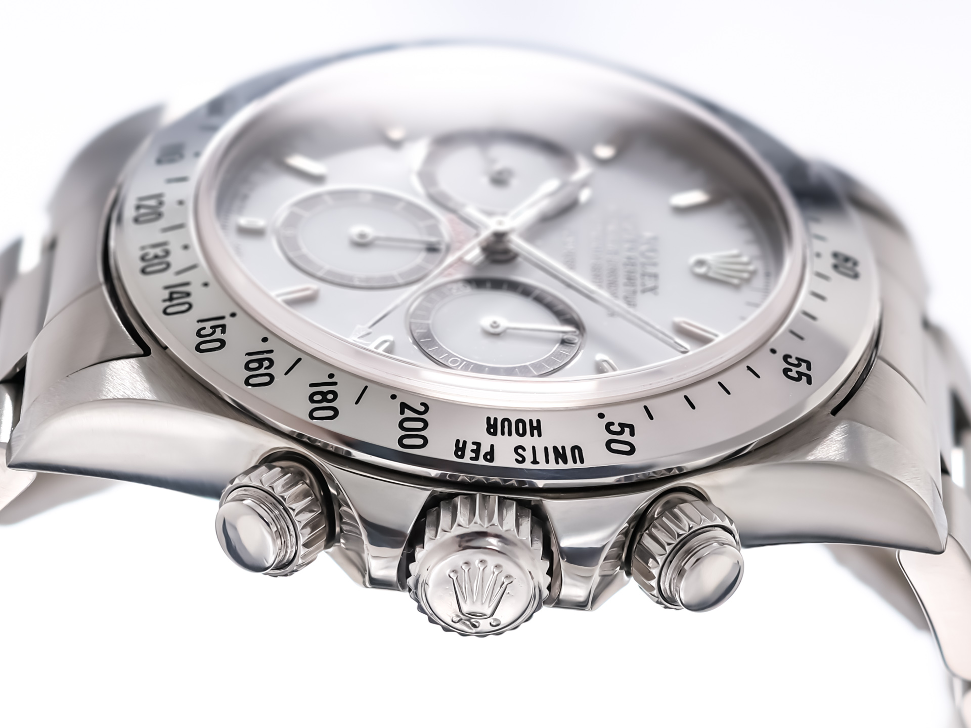 The 40mm stainless steel case remains in excellent condition, retaining sharp lugs and crisp edges. The bezel is engraved with the 200-unit tachymeter scale (correct for early models), and the bracelet is tight with no stretch, properly stamped and period correct.