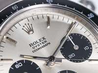The classic 37,5 mm stainless steel Oyster case is complemented by the distinctive black acrylic tachymeter bezel, a defining hallmark of the reference 6263. Designed originally as a professional racing chronograph, the watch combines functional robustness with timeless aesthetics. The addition of the original screw-down chronograph pushers and the Triplock crown enhanced water resistance compared to earlier Daytona references, reinforcing the model’s sporting pedigree.