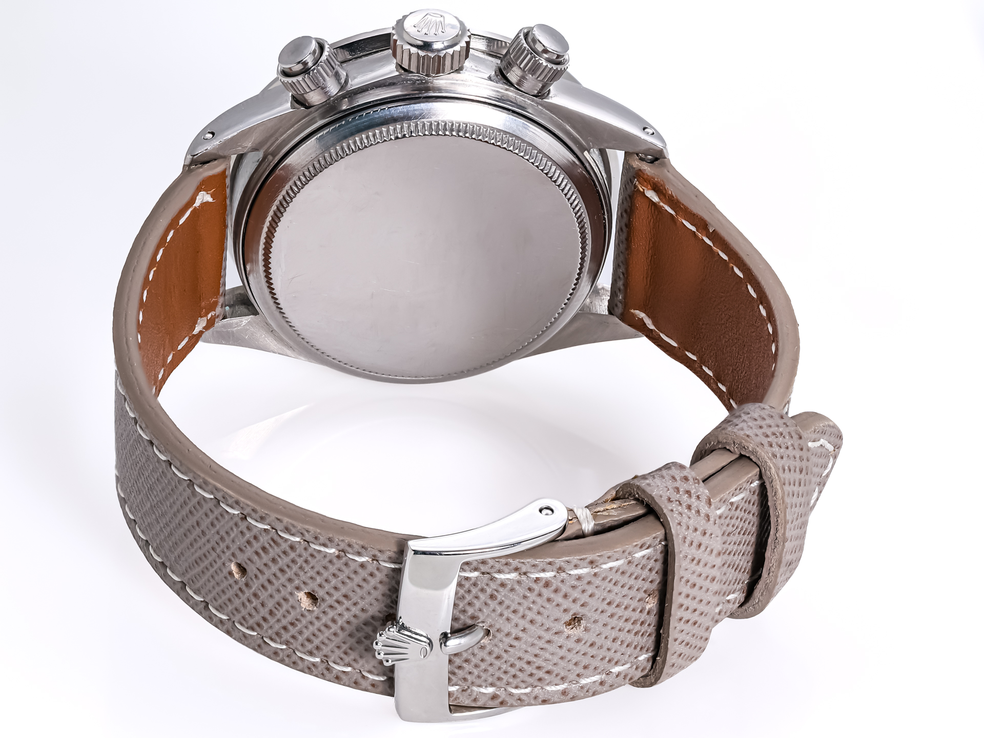 Powering the watch is the renowned manual-wind caliber 727, Rolex’s refined evolution of the Valjoux-based chronograph movement. Operating at a higher frequency than its predecessors, the caliber 727 is widely respected for its reliability, robustness, and chronometric precision—qualities that helped cement the Daytona’s legendary status.