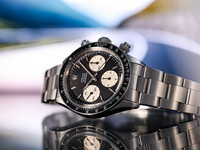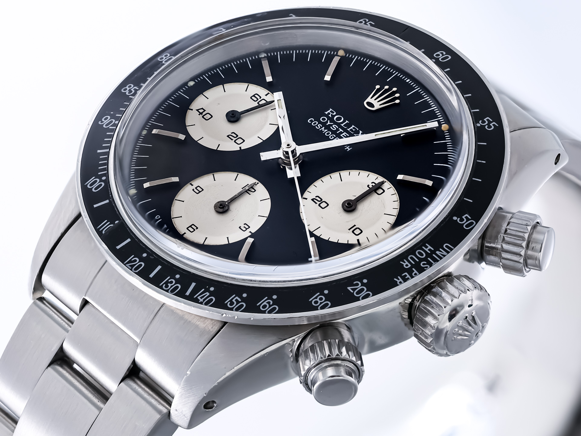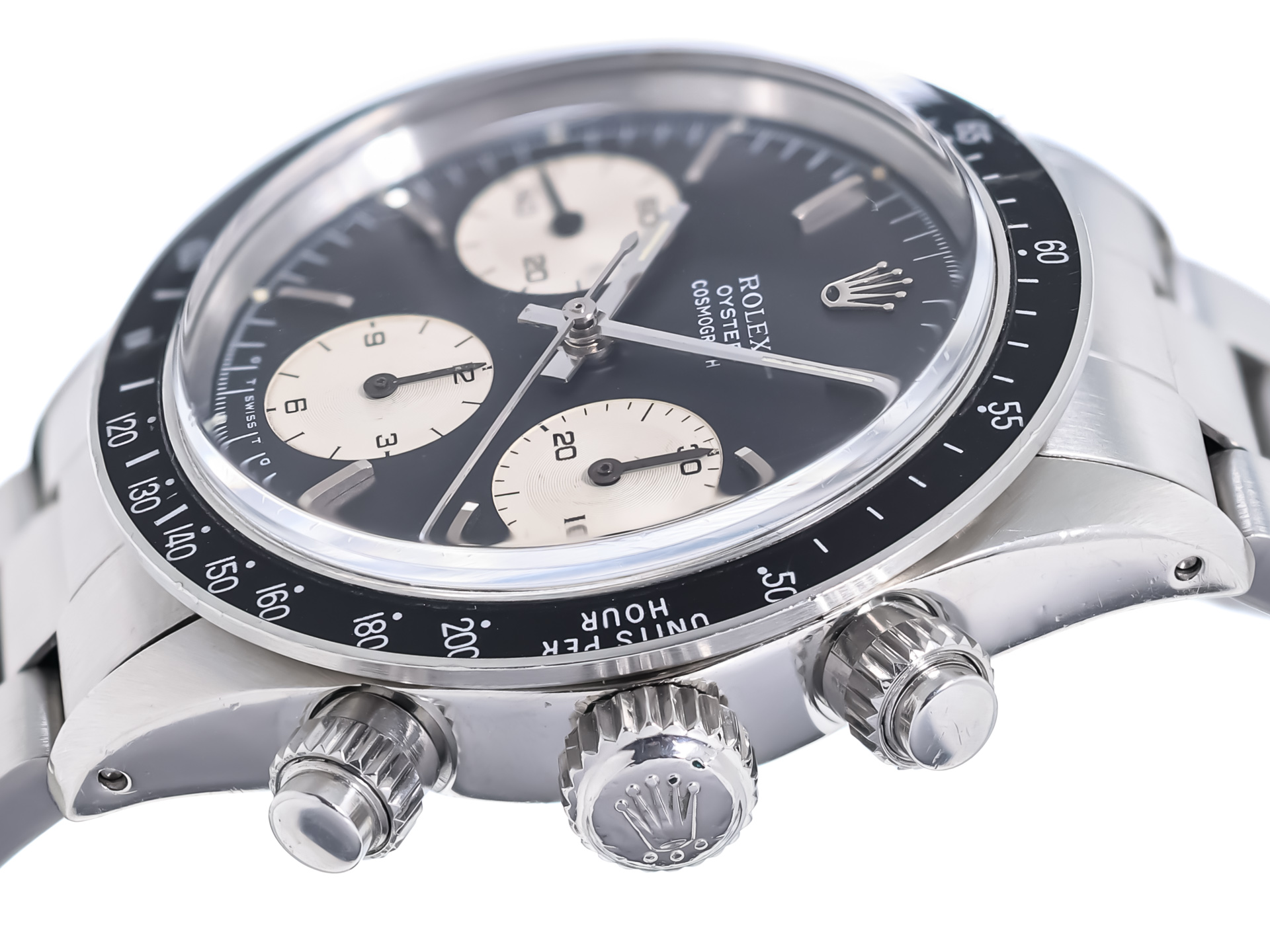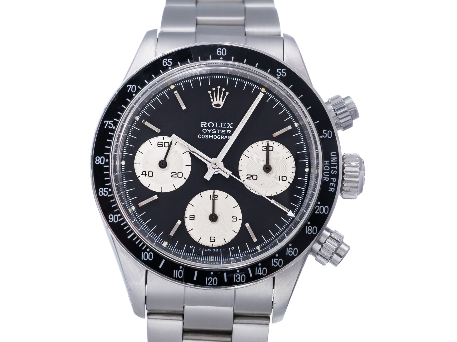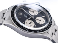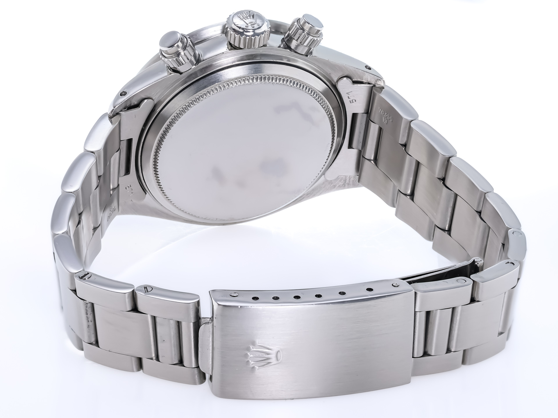 This Daytonais fitted iconic black tritium dial — an essential reference within the pantheon of manually wound Rolex chronographs.