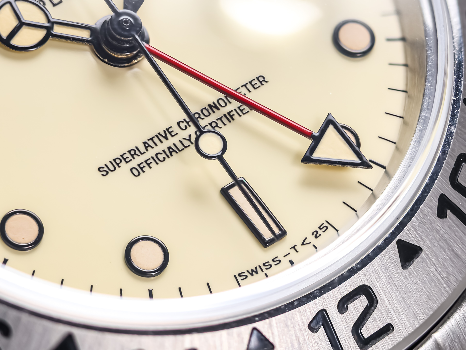 Crafted in stainless steel, the 40 mm case features the fixed 24-hour bezel, allowing for easy distinction between day and night—an essential tool for spelunkers and polar explorers. The naturally aged cream dial, once white, has developed a warm and desirable patina over time, giving this example unique character and strong vintage appeal. Luminous hour markers and hands ensure excellent legibility in all conditions.