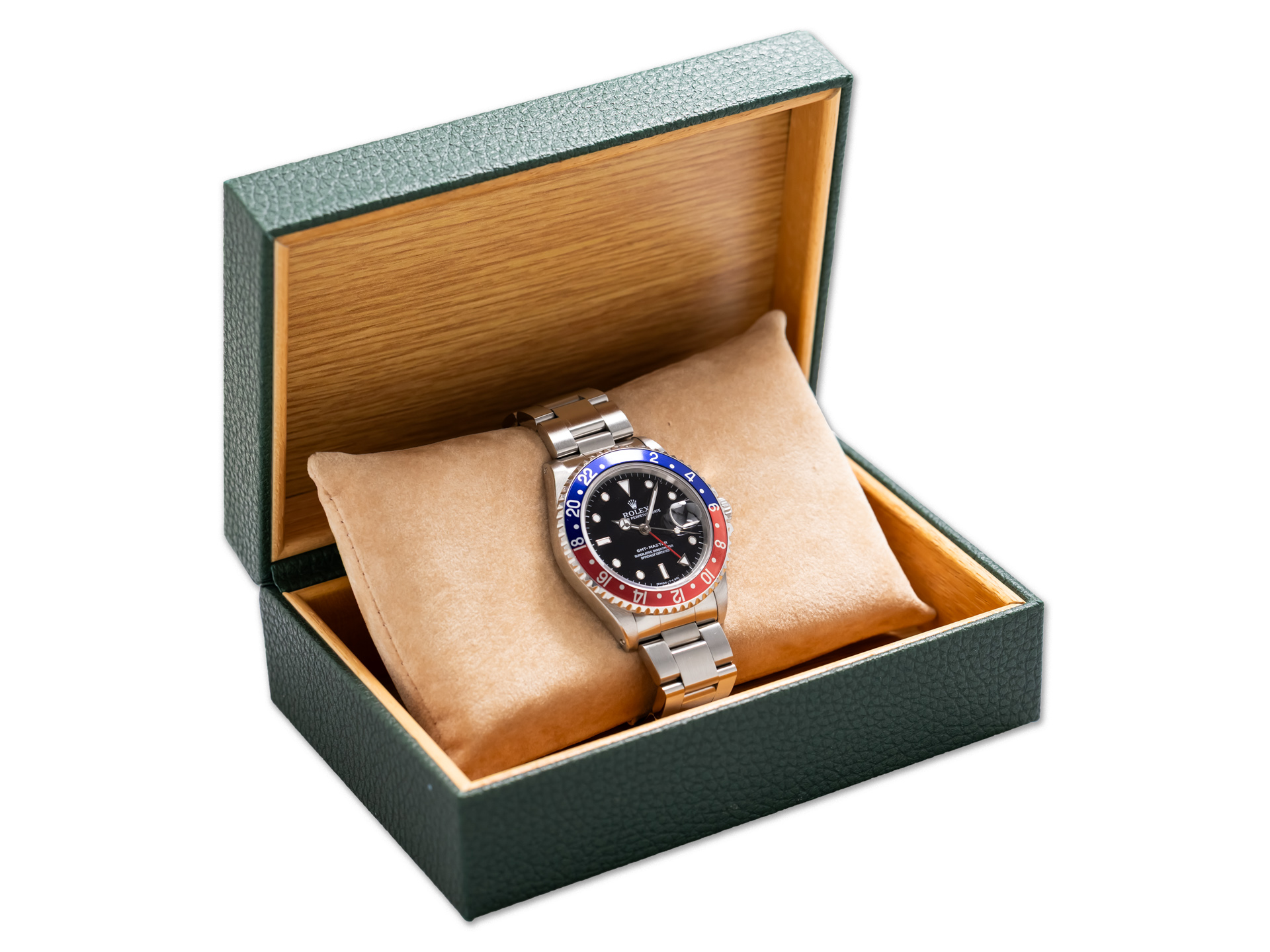 This example is presented in excellent overall condition, with crisp case lines, a beautifully vibrant Pepsi bezel insert, and a dial that has aged elegantly. Whether for daily wear or as a highlight in a curated collection, this watch stands as a timeless embodiment of Rolex’s tool-watch heritage.