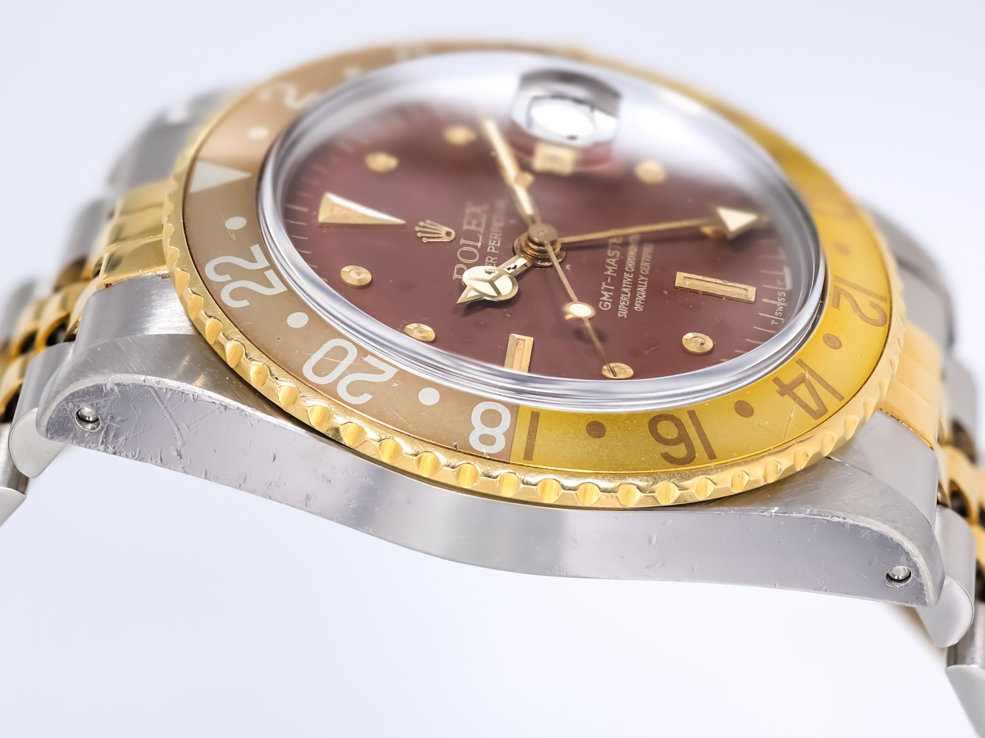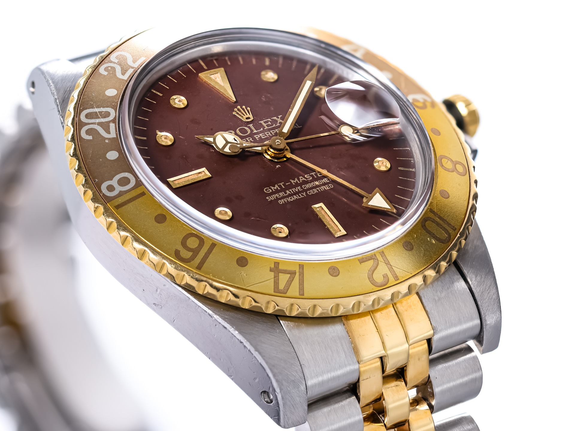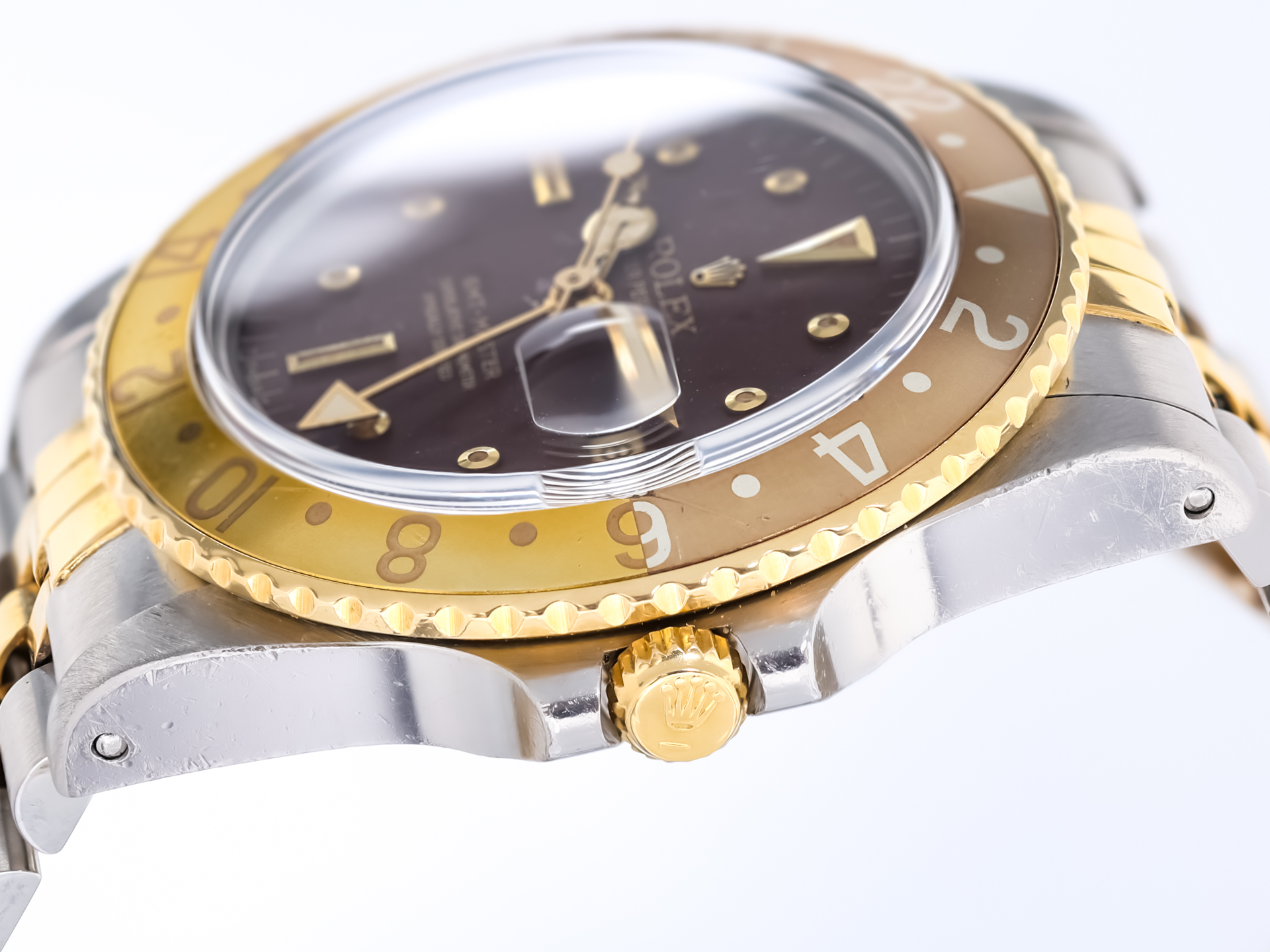 ROLEX Vintage GMT-MASTER Ref 16753 18k Yellow Gold Stainless Steel Jubilee Bracelet Tigereye Nipple Tritium Dial Box Papers Bj-1985 Just Serviced