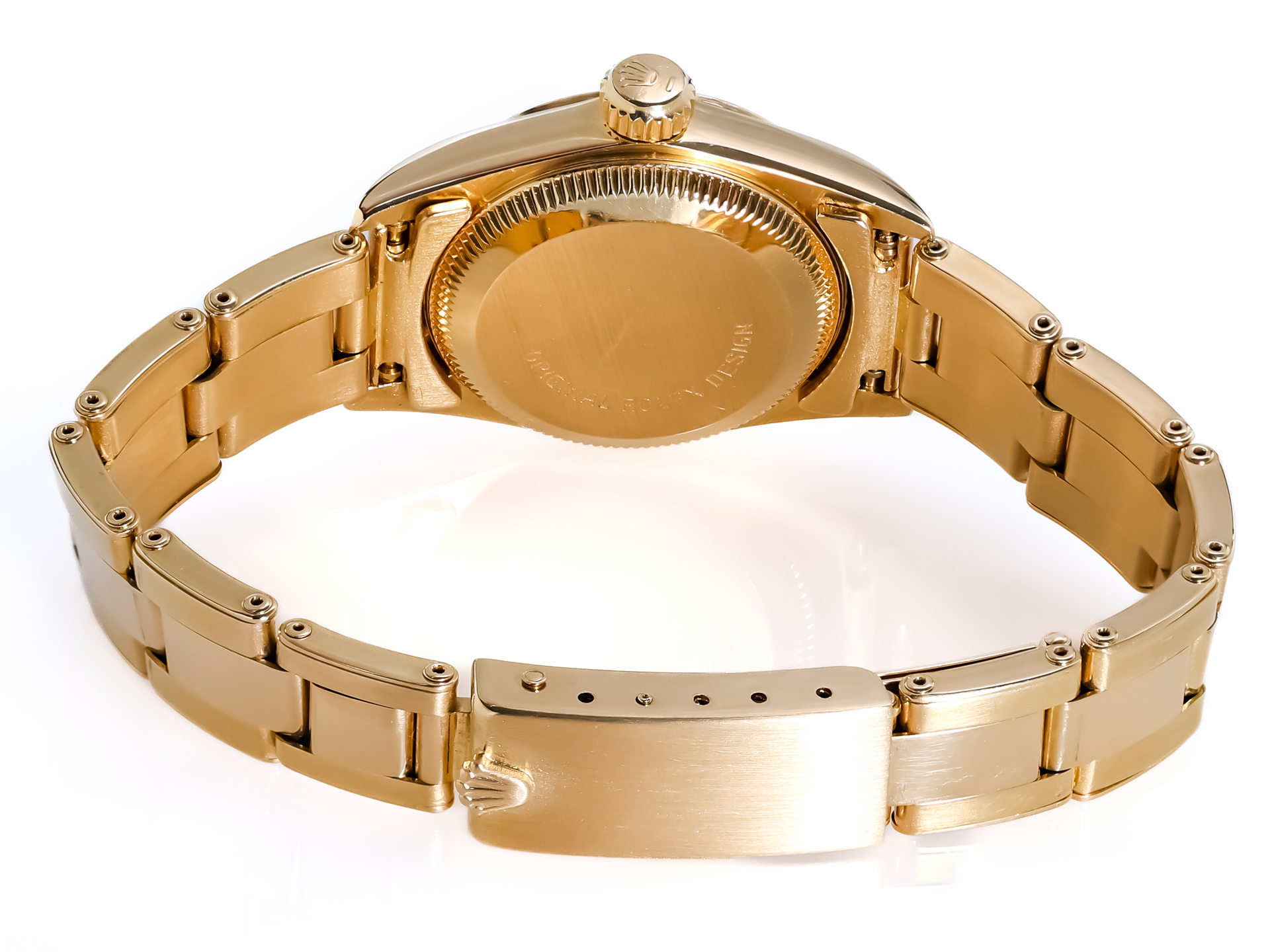 Inside beats the reliable Rolex automatic movement chosen for the Lady Oyster line, known for its durability, precision, and smooth operation. This mechanical foundation has contributed to the long-standing popularity and collectibility of these early gold Lady Oyster references.