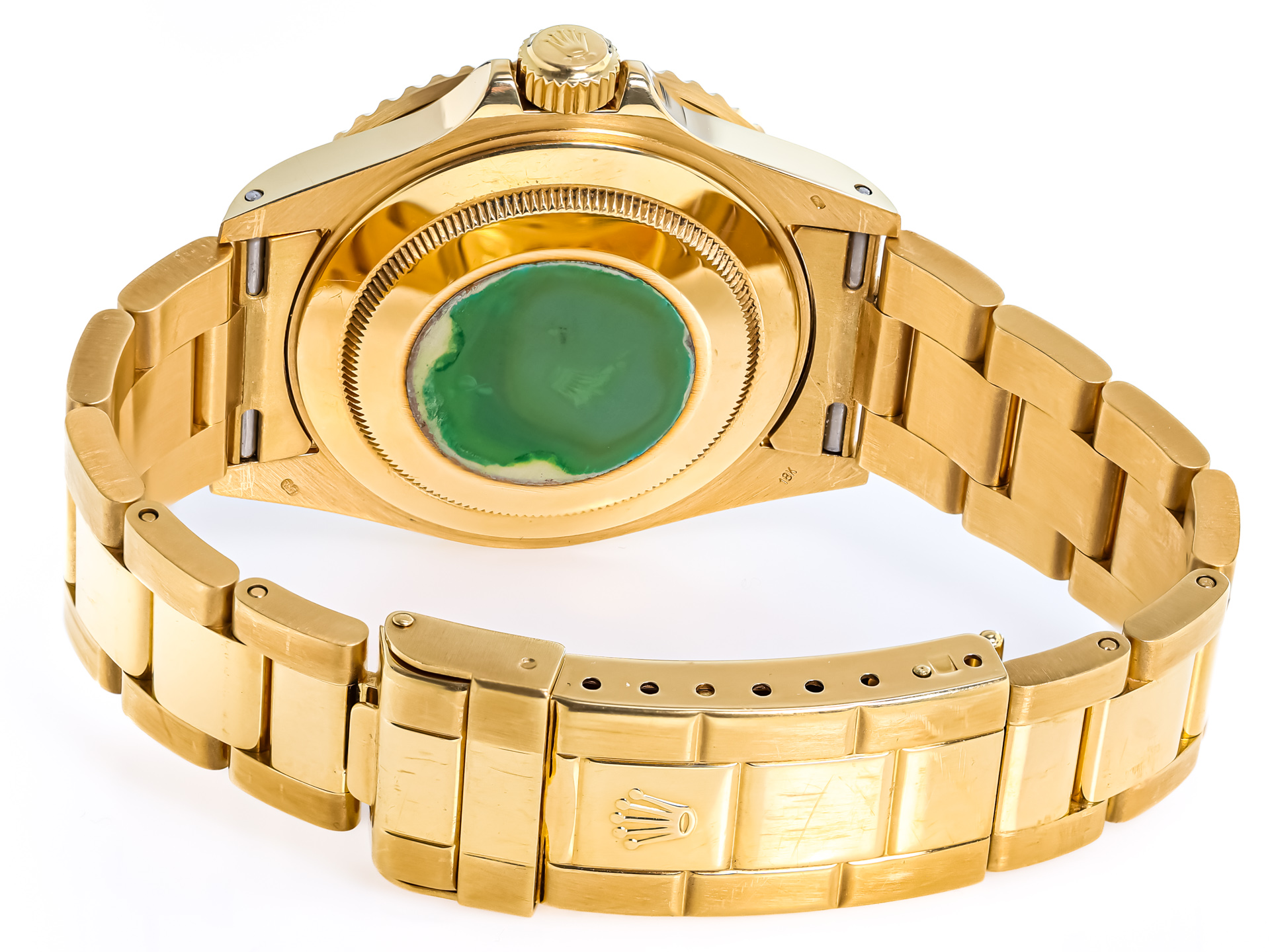 Crafted in 18k yellow gold, the 40 mm Oyster case delivers a striking blend of luxury and professional tool-watch design. The robust case construction, screw-down crown, and unidirectional bezel underscore the Submariner’s legendary underwater capability while elevating the watch with the unmistakable presence of precious metal.