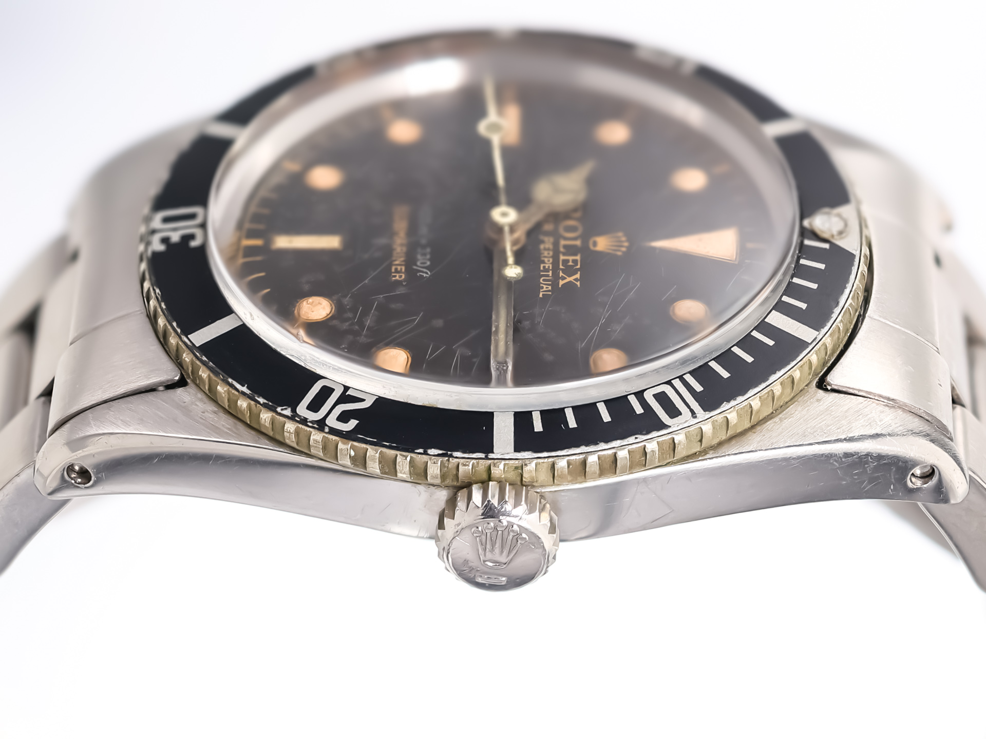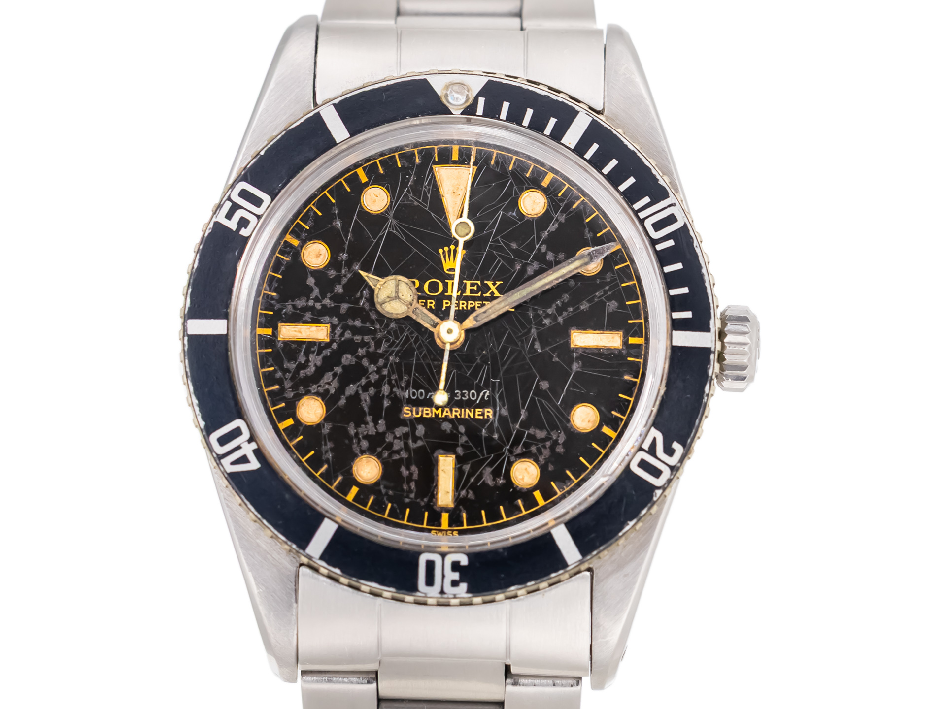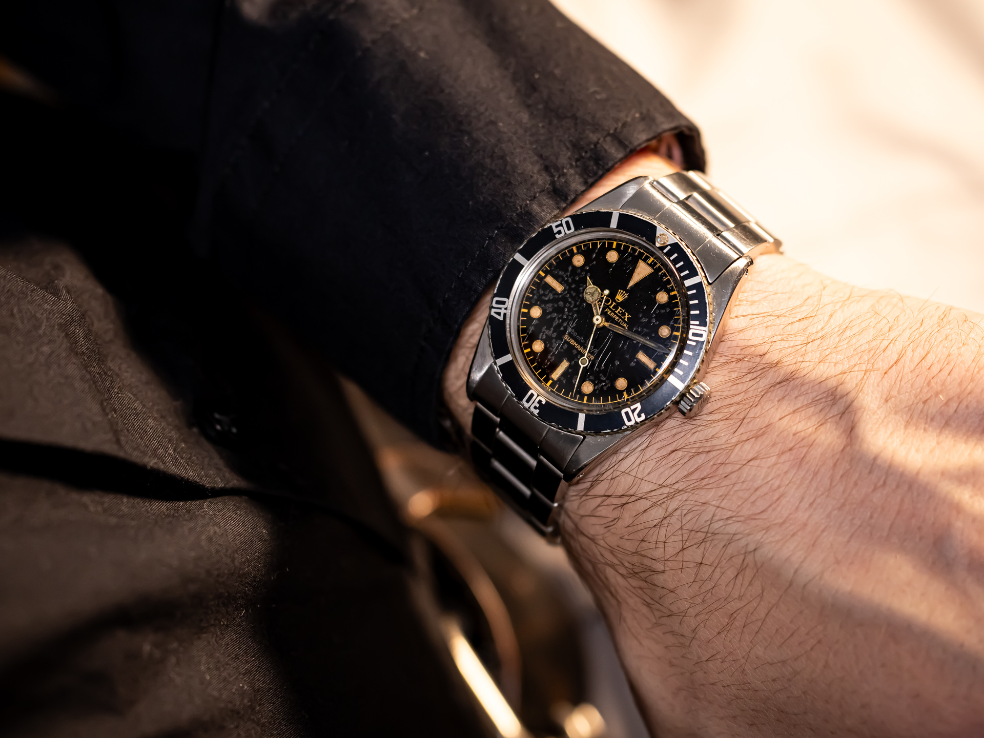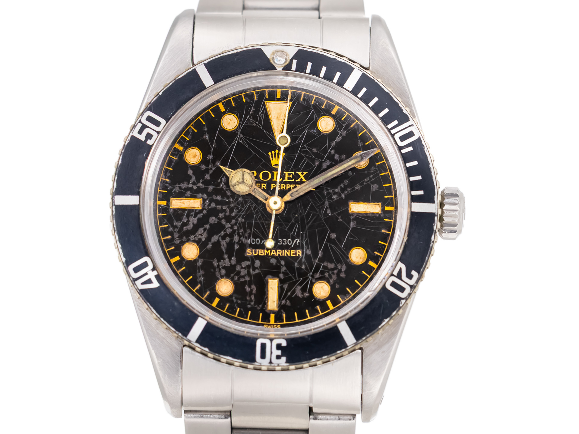 The glossy black dial is signed with the early gilt Rolex typography, paired with the iconic pencil hands and a small crown, further reinforcing its early-production charm. The watch is fitted with a period-correct rotating bezel, completing the classic Submariner silhouette that would later gain cinematic fame.