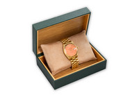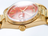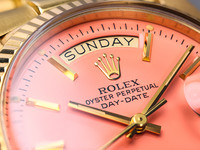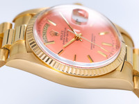 Produced circa 1974, this reference belongs to the golden era of Rolex Day-Date production, when the brand experimented with bold lacquered “Stella” dials created for select markets and elite clientele. The salmon coral enamel dial, with its rich depth of color and glossy finish, is exceptionally scarce and remains one of the most sought-after variants among serious collectors.