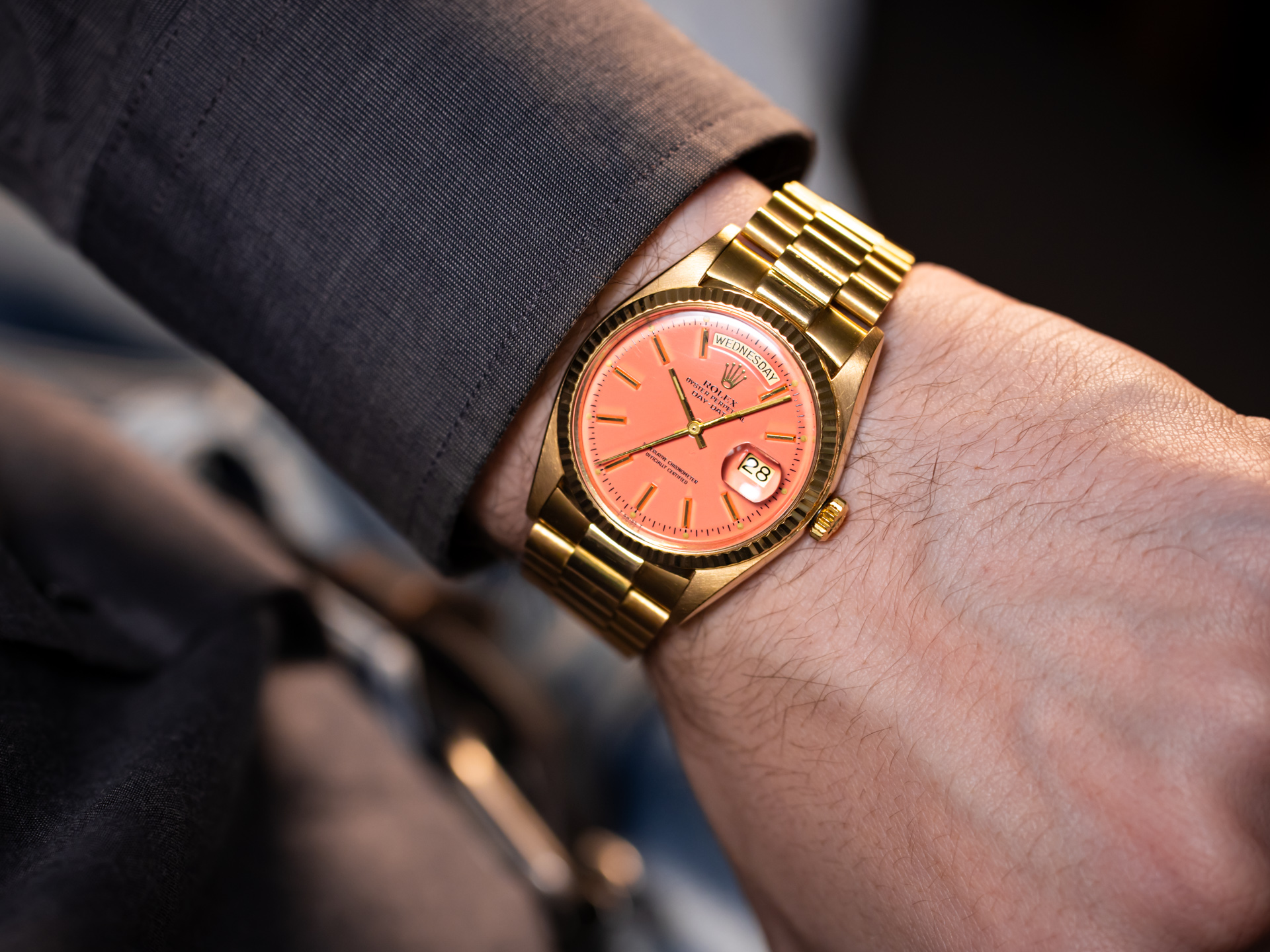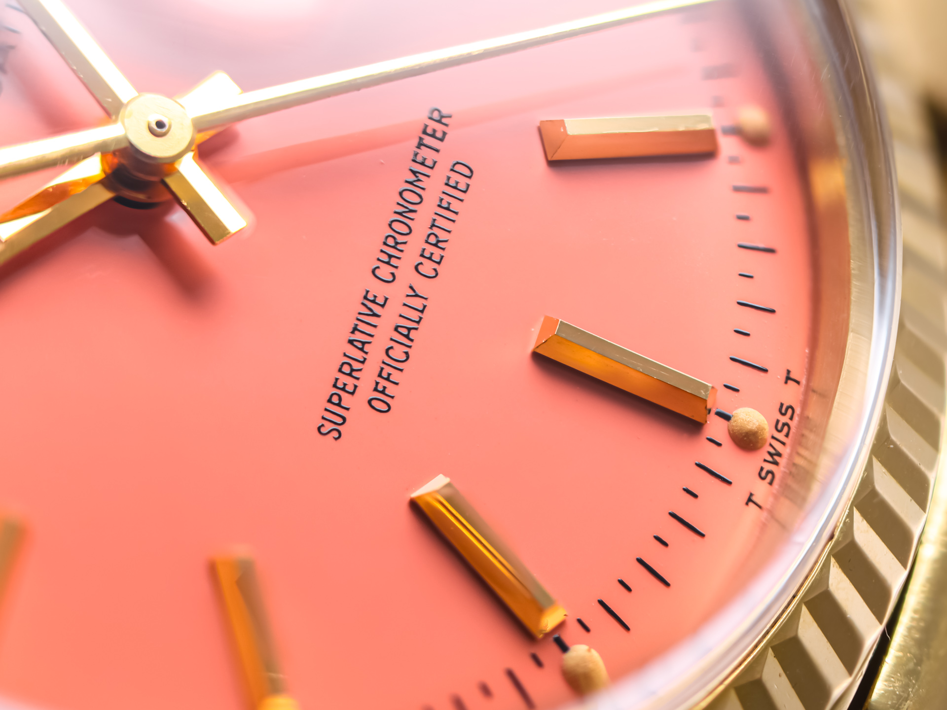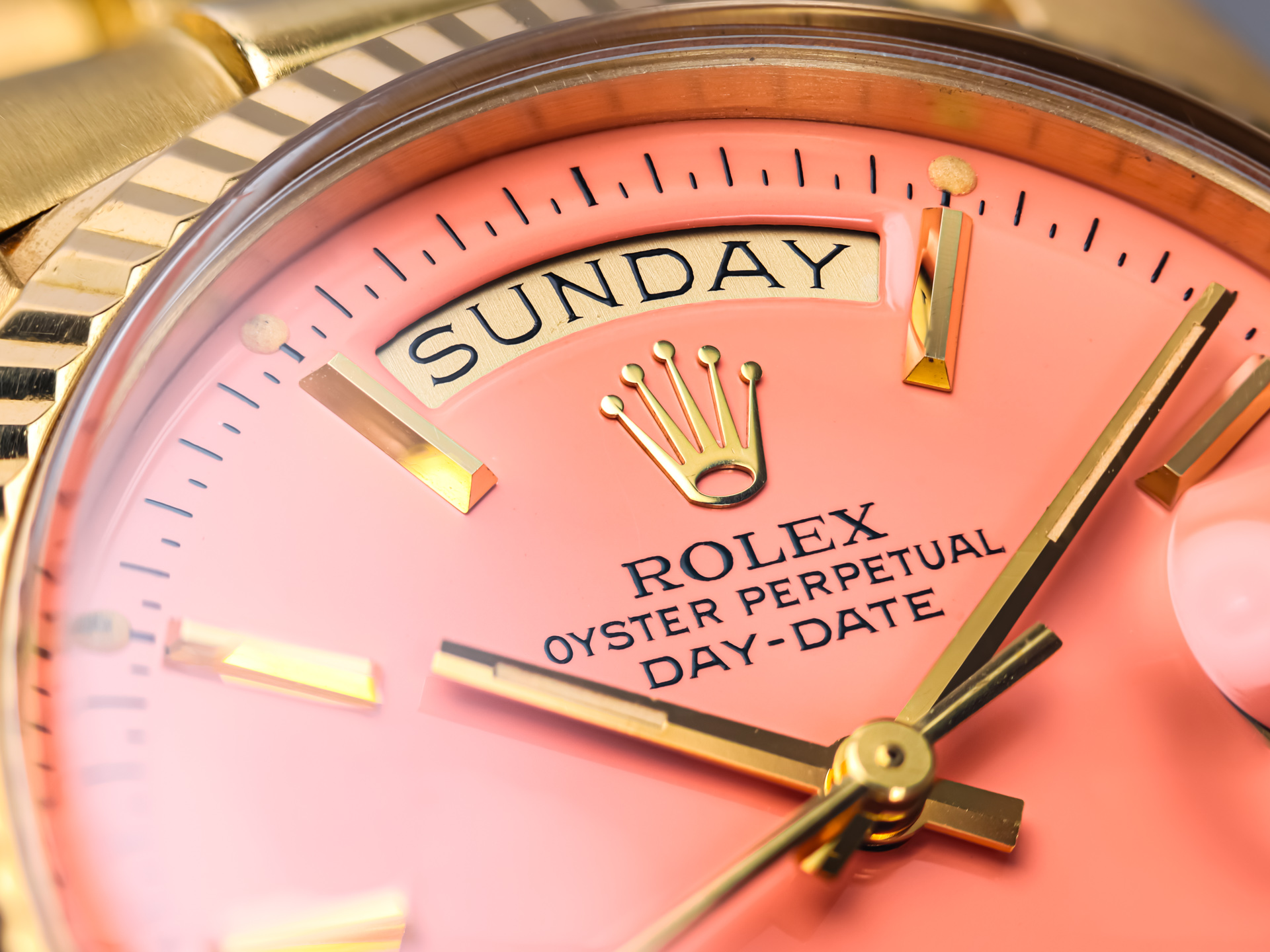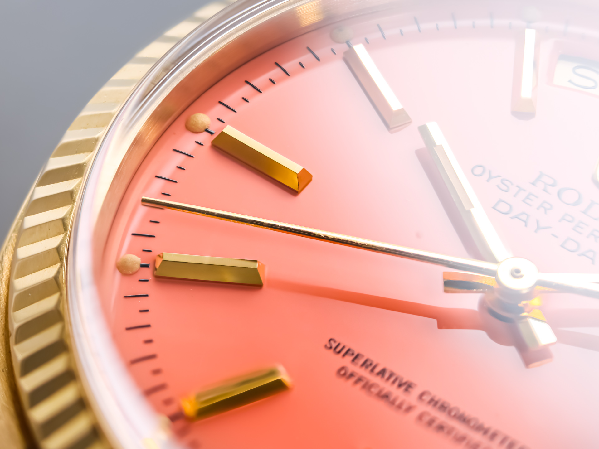 "Combining exceptional rarity, historical importance, and striking visual appeal, this Rolex Day-Date Ref. 1803 Stella Salmon Coral Enamel Dial, Asprey-signed stands as a true trophy piece. An outstanding opportunity for the discerning collector seeking a museum-quality vintage Rolex with unmatched character and provenance.“