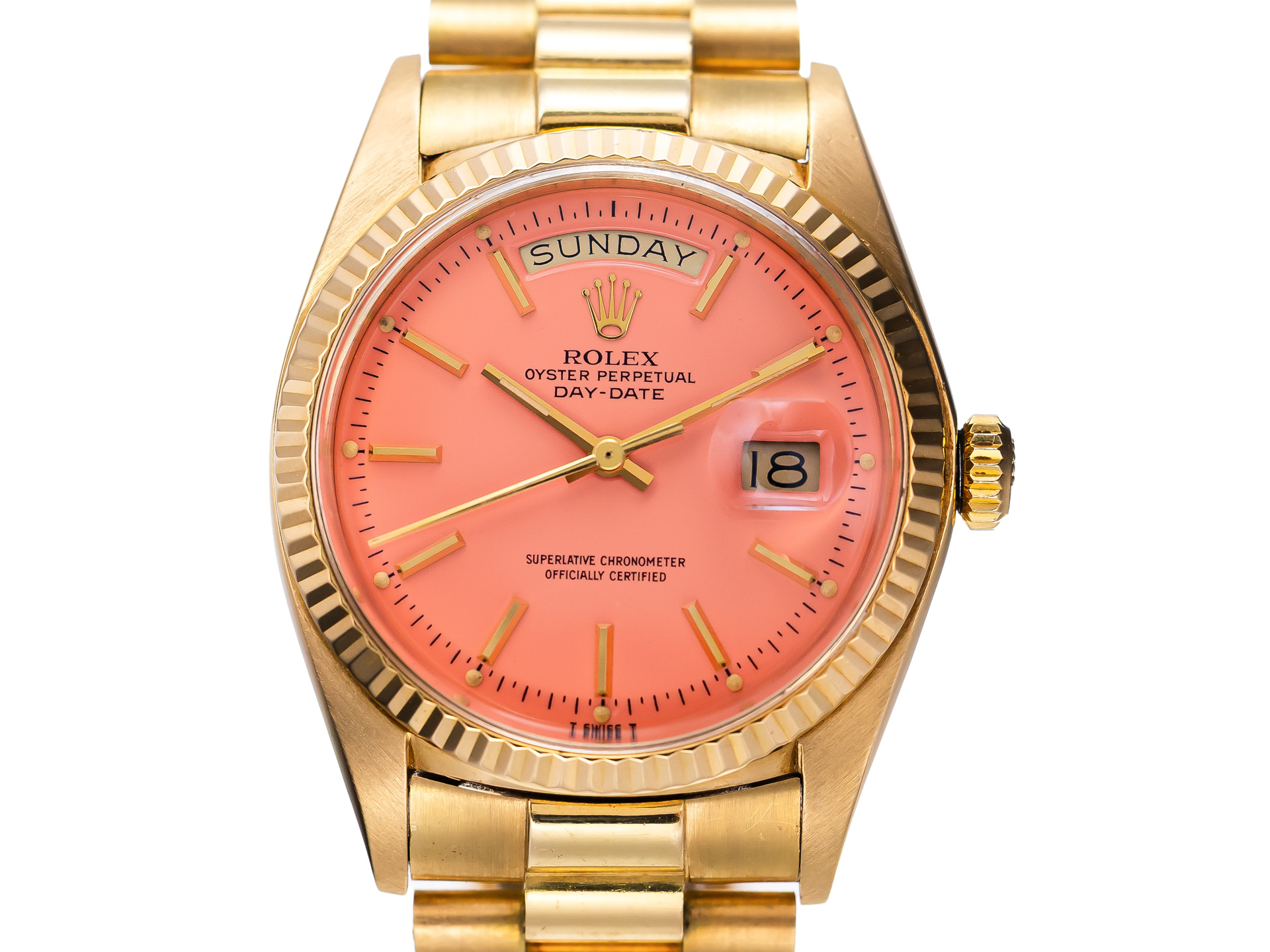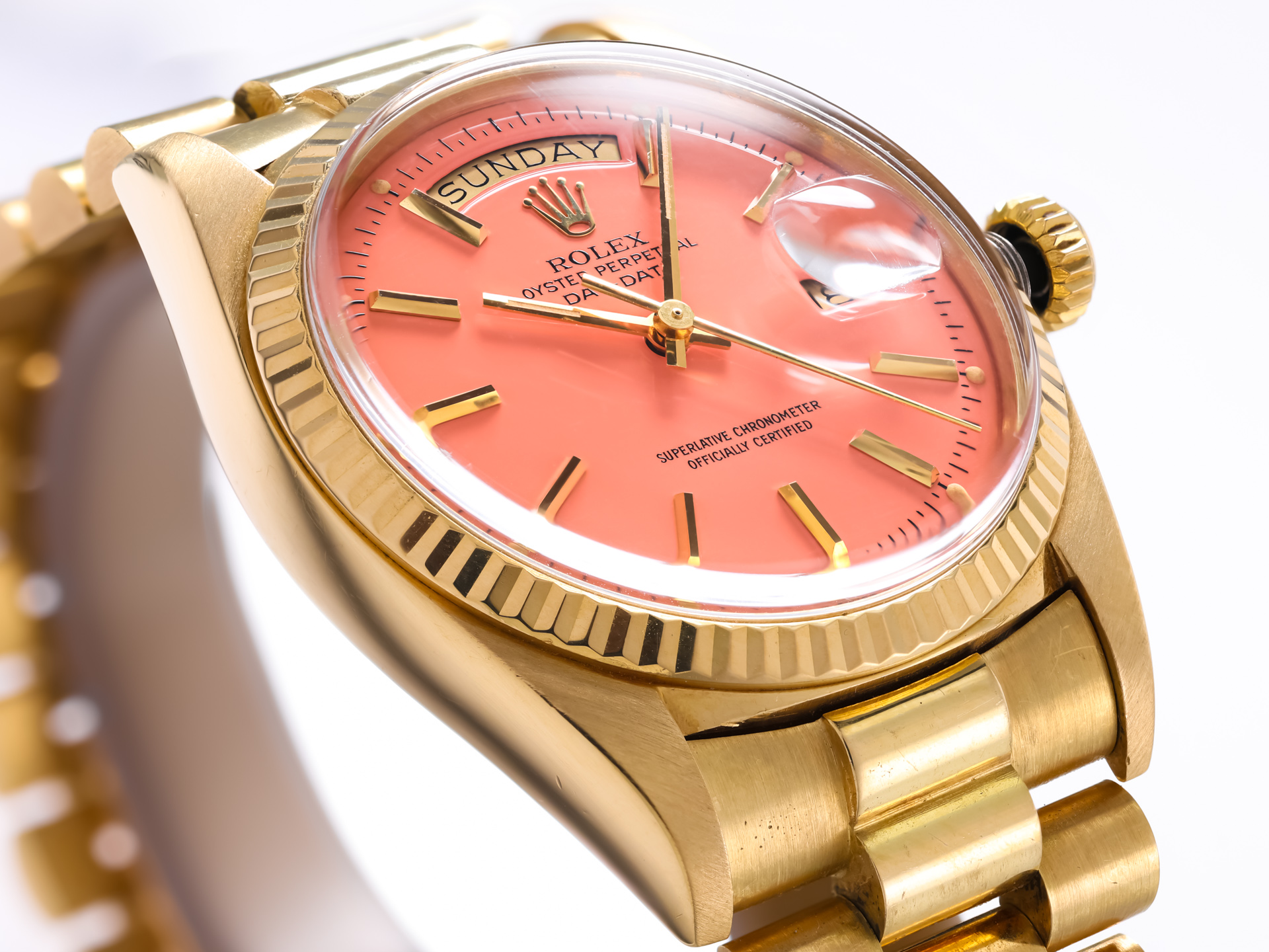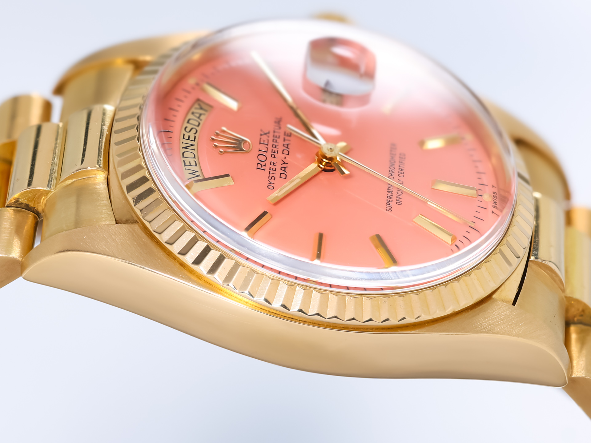 ROLEX Vintage Day-Date “Stella” Salmon Coral Enamel Dial Ref. 1803 – Asprey – 18k Yellow Gold President – Circa 1974