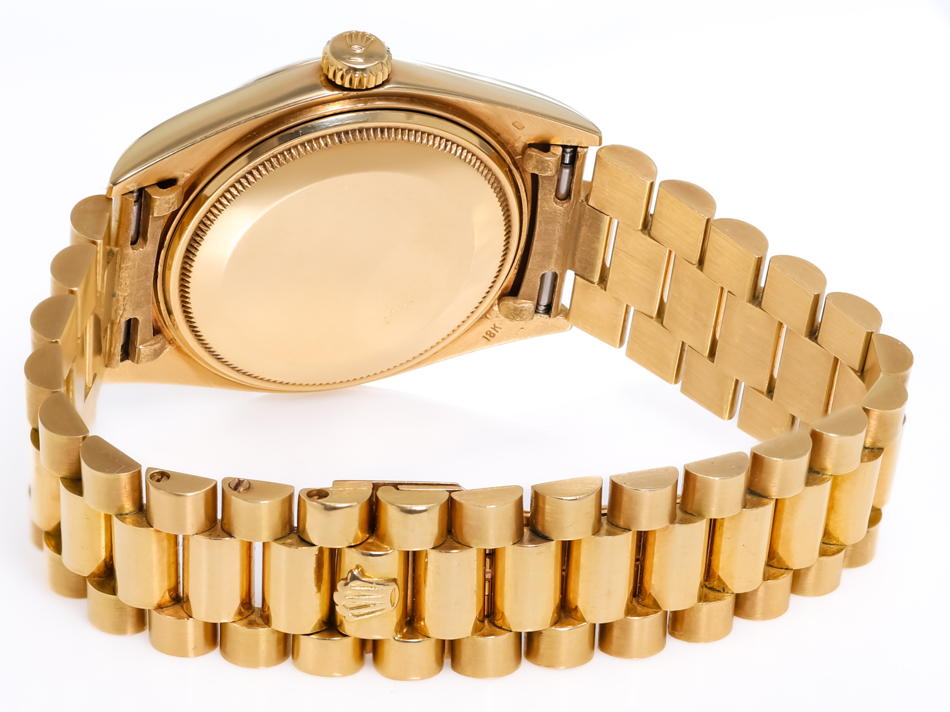 The watch is fitted with its iconic 18k yellow gold President bracelet, offering both comfort and unmistakable presence. The classic 36 mm case retains strong proportions, while the fluted bezel, applied gold hour markers, and matching hands create a perfectly balanced and timeless aesthetic.