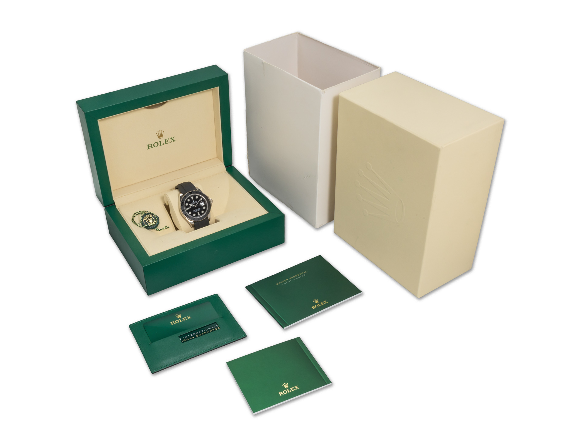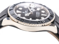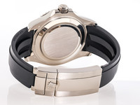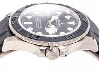 We are delighted to present you this excellent Rolex Yachtmaster in 18k white gold on its black rubber bracelet and 18K white gold folding clasp.