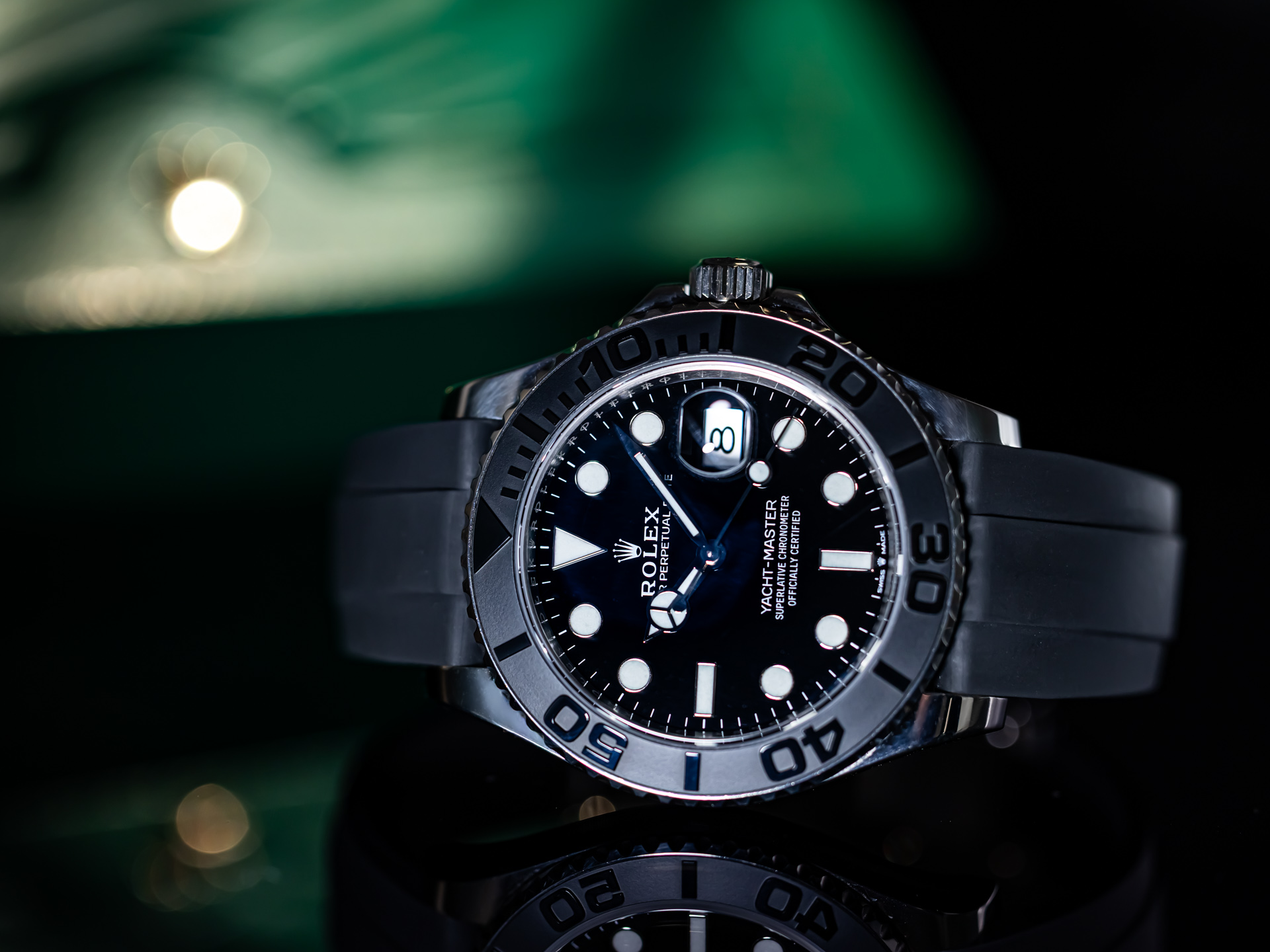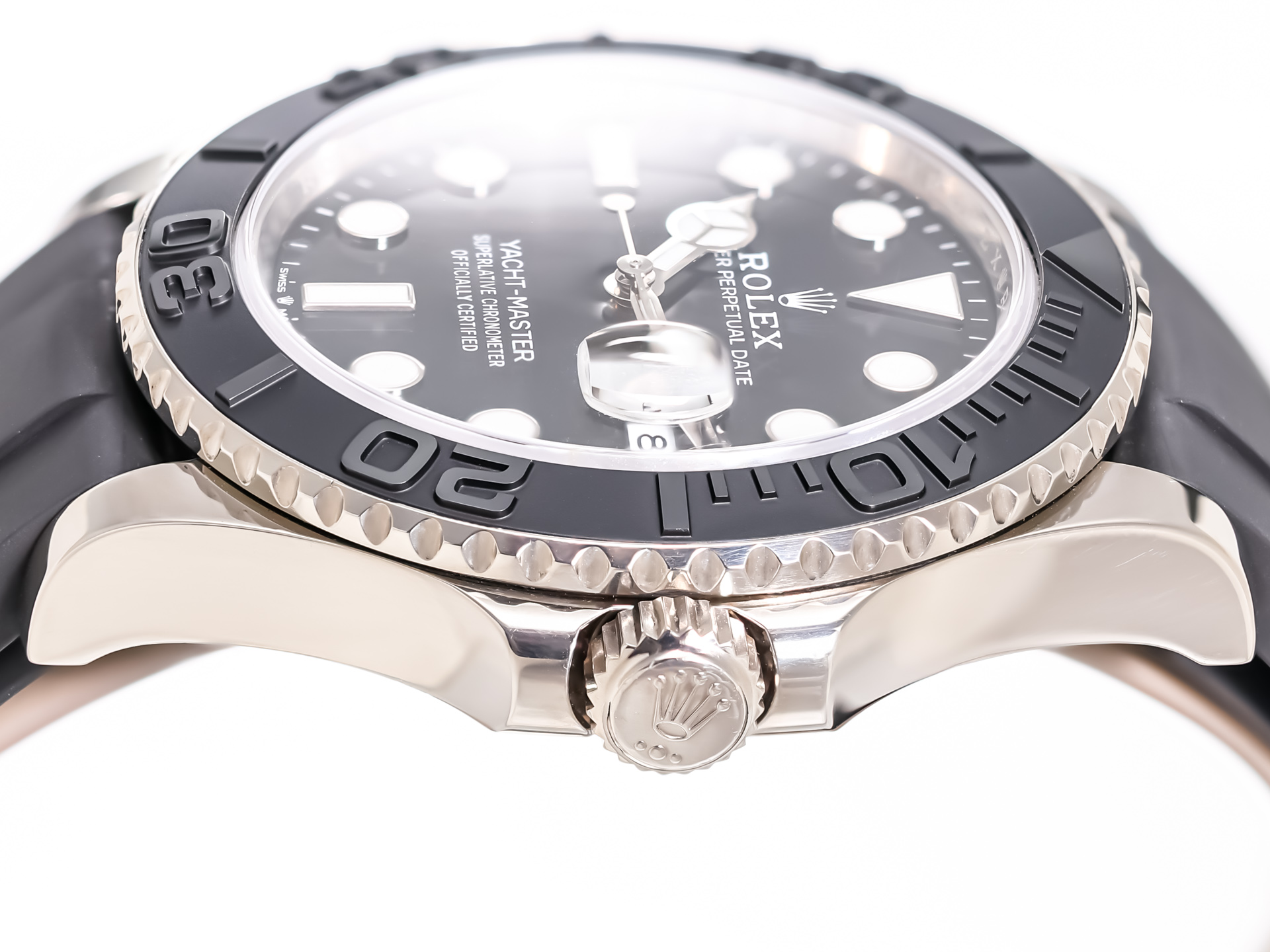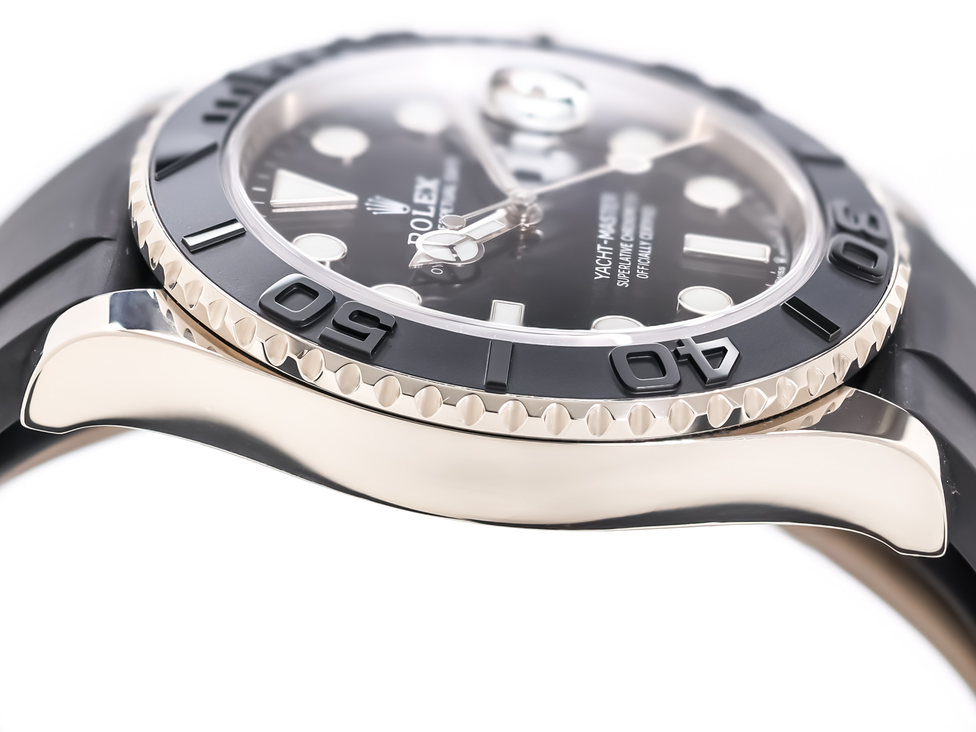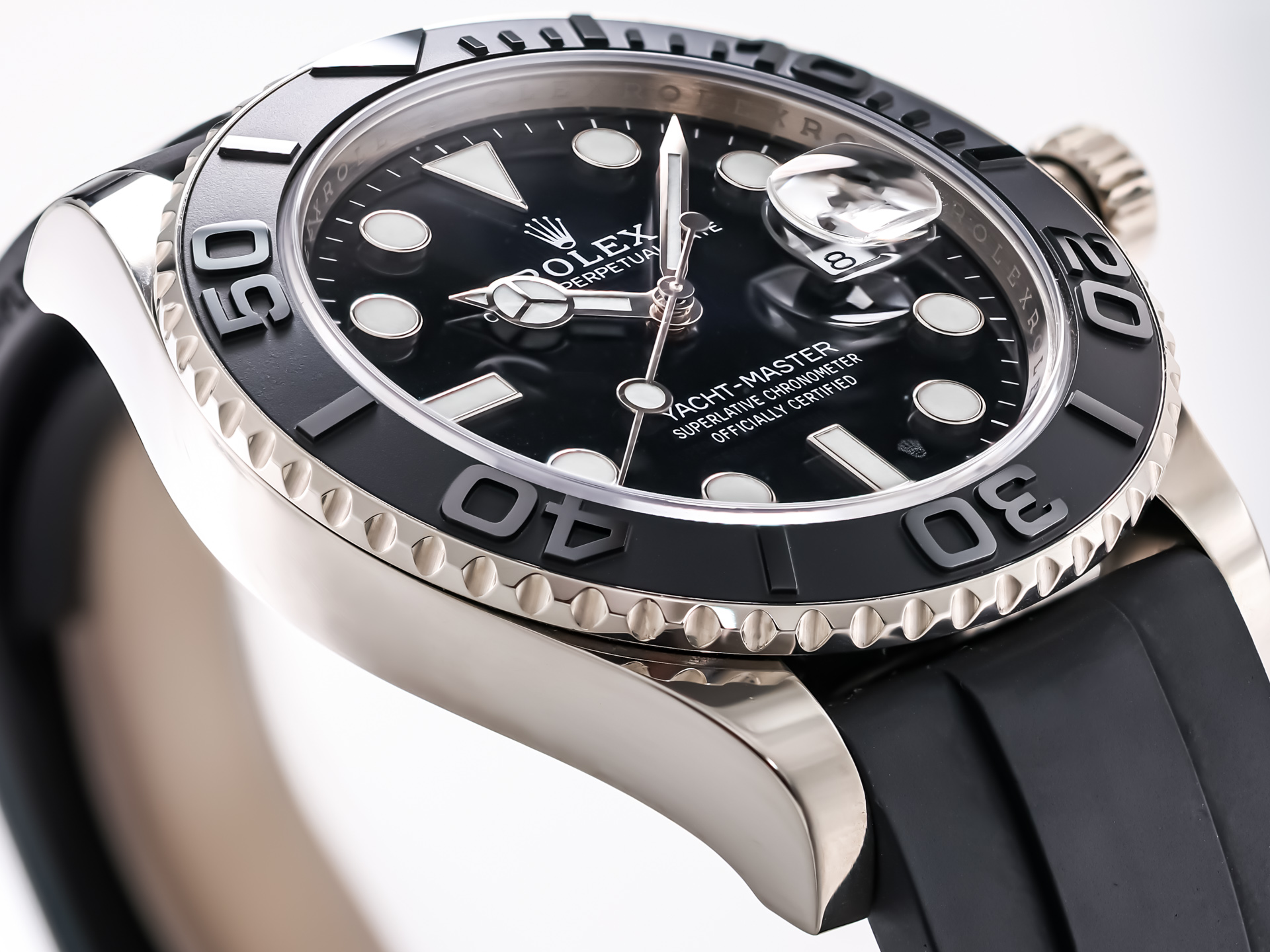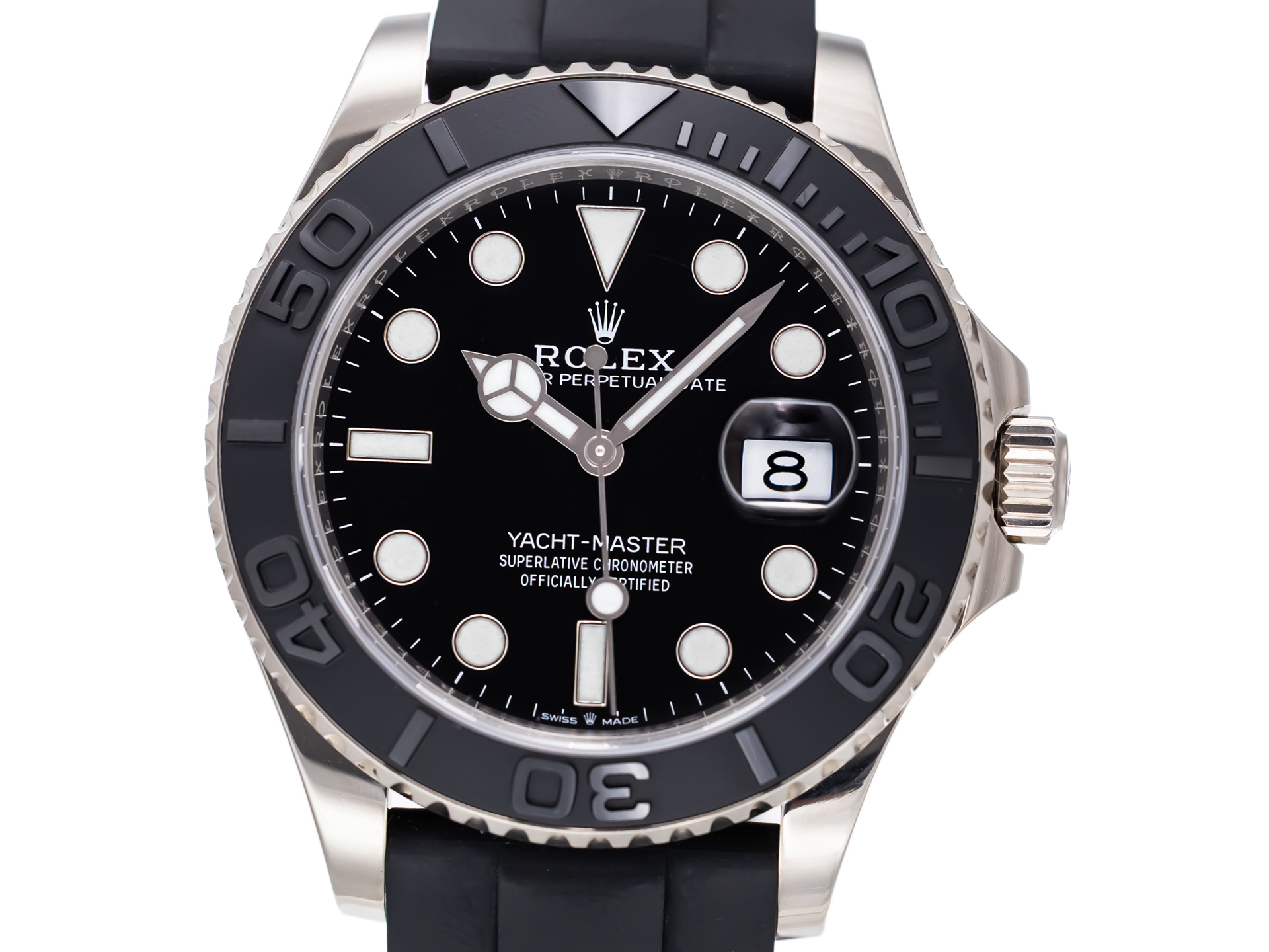 The Rolex Yacht-Master 42 (Ref. 226659) is a watch for connoisseurs - sporty, stylish and exceptionally refined. Crafted from precious 18K white gold paired with the sportive black Rolex Oyster-flex bracelet .