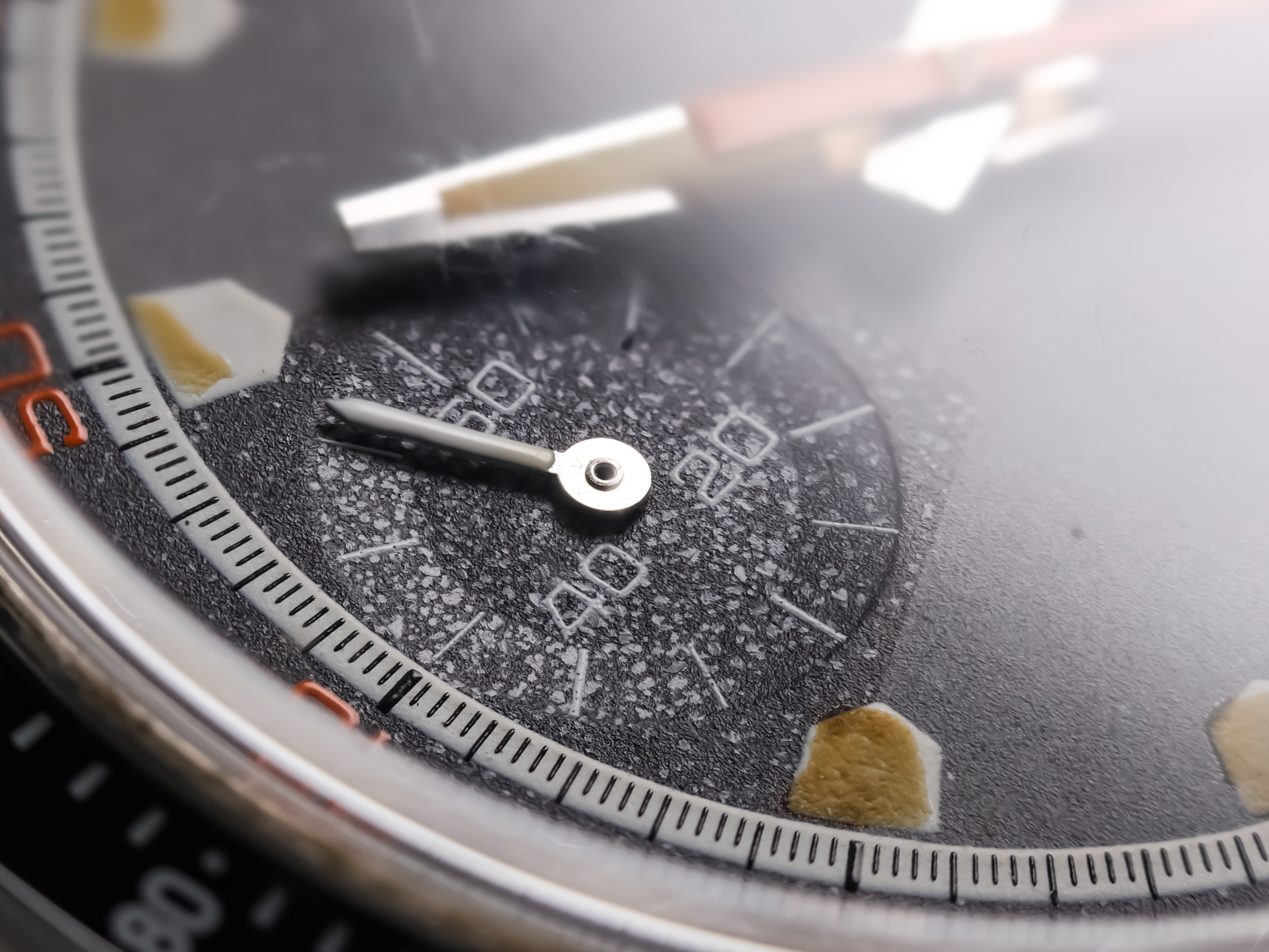 The standout feature of this reference is its iconic “Homeplate” dial, named after the unique pentagonal hour markers reminiscent of a baseball home plate. Executed in a rich grey tone, the dial is enhanced by contrasting chronograph registers and warm tritium lume and so are the Tritum hands, which has aged gracefully over time. The result is a dial full of depth, character, and unmistakable vintage charm.