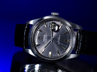 Housed in a stainless steel Oyster case, the watch features a clean and well-balanced dial layout with both day and date apertures, a defining characteristic of the Day-Date line. The dark grey dial has aged beautifully and is fitted with original tritium hour markers, now displaying a warm and even patina that enhances its vintage character.