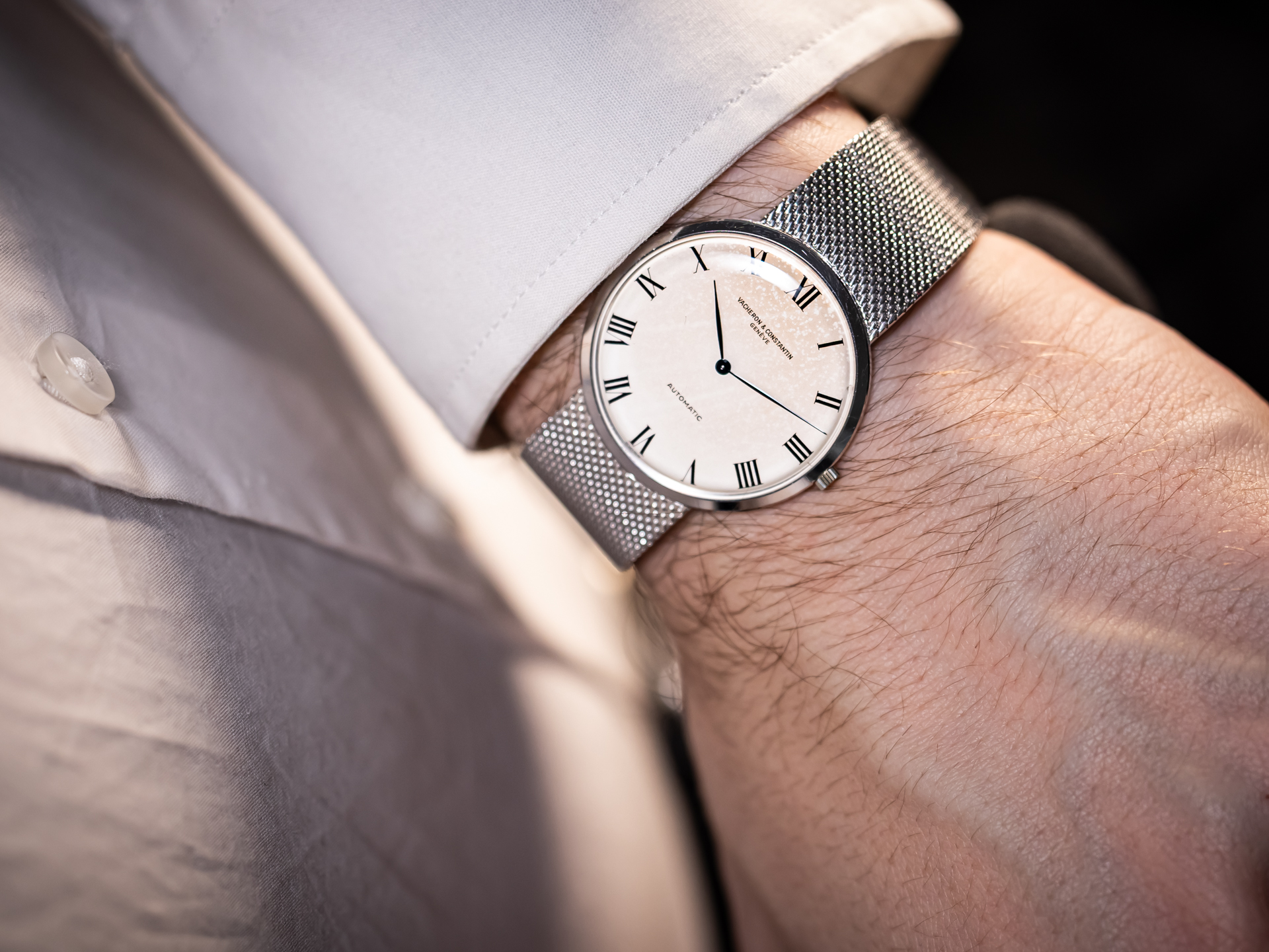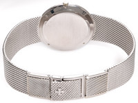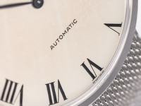 The slim white gold case showcases clean lines and balanced proportions, offering a timeless silhouette that sits effortlessly on the wrist. Its understated elegance is further enhanced by the integrated 18k white gold Milanese bracelet, which provides exceptional comfort while adding a distinctive vintage character and refined texture.
