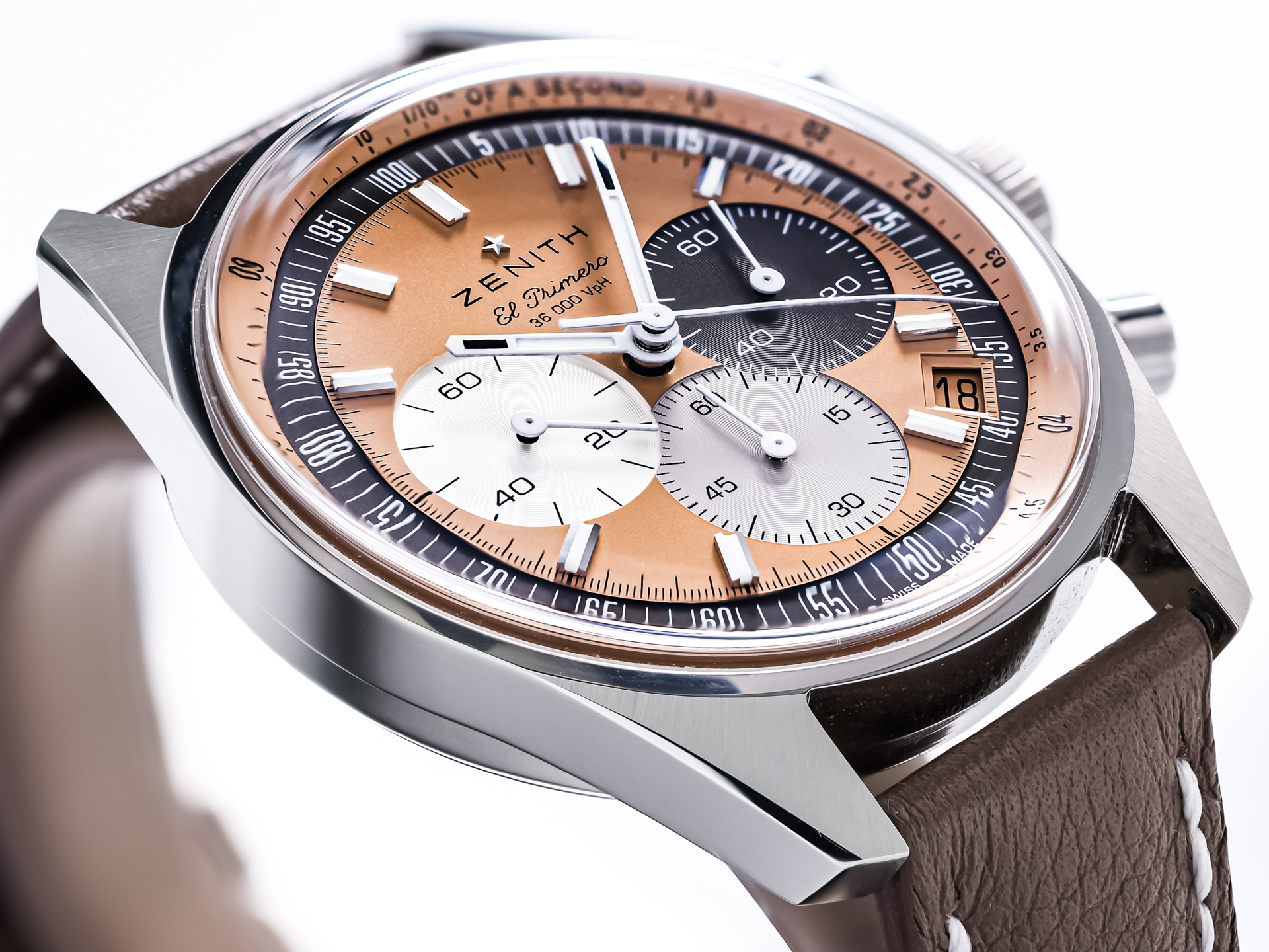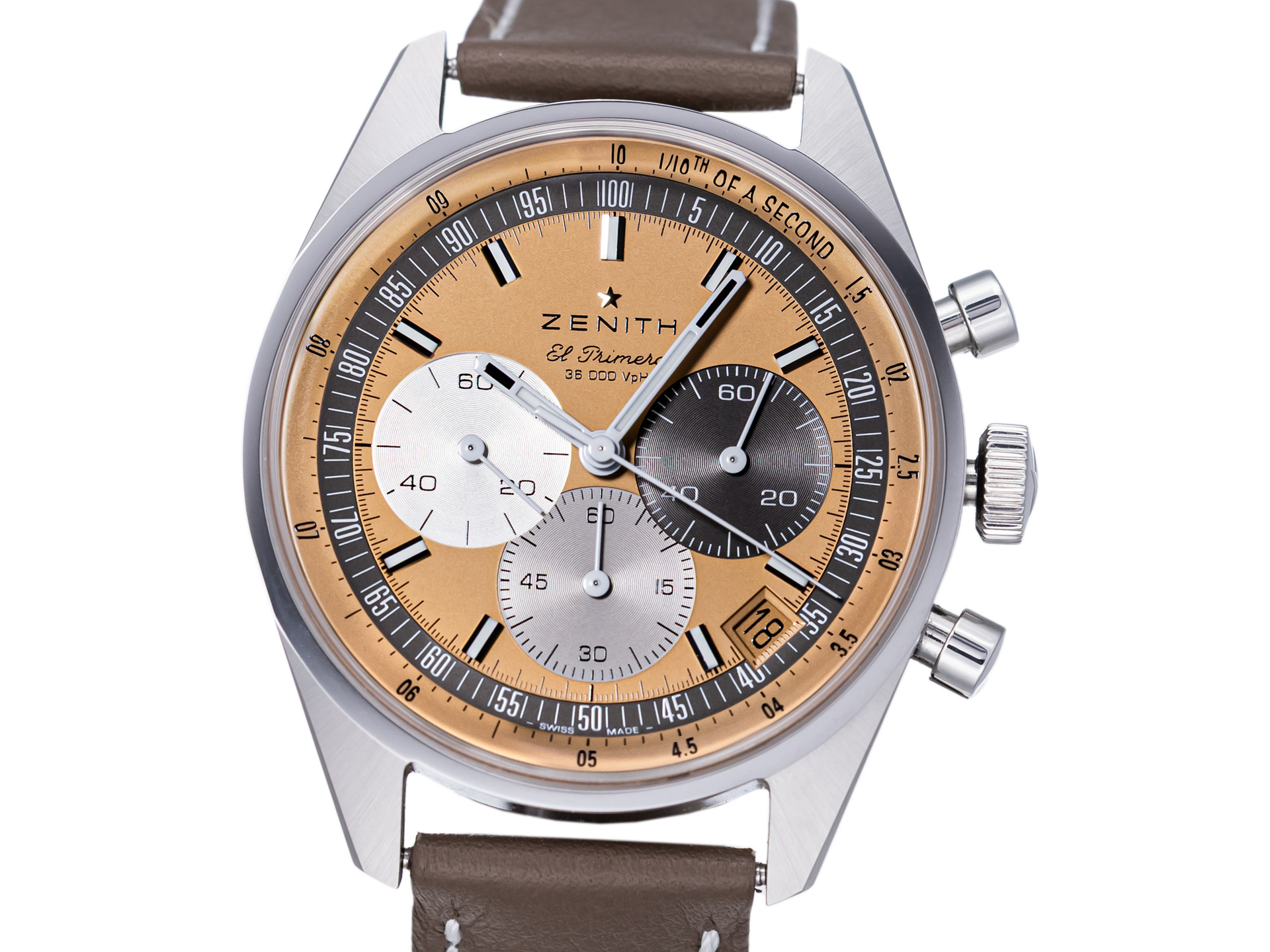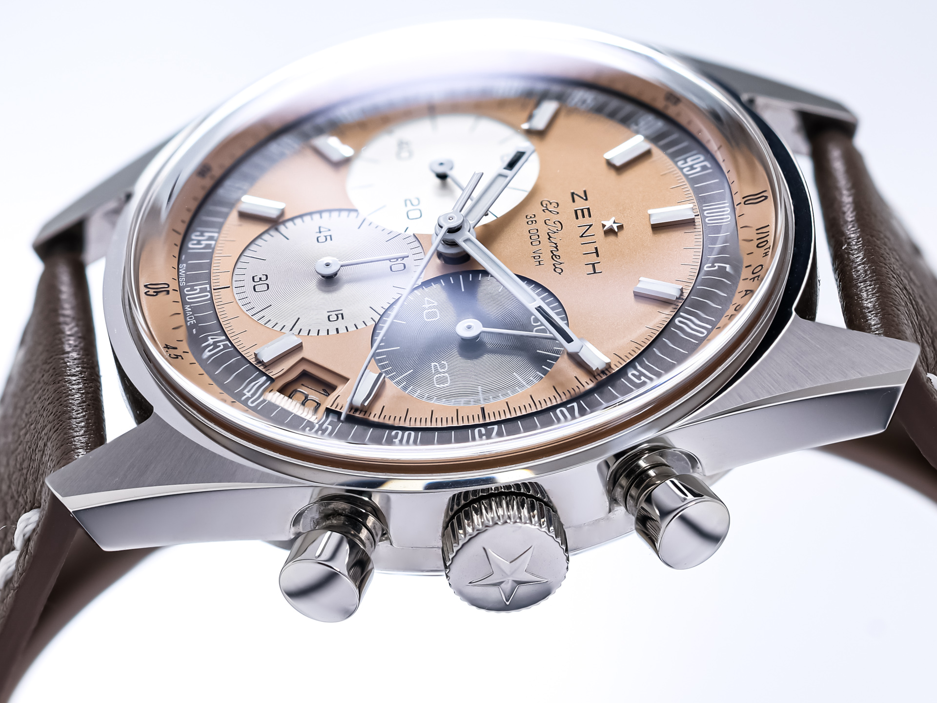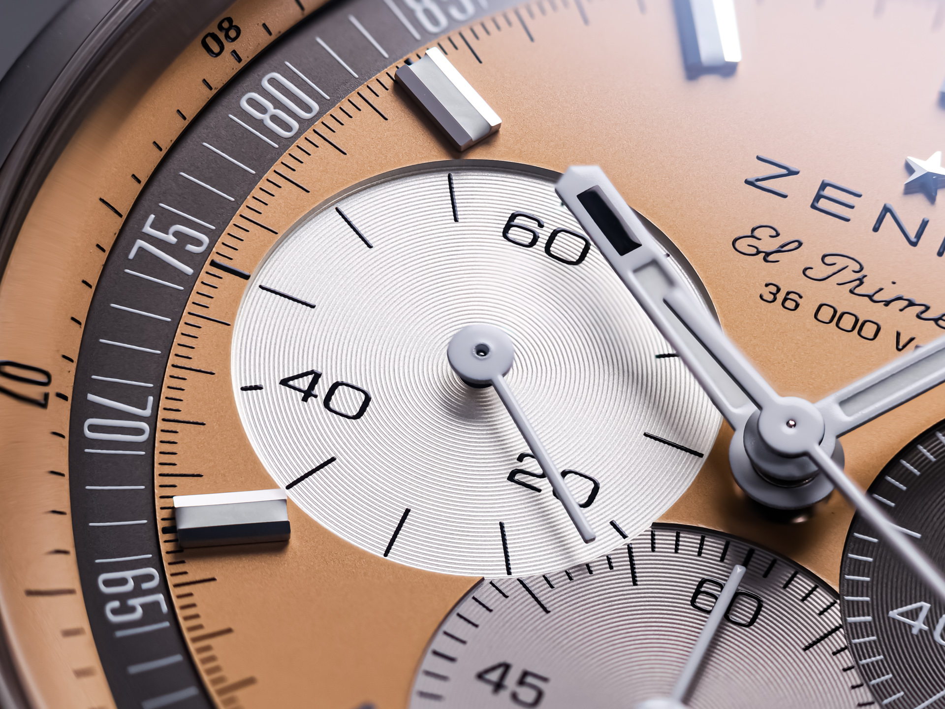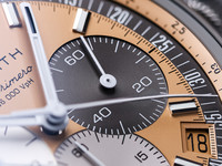 Particularly noteworthy is the elaborately designed dial, which impresses with its perfect balance of functionality and aesthetics.The dial is a unique matte salmon-colored dial with three overlapping galvanic subdials in taupe and silver tones.The clearly legible applied indices and luminous hands guarantee excellent readability day and night. The central chronograph hand completes a full rotation in just ten seconds, bringing the unique 1/10-second display of the El Primero movement to life – a technical highlight that is directly reflected on the dial.
