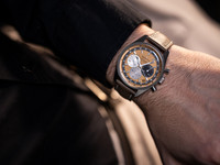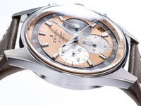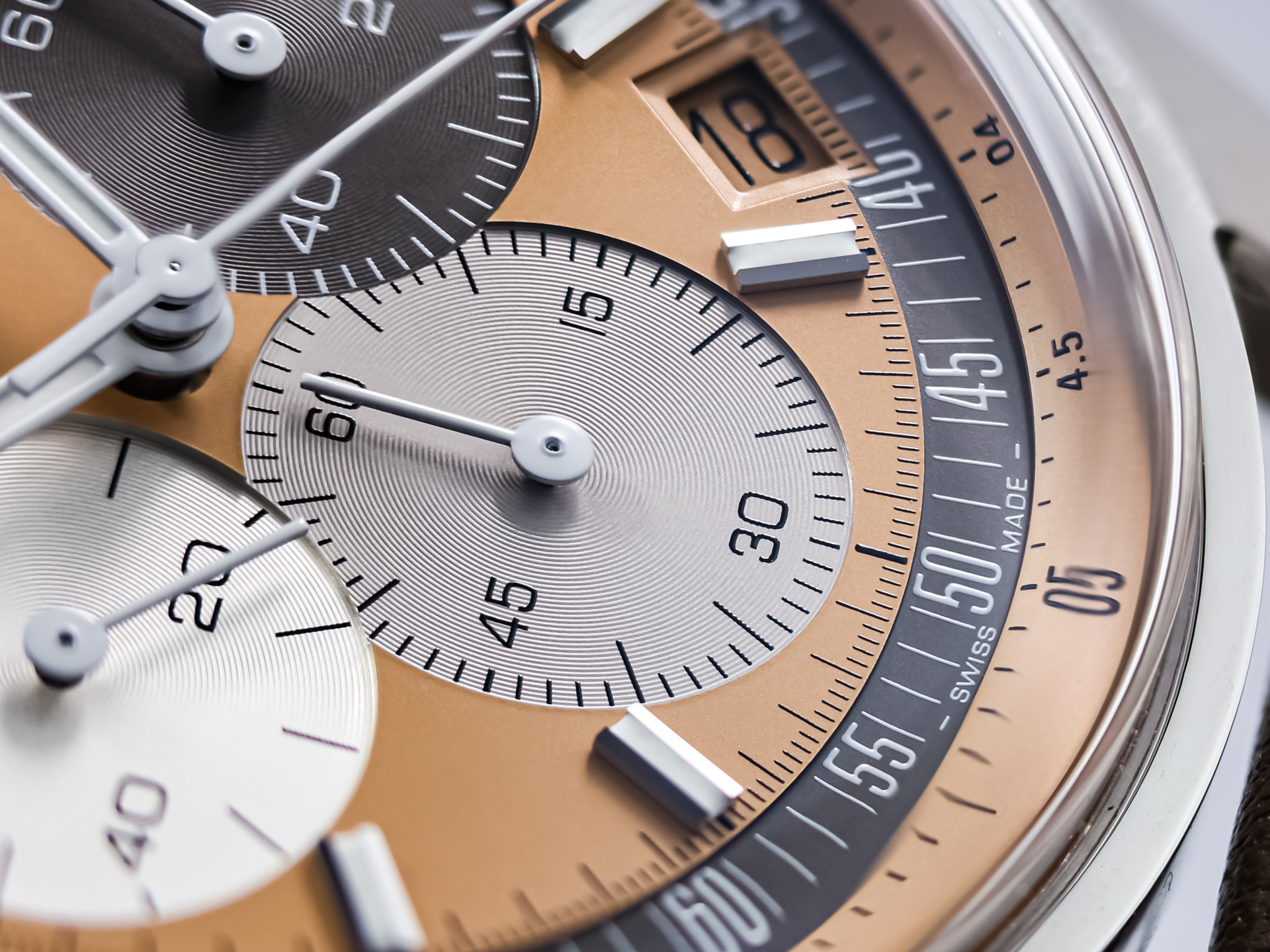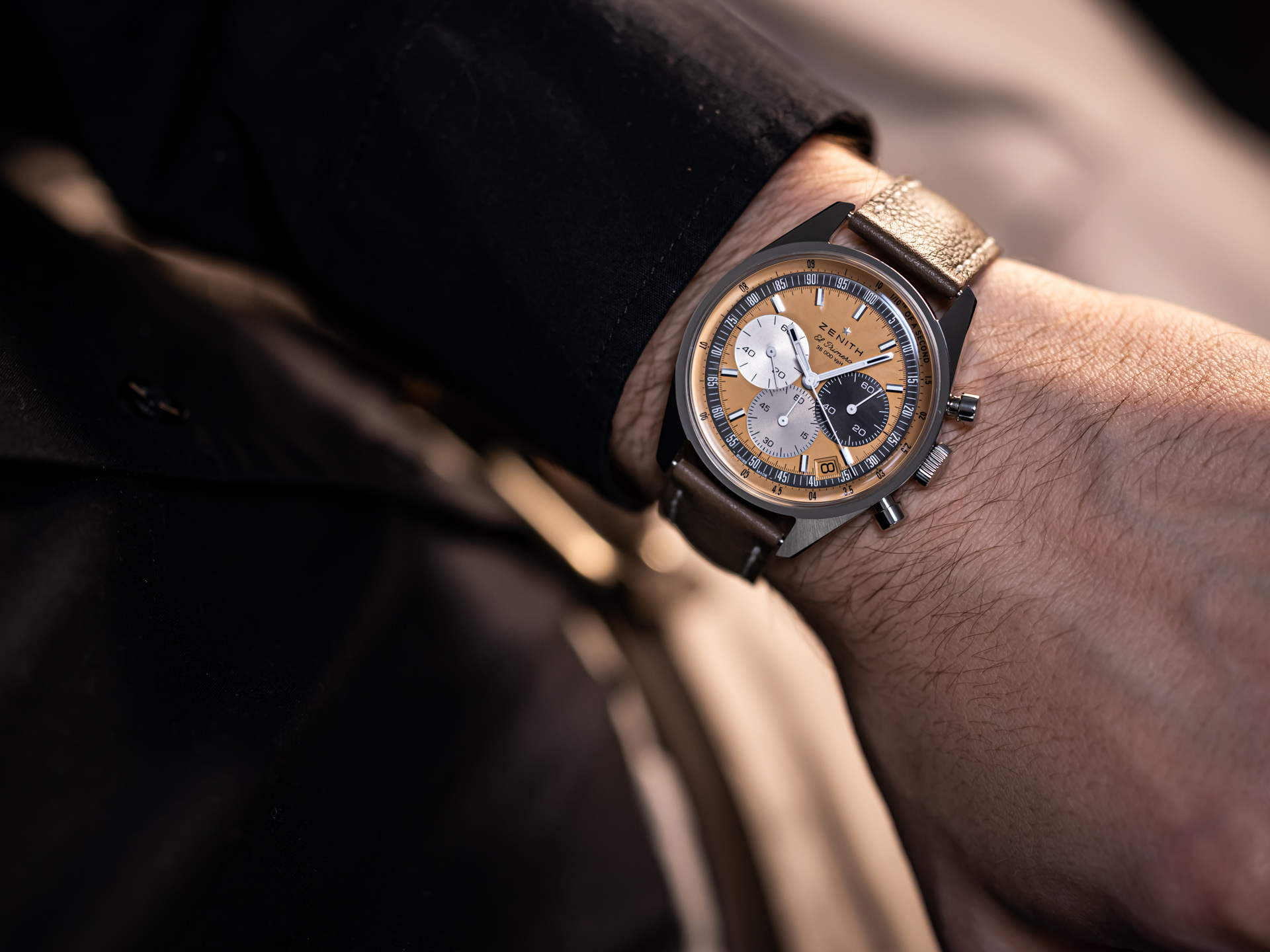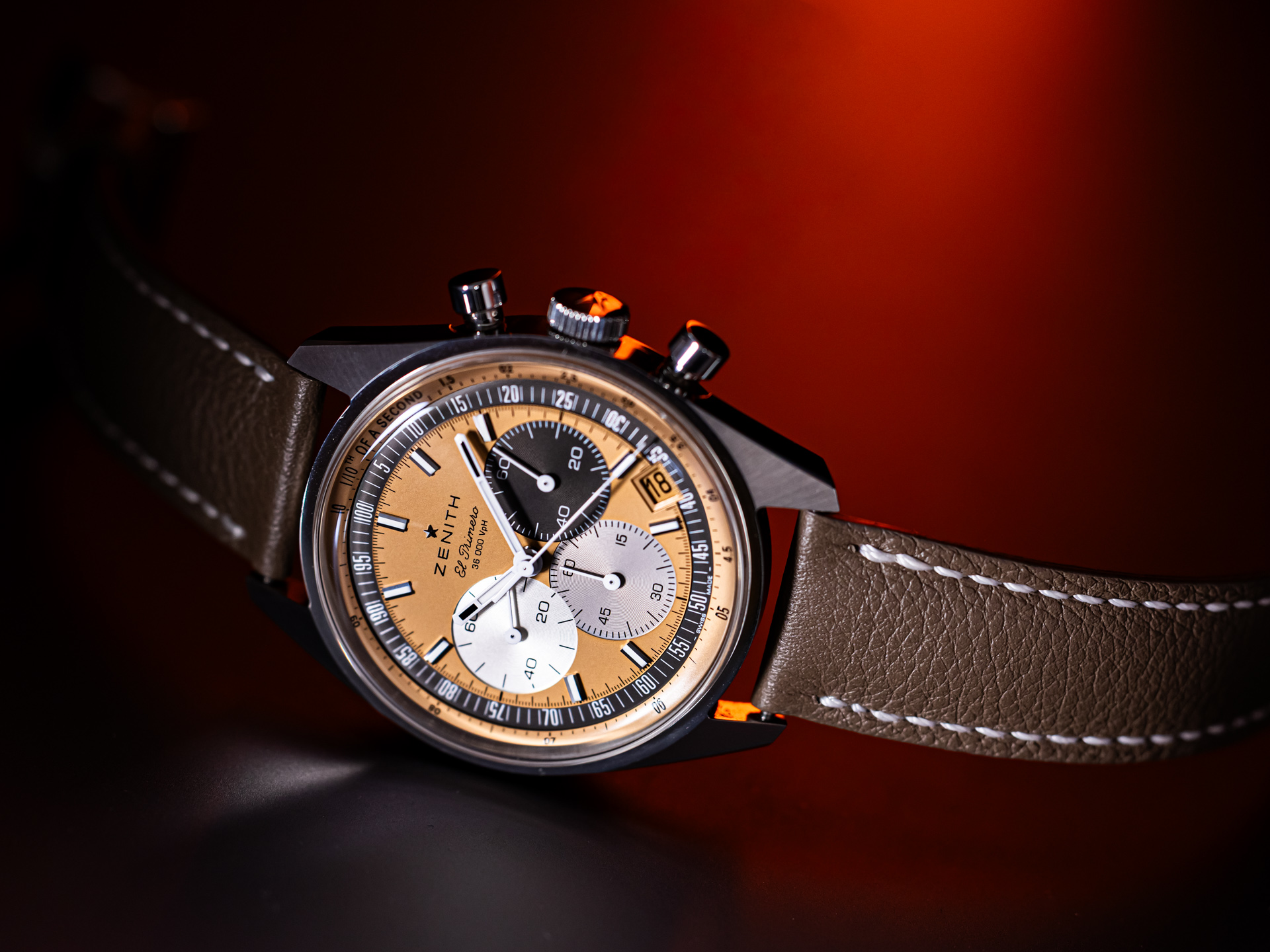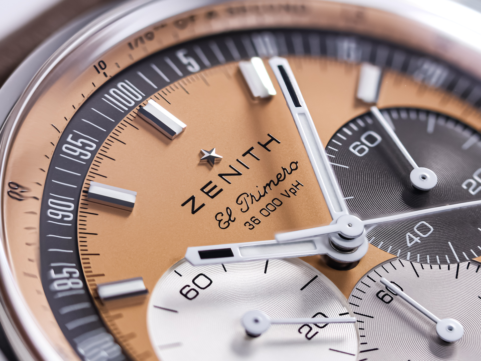 Particularly noteworthy is the elaborately designed dial, which impresses with its perfect balance of functionality and aesthetics.The dial is a unique matte salmon-colored dial with three overlapping galvanic subdials in taupe and silver tones.The clearly legible applied indices and luminous hands guarantee excellent readability day and night. The central chronograph hand completes a full rotation in just ten seconds, bringing the unique 1/10-second display of the El Primero movement to life – a technical highlight that is directly reflected on the dial.
