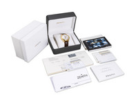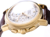 Crafted in solid 18k yellow gold, this sophisticated timepiece embodies classic luxury and horological excellence. The watch features a stunning white dial adorned with applied golden Roman numerals, offering a harmonious balance of legibility and elegance. The full calendar complication displays day, date, and month, complemented by a beautifully executed moonphase indicator—adding both functionality and poetic charm.