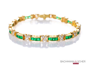 Armschmuck 750/000 Gelbgold 65 x Diamant, Brillantschliff, 0,65 ct, SI1 - G 41 x Smaragd, Careé, 1,60 ct 18 cm