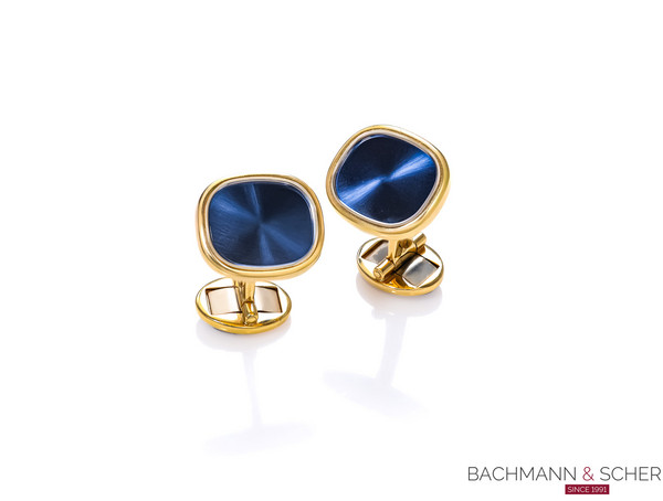 The cufflinks are set to the front with a sunburst blue accent center with a polished yellow gold surround.