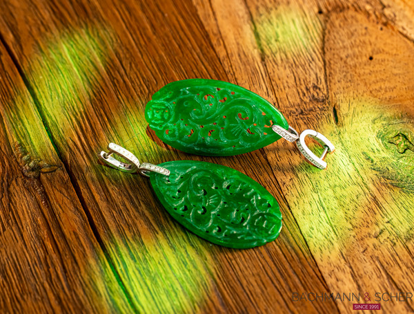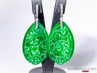 Striking carved jade earrings accented with sparkling diamonds of 0,255ct VS1-F.