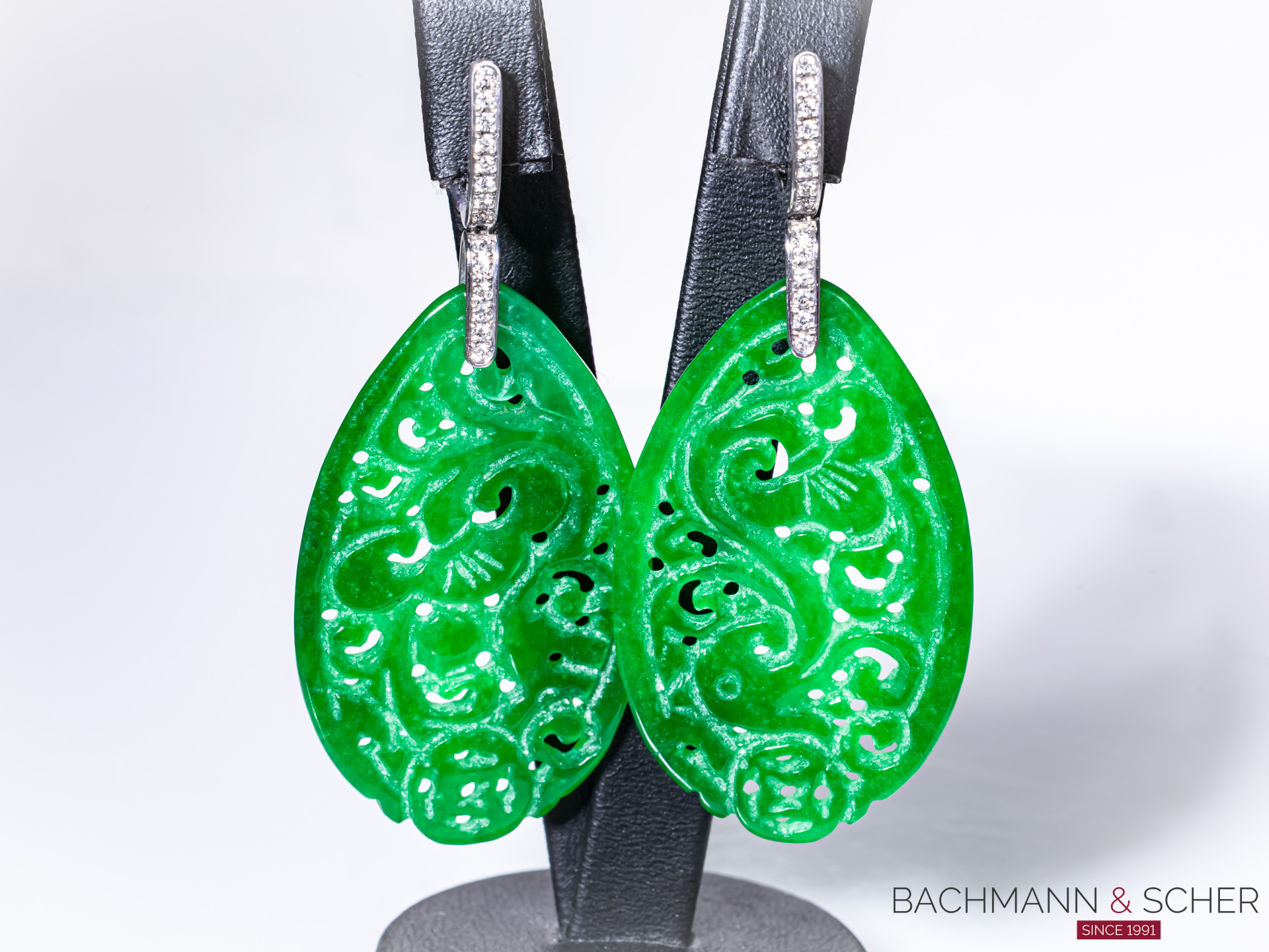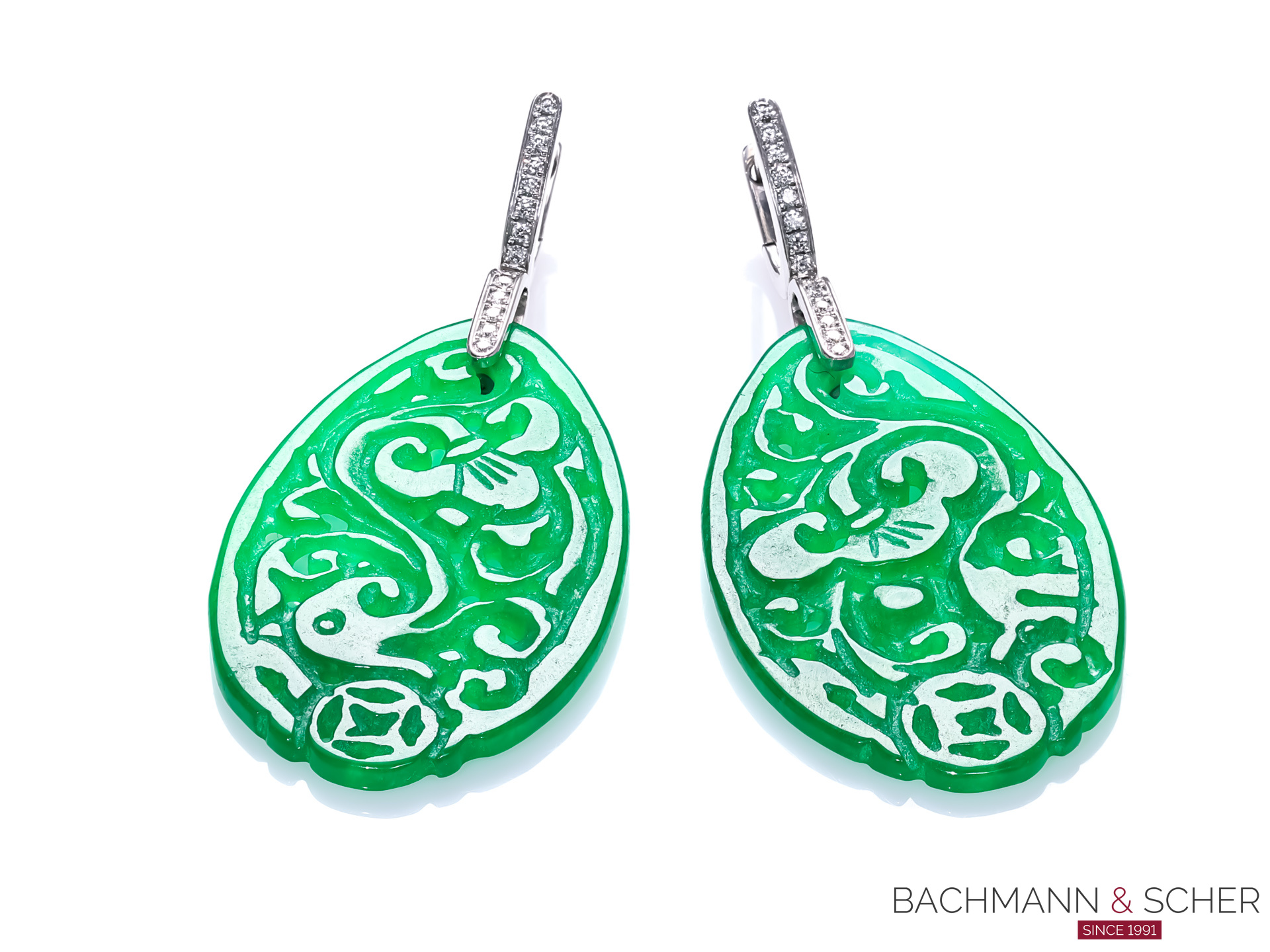 Bachmann & Scher is deligthed to offer you a pair of pending earrings jade in 18k white gold.