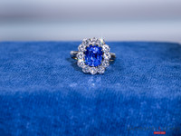A timeless piece of elegance featuring a nice 2,20 ct blue oval-cushion sapphire, surrounded by 1,30 ct brilliant-cut diamonds