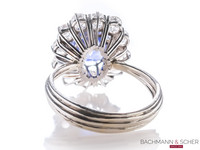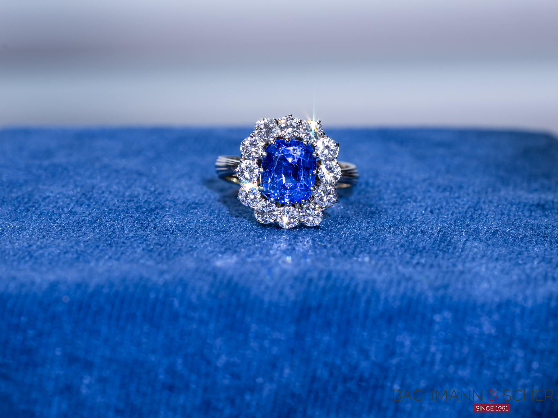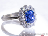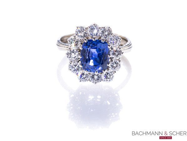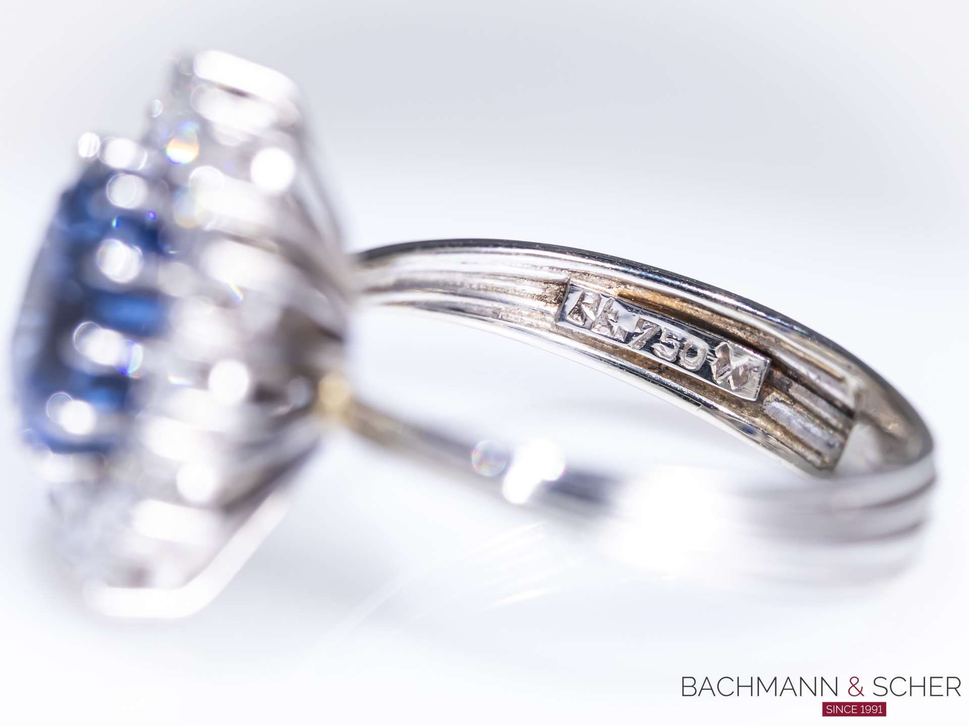 Bachmann & Scher are deligthed to offer you a ring 18k white gold with blue sapphire and diamonds.
