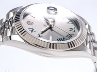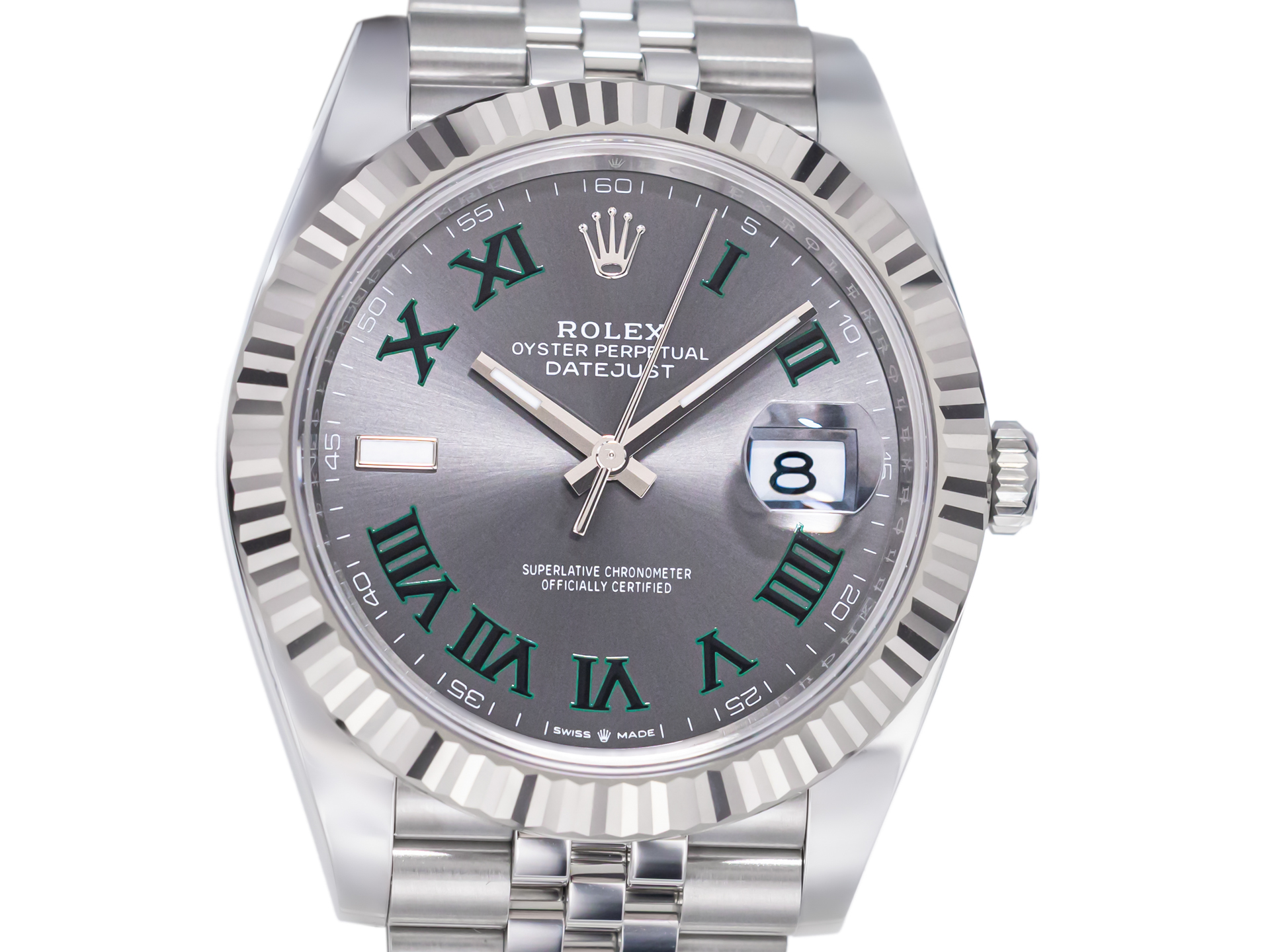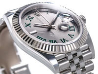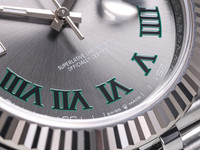 The distinctive “Wimbledon” dial features a slate grey sunburst finish accented by green Roman numerals, a design widely appreciated by collectors for its unique and sporty character. The signature date display at 3 o’clock with Cyclops magnification ensures excellent legibility while preserving the classic Rolex aesthetic.